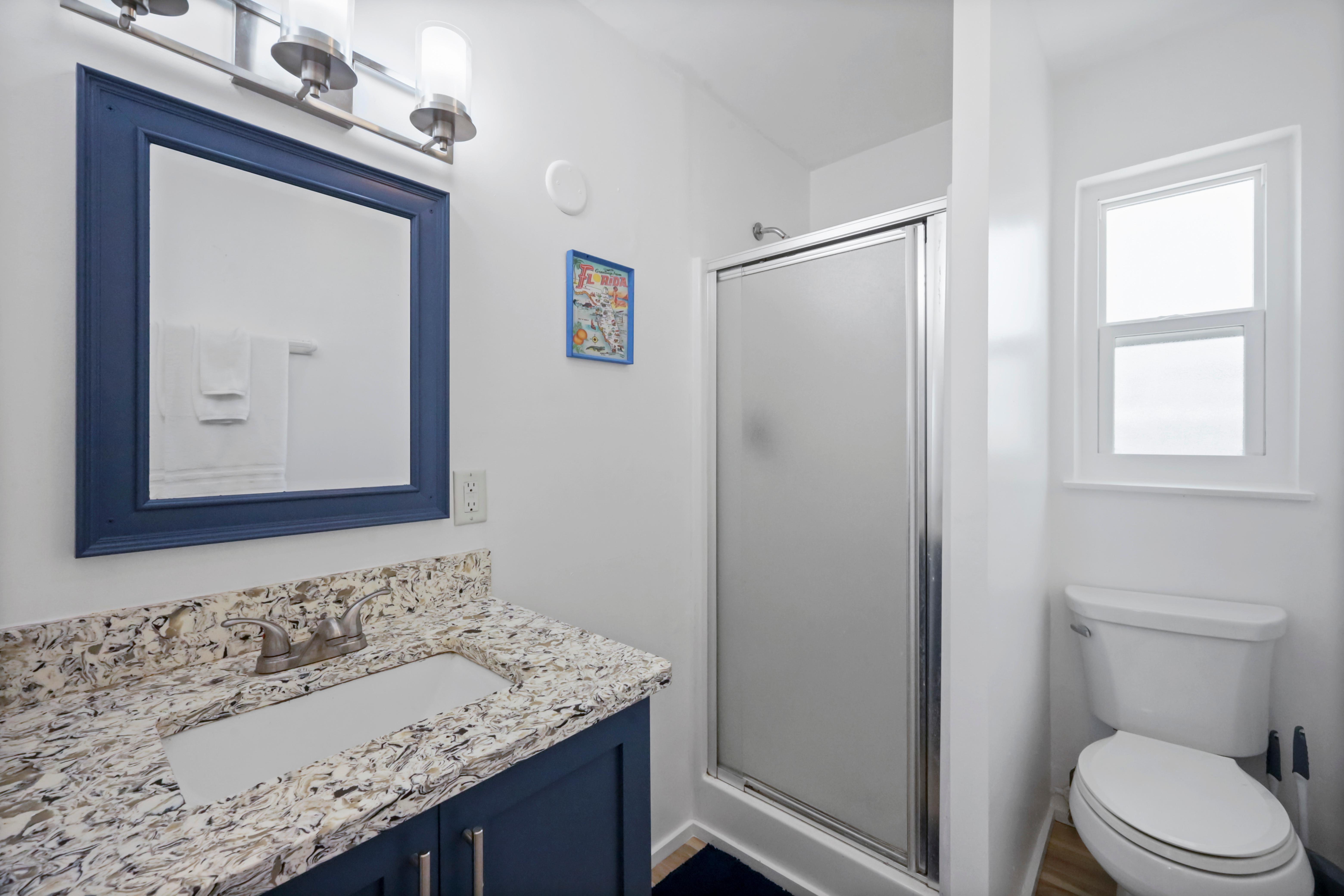 The bathroom includes a glass-enclosed shower and beachy accents, completing this well-appointed space.