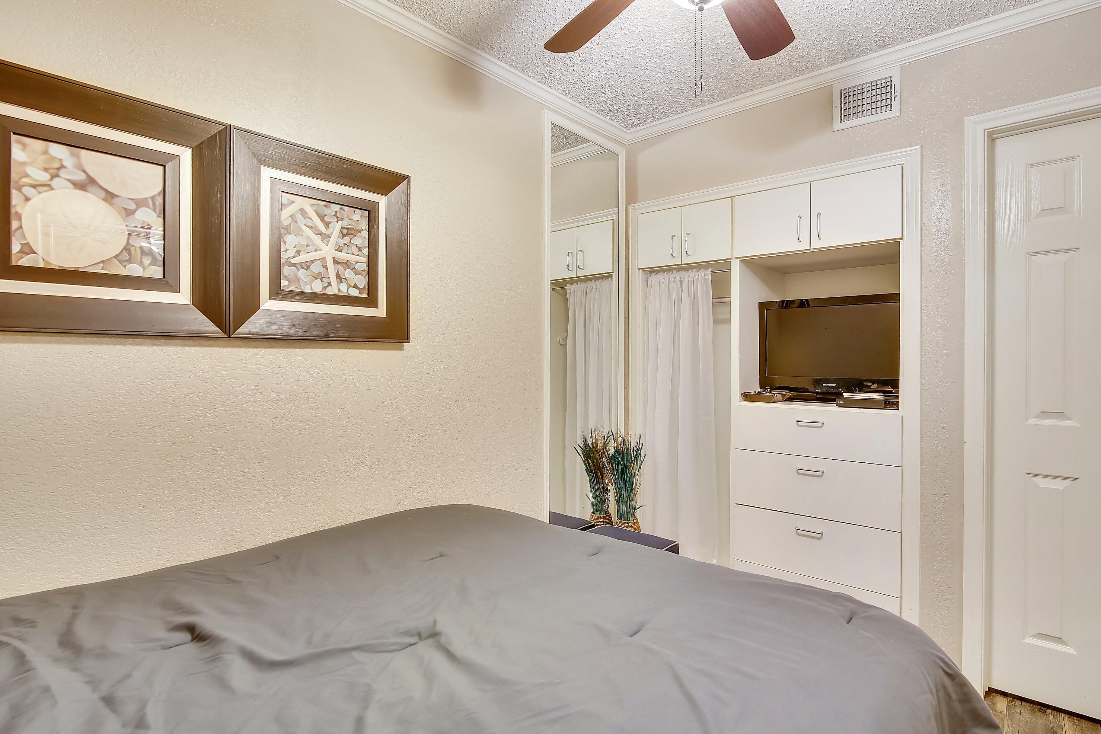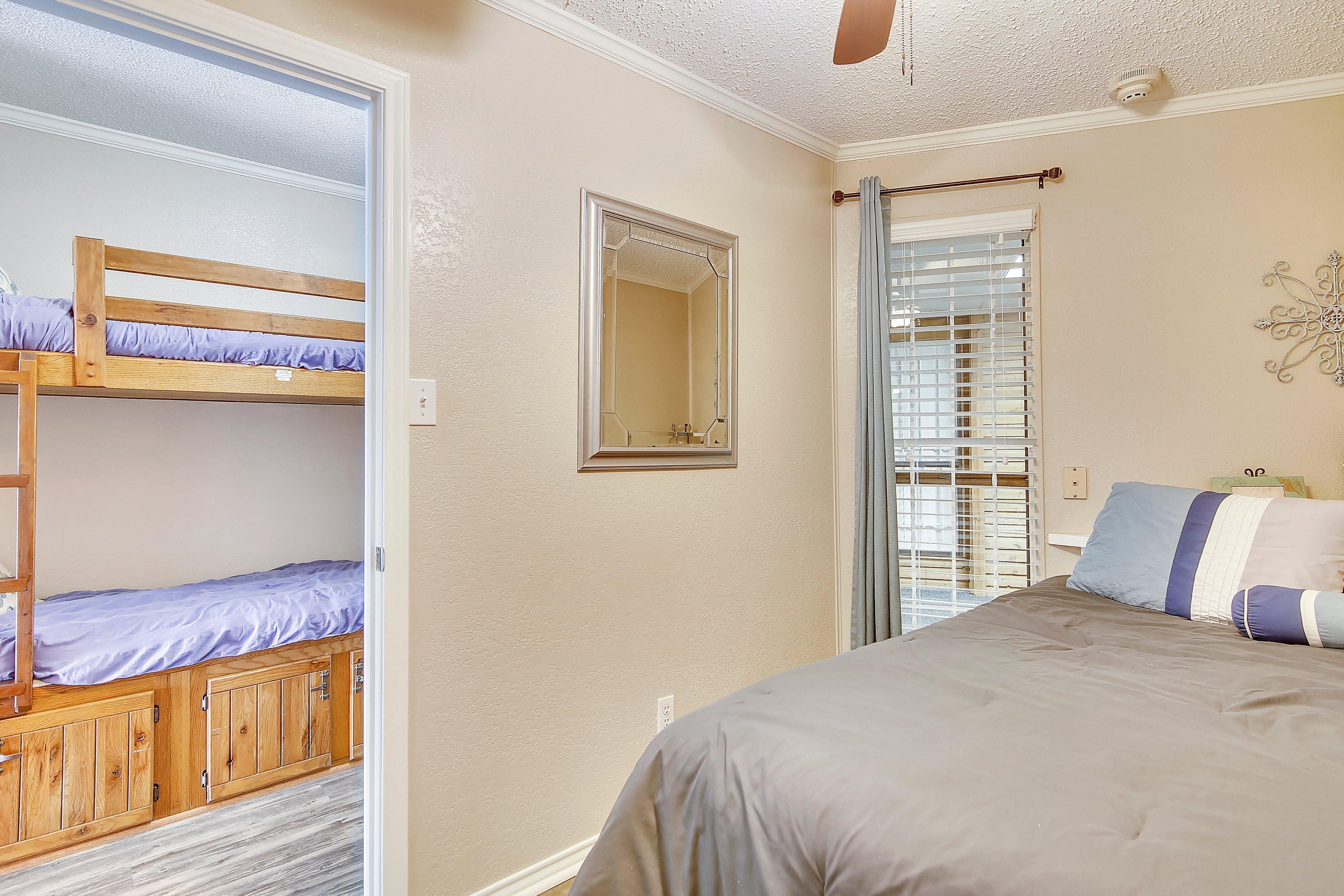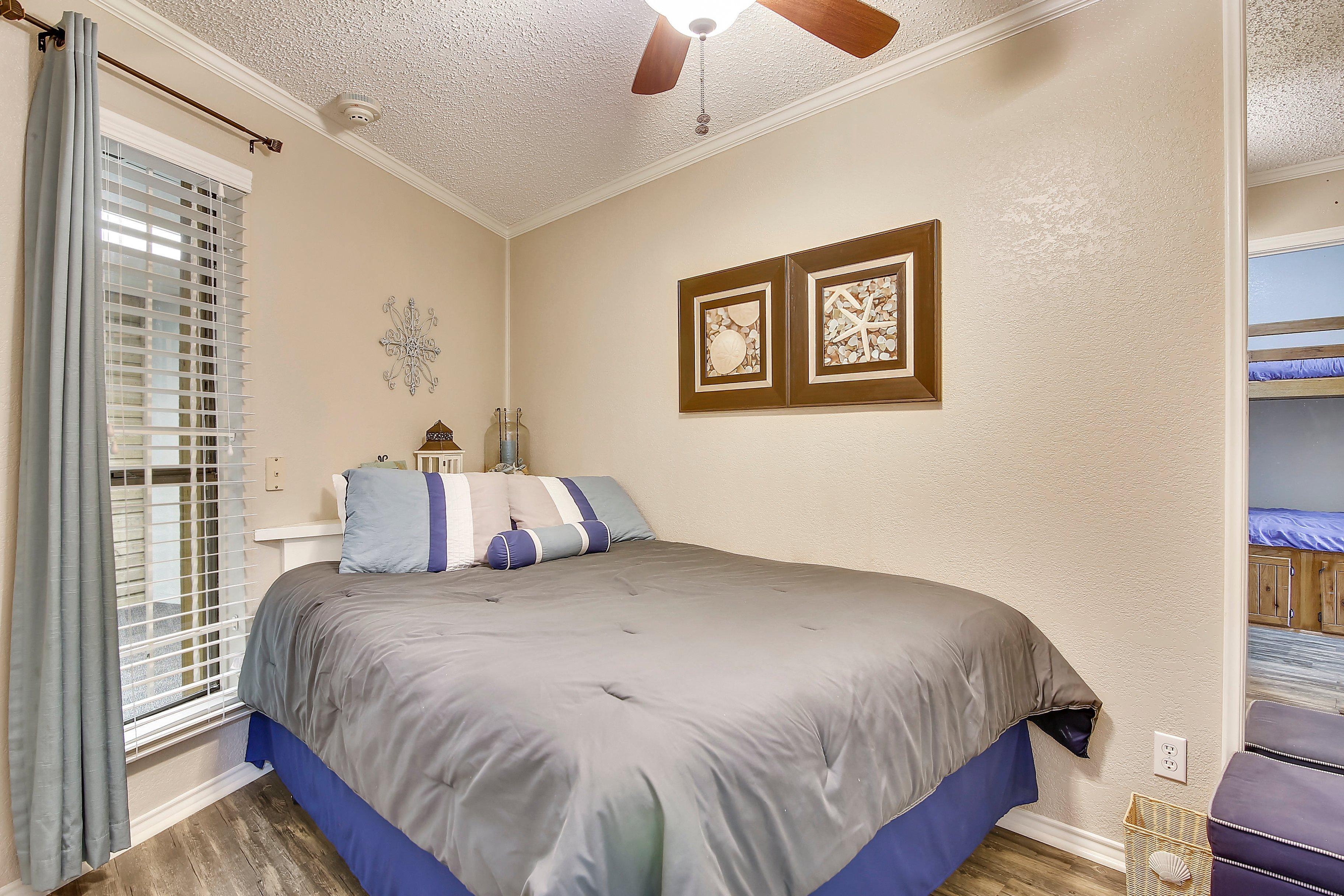 The master bedroom features a queen bed, ceiling fan, and a large flat screen tv as well. Just outside in the hall alcove area, you'll find sleeping for the young ones in the Jr size twin bunks. Open the sliding door to the balcony and enjoy the morning sunrise -and fresh sea breeze of Galveston Island! Let the sound of the Gulf waves lull you to sleep.
