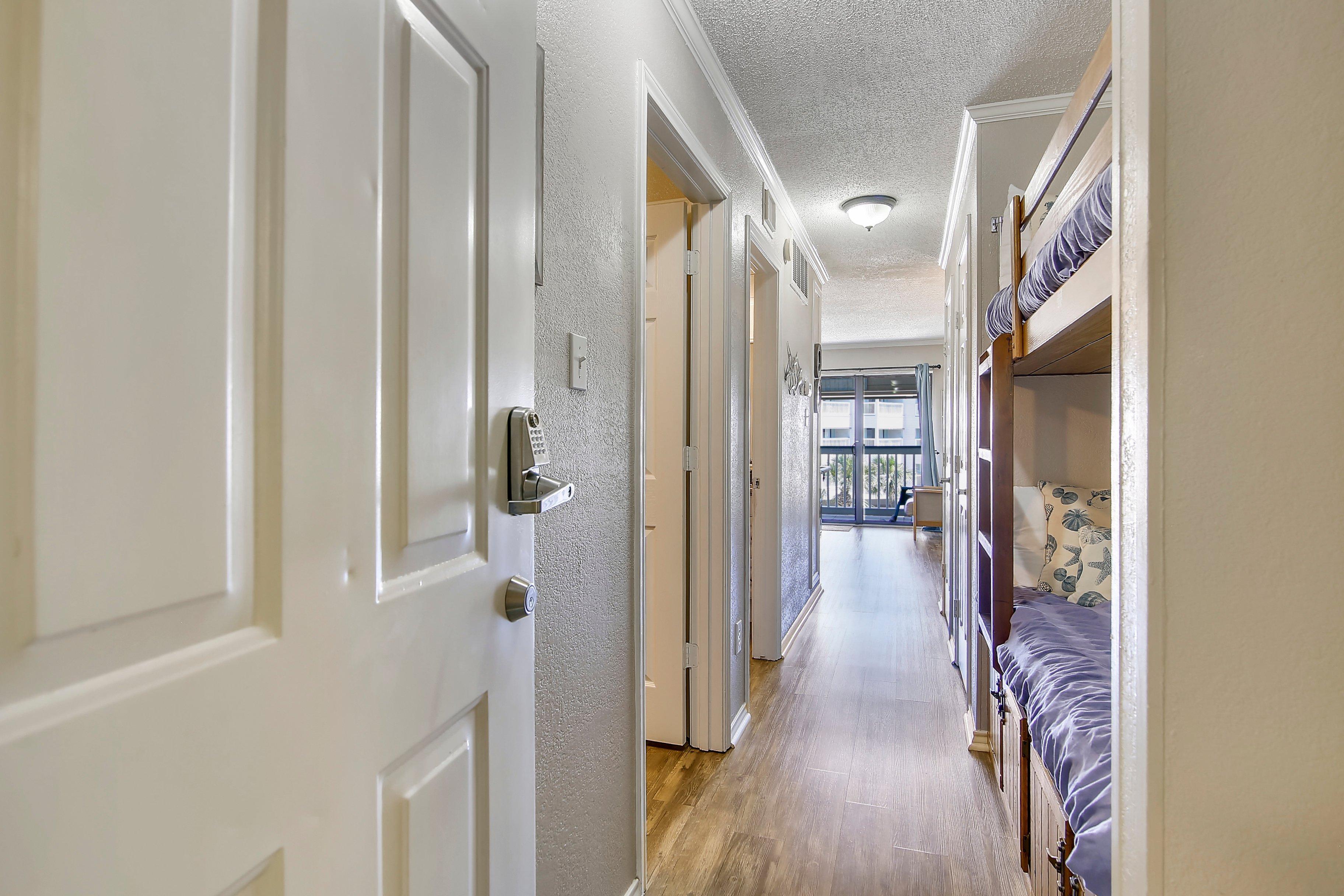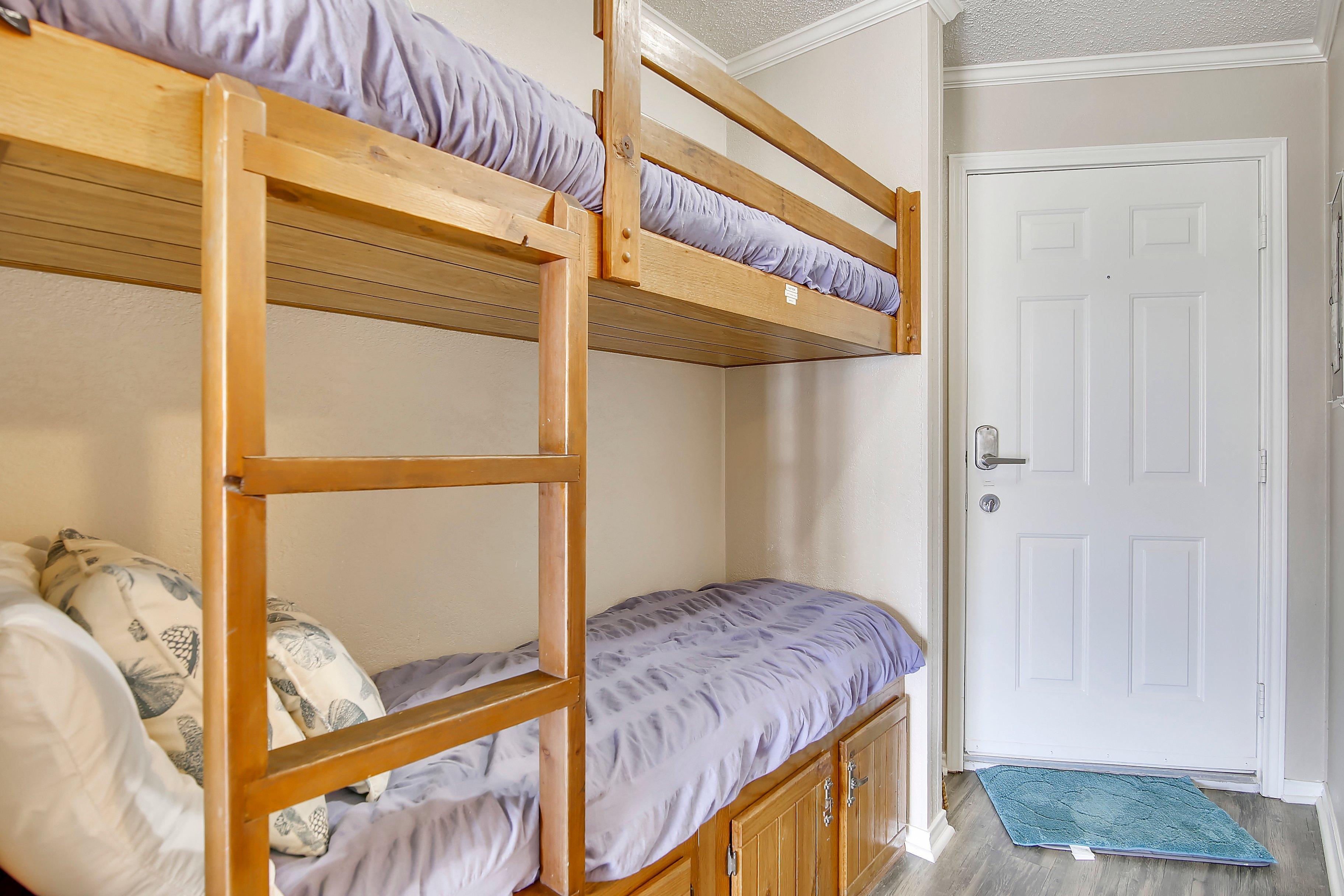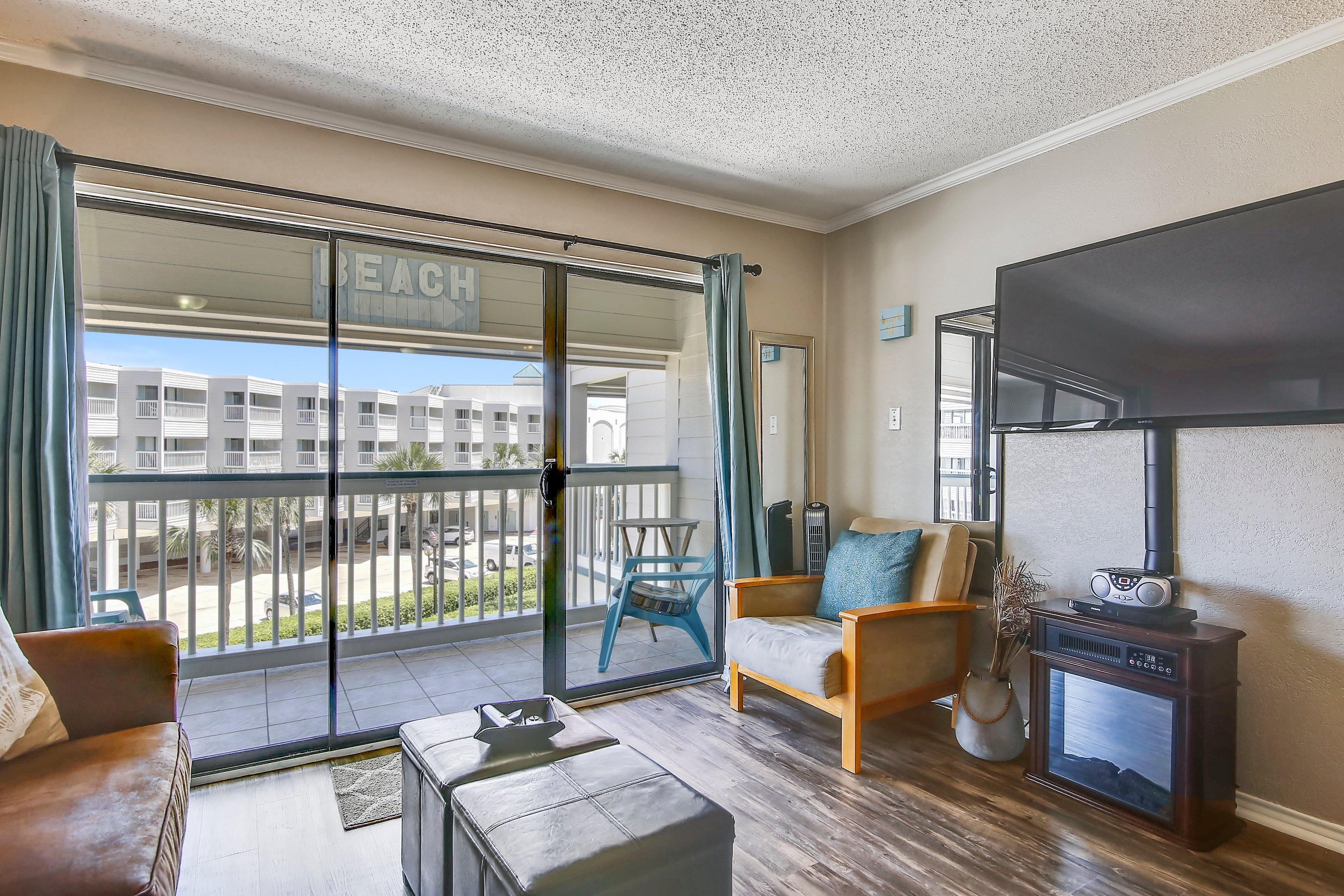 The master bedroom features a queen bed, ceiling fan, and a large flat screen tv as well. Just outside in the hall alcove area, you'll find sleeping for the young ones in the Jr size twin bunks. Open the sliding door to the balcony and enjoy the morning sunrise -and fresh sea breeze of Galveston Island! Let the sound of the Gulf waves lull you to sleep.