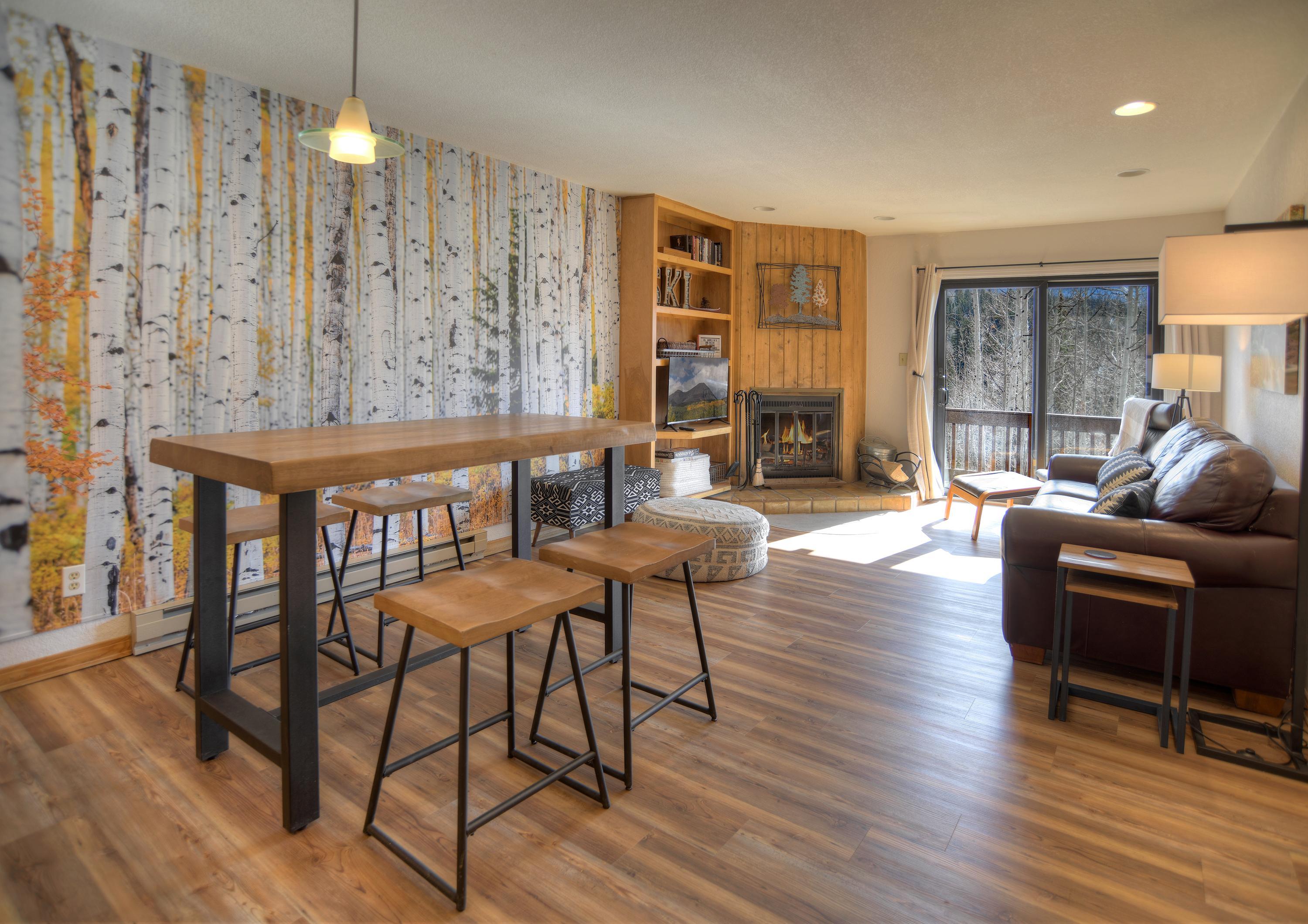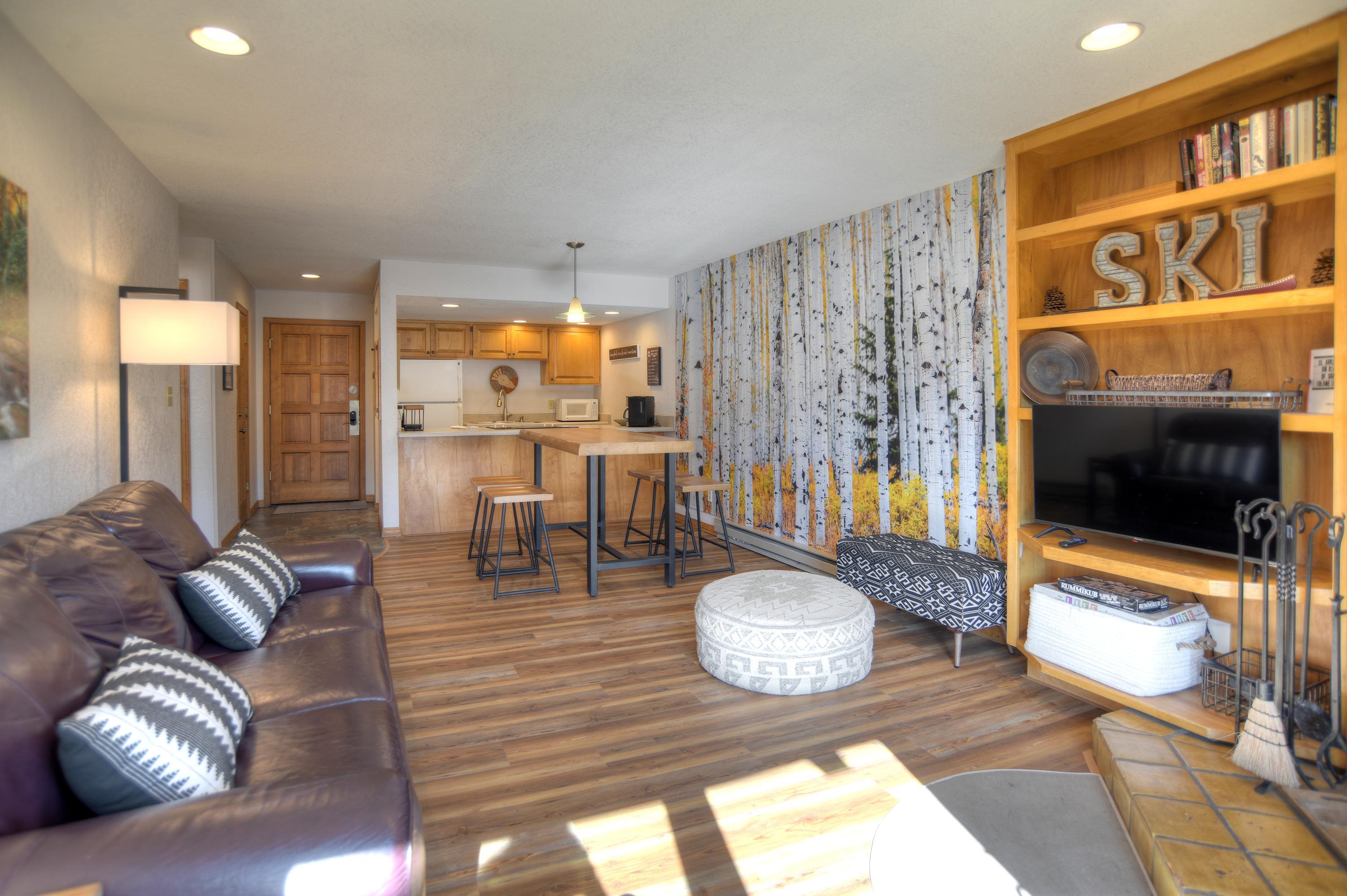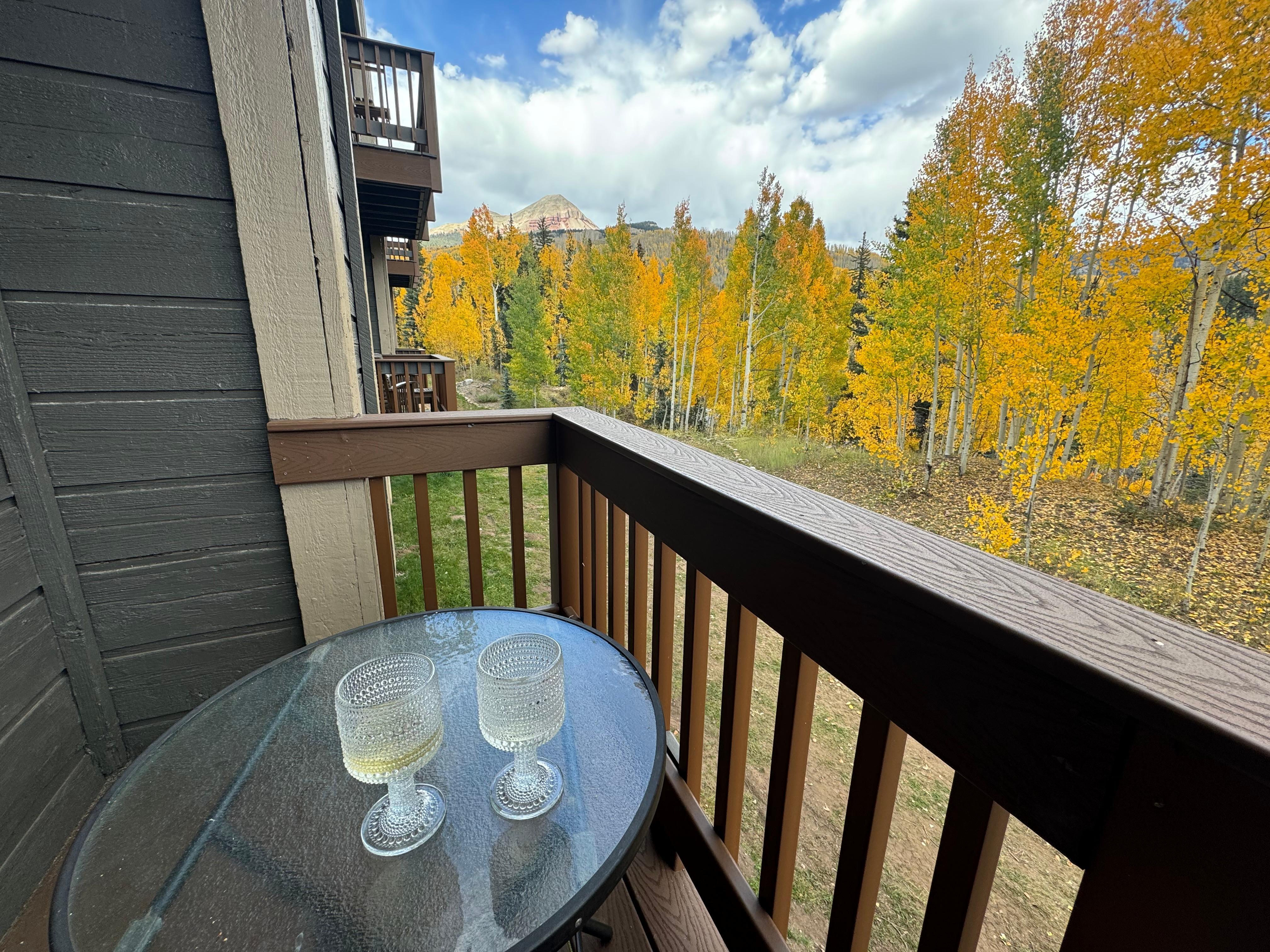 The condo is fully furnished and offers all the comforts of home. This getaway features an open floor plan, full kitchen, fireplace, and deck with stunning views of aspens and mountains—perfect for taking in the sunrise and sunset each day. This place is the perfect location to snuggle up with a book, hike in the nearby national forest, or come home to a warm crockpot of chili after a day on the slopes.