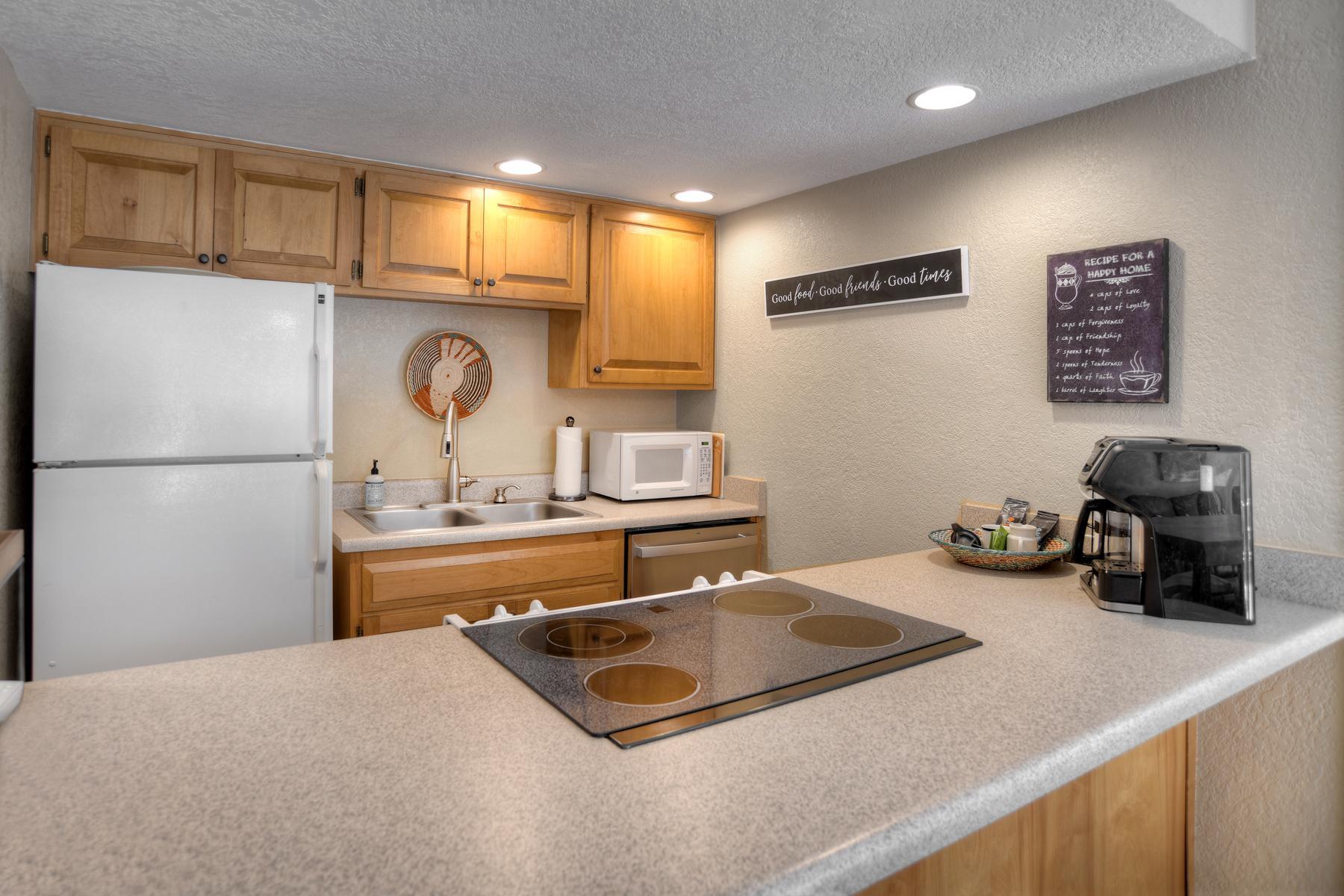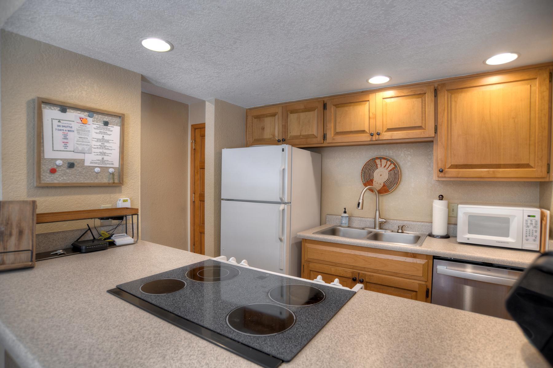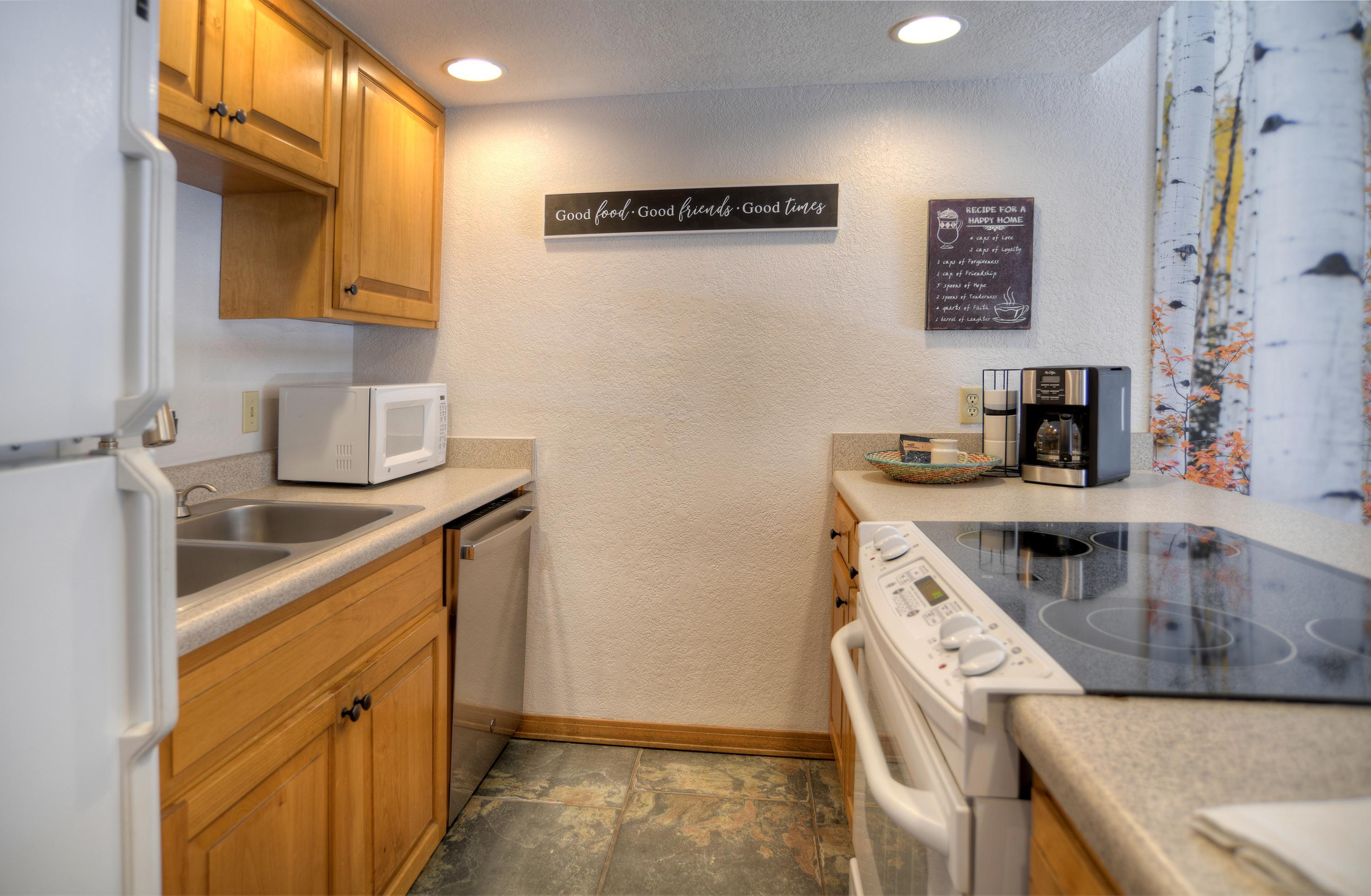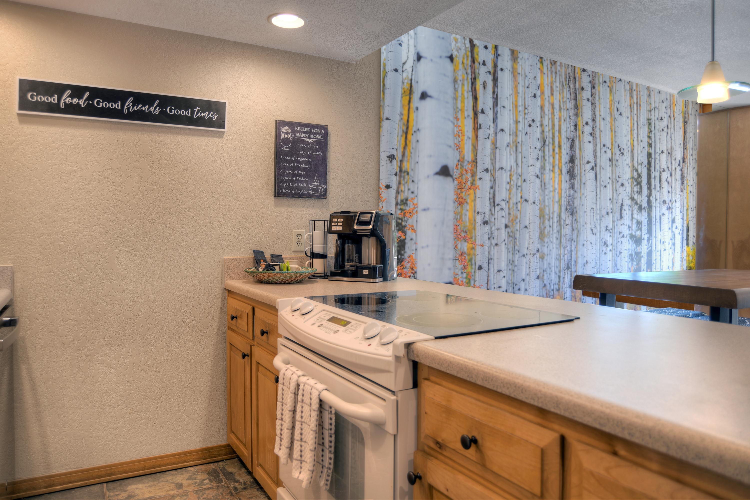 The condo is fully furnished and offers all the comforts of home. This getaway features an open floor plan, full kitchen, fireplace, and deck with stunning views of aspens and mountains—perfect for taking in the sunrise and sunset each day. This place is the perfect location to snuggle up with a book, hike in the nearby national forest, or come home to a warm crockpot of chili after a day on the slopes.