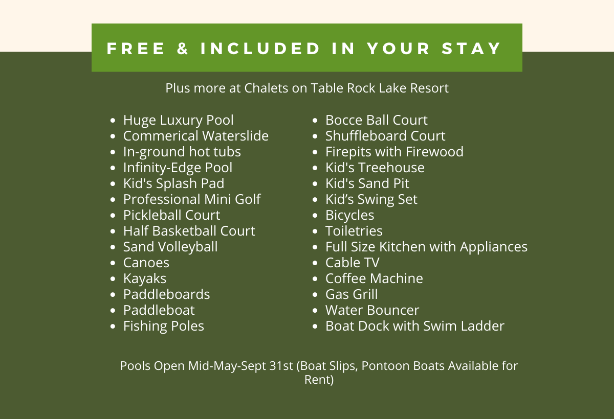 Get ready for an unforgettable escape at Chalets on Table Rock Lake – one of the area's top luxury lakefront family resorts! Part of the Faria Resorts brand, this premier destination delivers first-class accommodations and endless free amenities to keep the fun going from sunrise to sunset. Set on 11 gorgeous lakefront acres, every home features sweeping views of beautiful Table Rock Lake – the perfect backdrop for memory-making with family and friends.