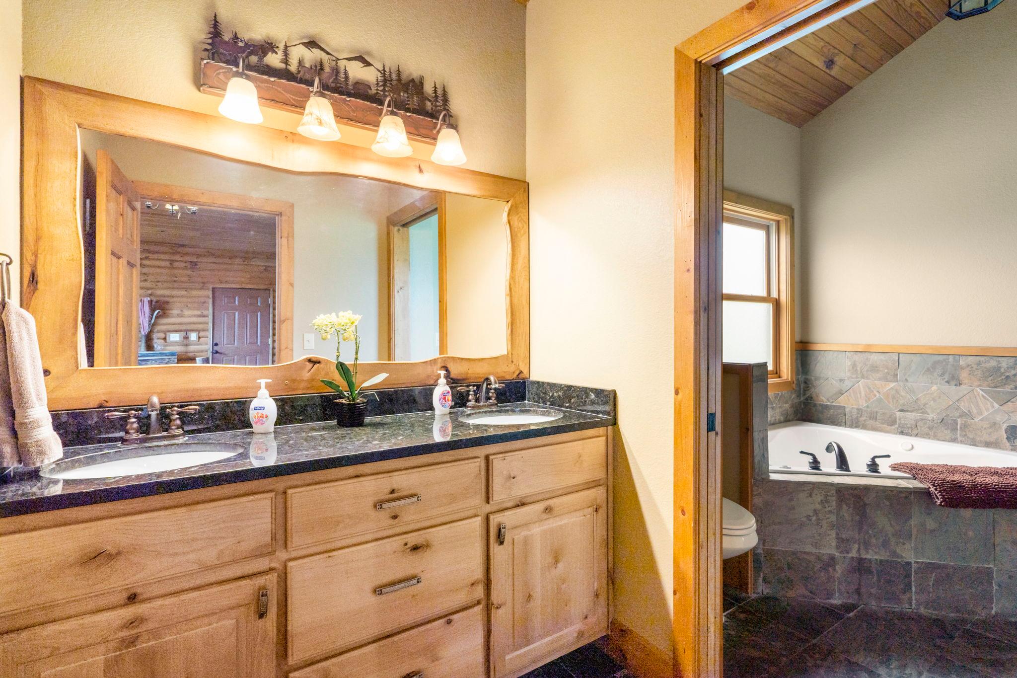 Another vaulted pine tongue-and-groove ceiling with wood beams showcases the King Master Suite, which makes up the entire upper level. You'll find complete comfort in the Serta presidential suite mattress, a luxury bathroom with a tiled shower, dual vanity sinks and a corner tub.