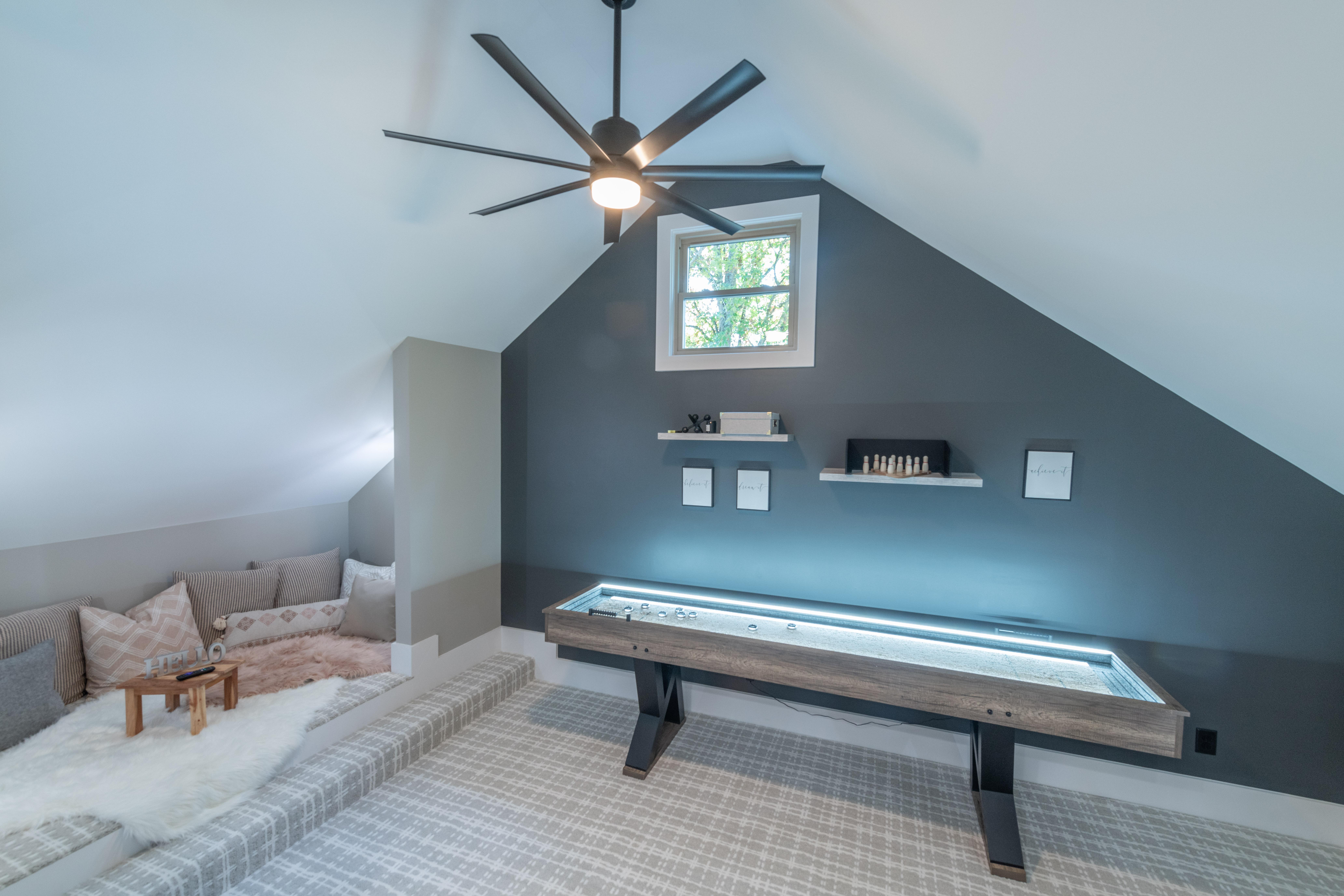 Upper level bunk room with 4 bunks (8 beds total) with ensuite bathroom, shuffleboard, and foosball