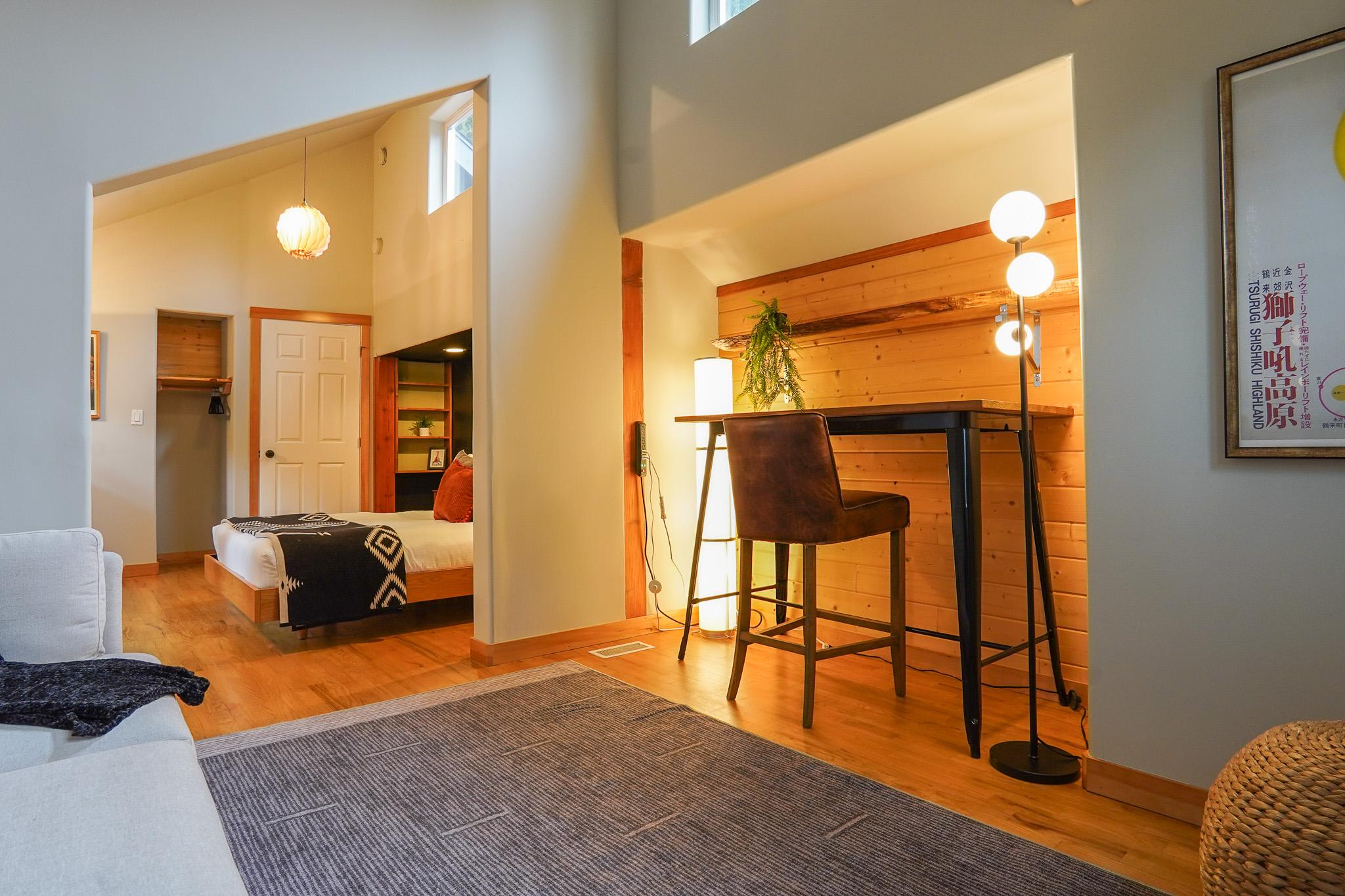 The second story hosts a Queen bedroom featuring a sitting room with work space.