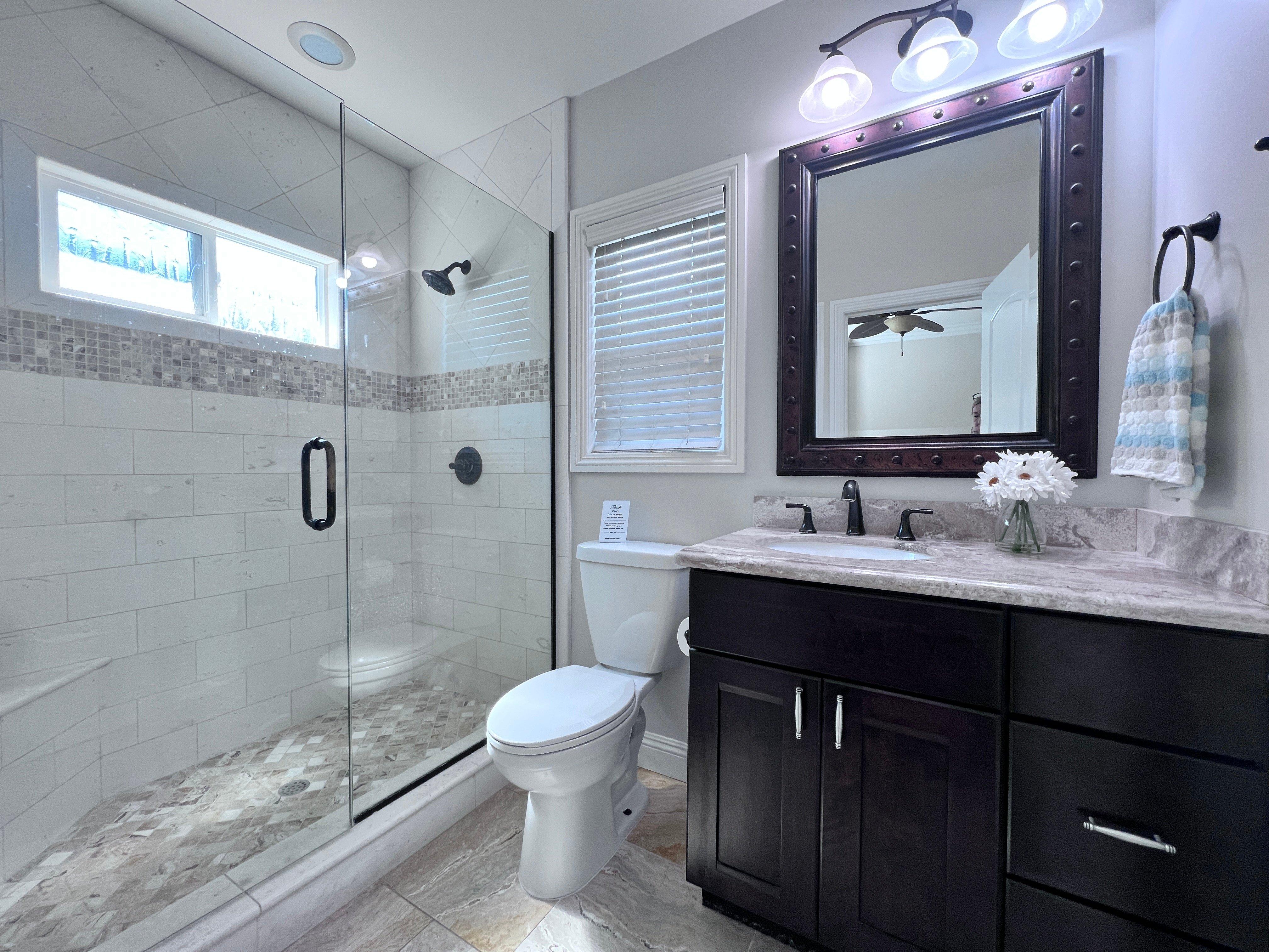 Four of the five bedrooms have upgraded carpet. The rest of the home has hardwood laminate flooring and tile throughout. Open-concept kitchen with a dining room and living room. Upgraded kitchen with granite countertops and stainless steel appliances: stove/oven, refrigerator, microwave, and dishwasher. The dining room has seating for six, with additional seating at the countertop and the living room. Brand new (Apr 2023) sectional sofa with sleeper. A full-size washer and dryer located off of the kitchen. The bedding in our home is from Pottery Barn or of equivalent quality.