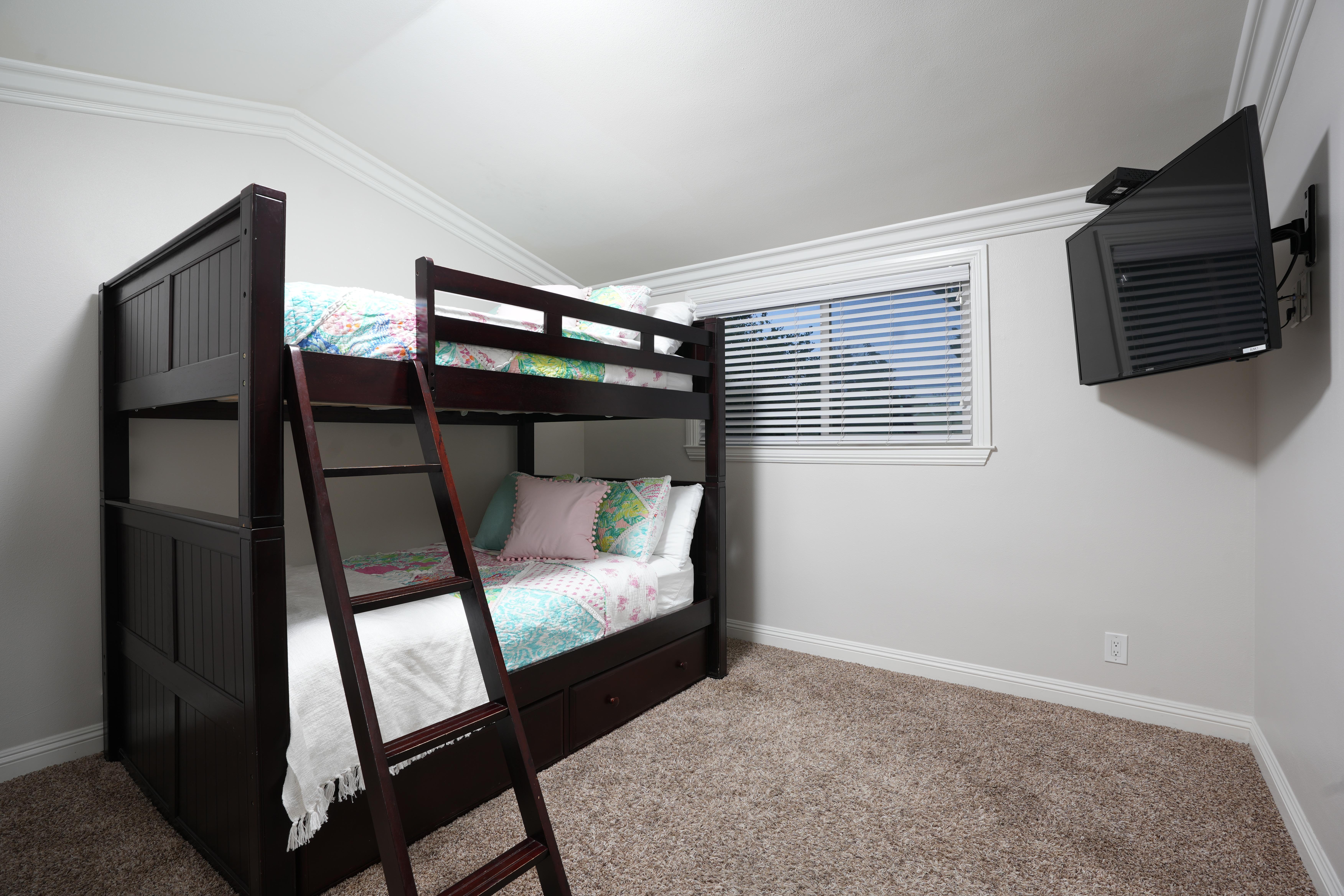 The house includes three master suites and two children's bedrooms with full over full bunk beds. On the main floor, there's a cal-king master bedroom with an ensuite, another cal-king master bedroom, and a children's bunk bedroom. The cal-king master and the bunk bedroom share the main floor hallway bathroom. There's another master bedroom with direct access to the upstairs hallway bathroom and a children's room in the loft area. The loft area also includes a full bed and sectional sofa. Each bedroom is equipped with a 43' LCD TV, and the bedding is of high quality from Pottery Barn or equivalent quality.