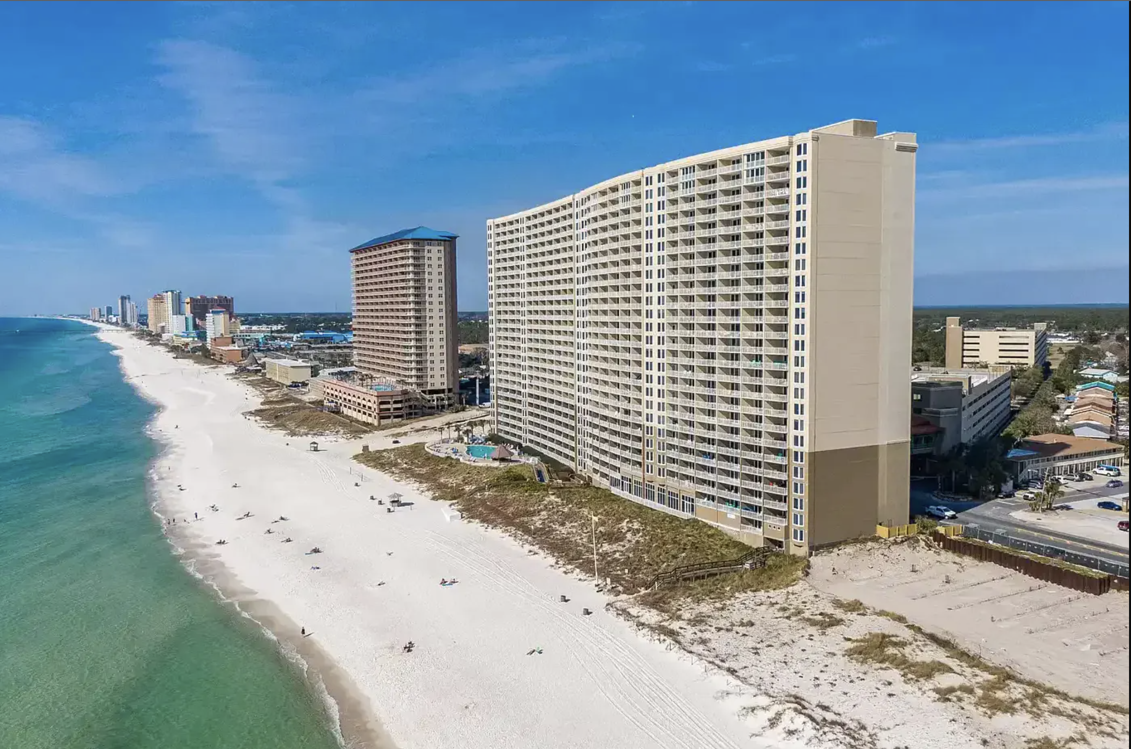 Emerald Beach Resort offers plenty of amenities and direct beach access to have the best vacation. There are also new high-speed elevators. The resort includes multiple outdoor pools, including a beachfront pool, hot tub, fitness center, game room that includes ping-pong, giant chess game, and billiards, grill area, an onsite market, and shuffleboard. The kids will love the lagoon pool that has water park features. You can have a refreshing drink at the tiki bar or have a coffee at the onsite Starbucks!