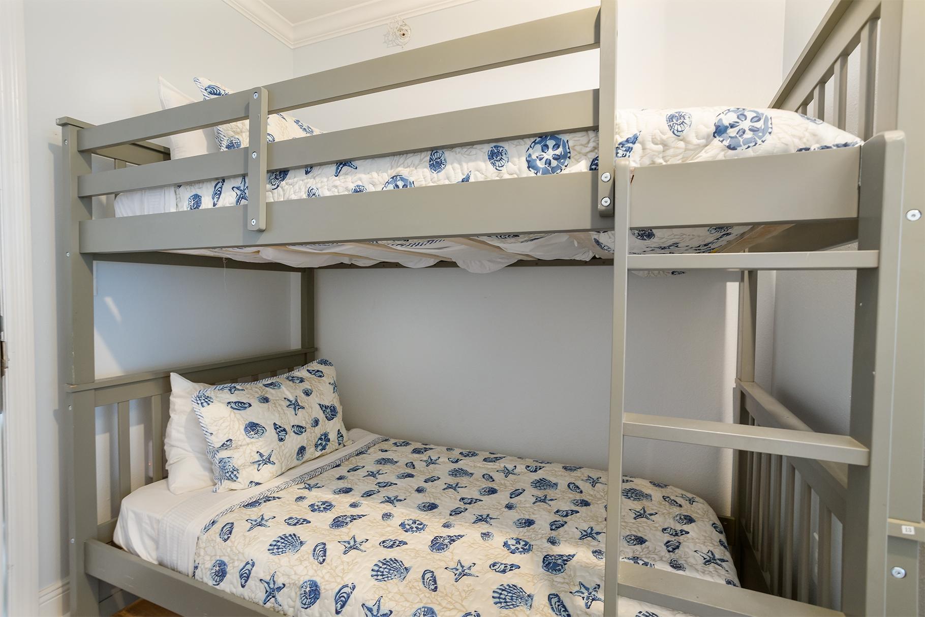 The master bedroom features a king bed, its own access to the balcony, and a large flat screen TV. The master bath has a double vanity, large walk-in shower, and a separate tub. The guest room has a queen bed and a flat screen TV. There are twin over twin bunks in the hall that share the guest bathroom. This bathroom has a single vanity and a shower tub combination.