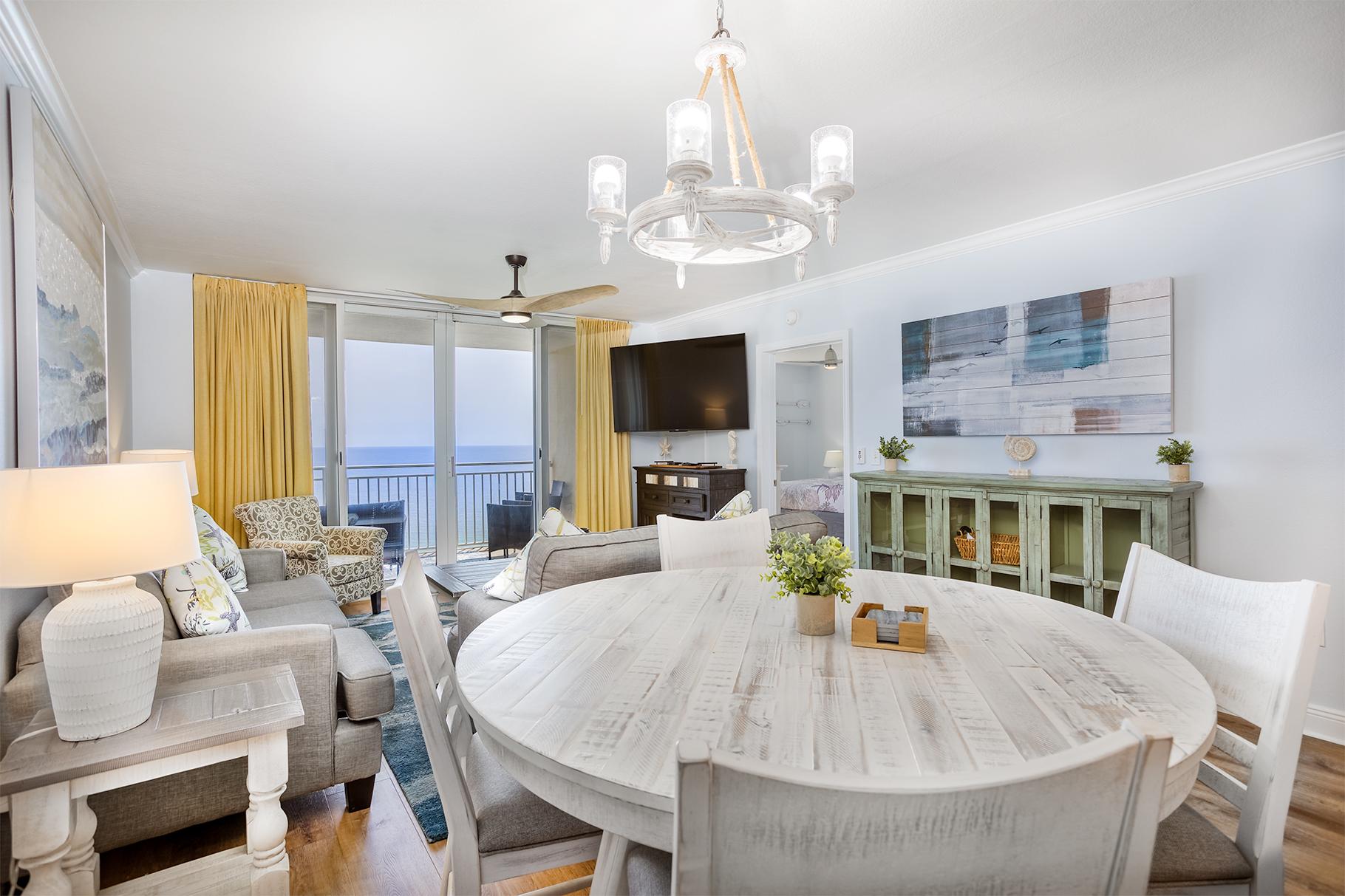 This condo had immaculate brand-new updates done the summer of 2024. Luxury vinyl plank floors are though out the entire condo. The balcony offers stunning views of the Gulf and plenty of seating. The kitchen offers all the small appliances you would ever want with stainless steel appliances and granite counters. The bar has seating for four with a dining table that also seats six. The living room has comfortable furniture with a queen sleeper sofa for extra sleeping, a sliding door to the large balcony, and a large flat screen TV.