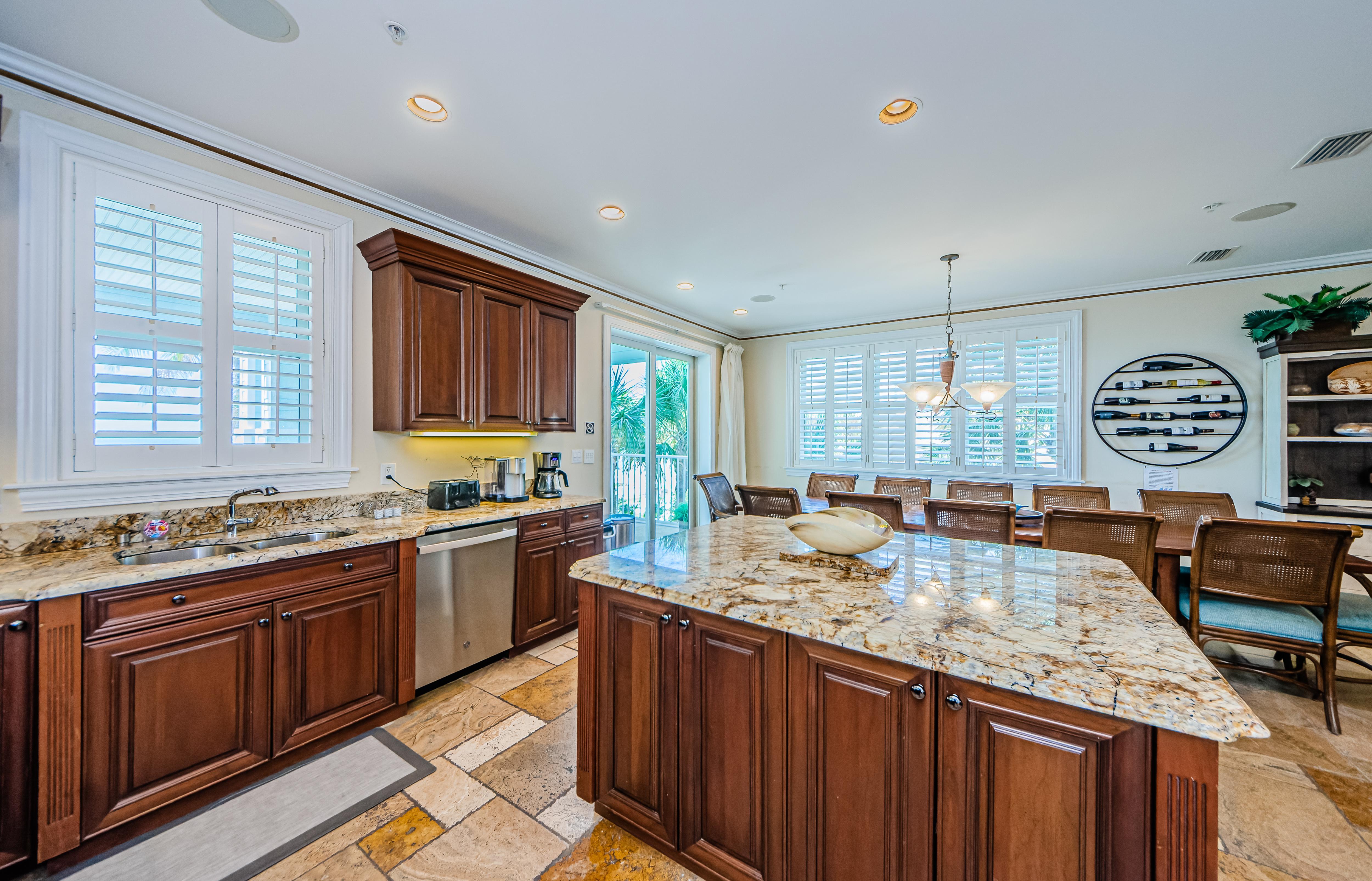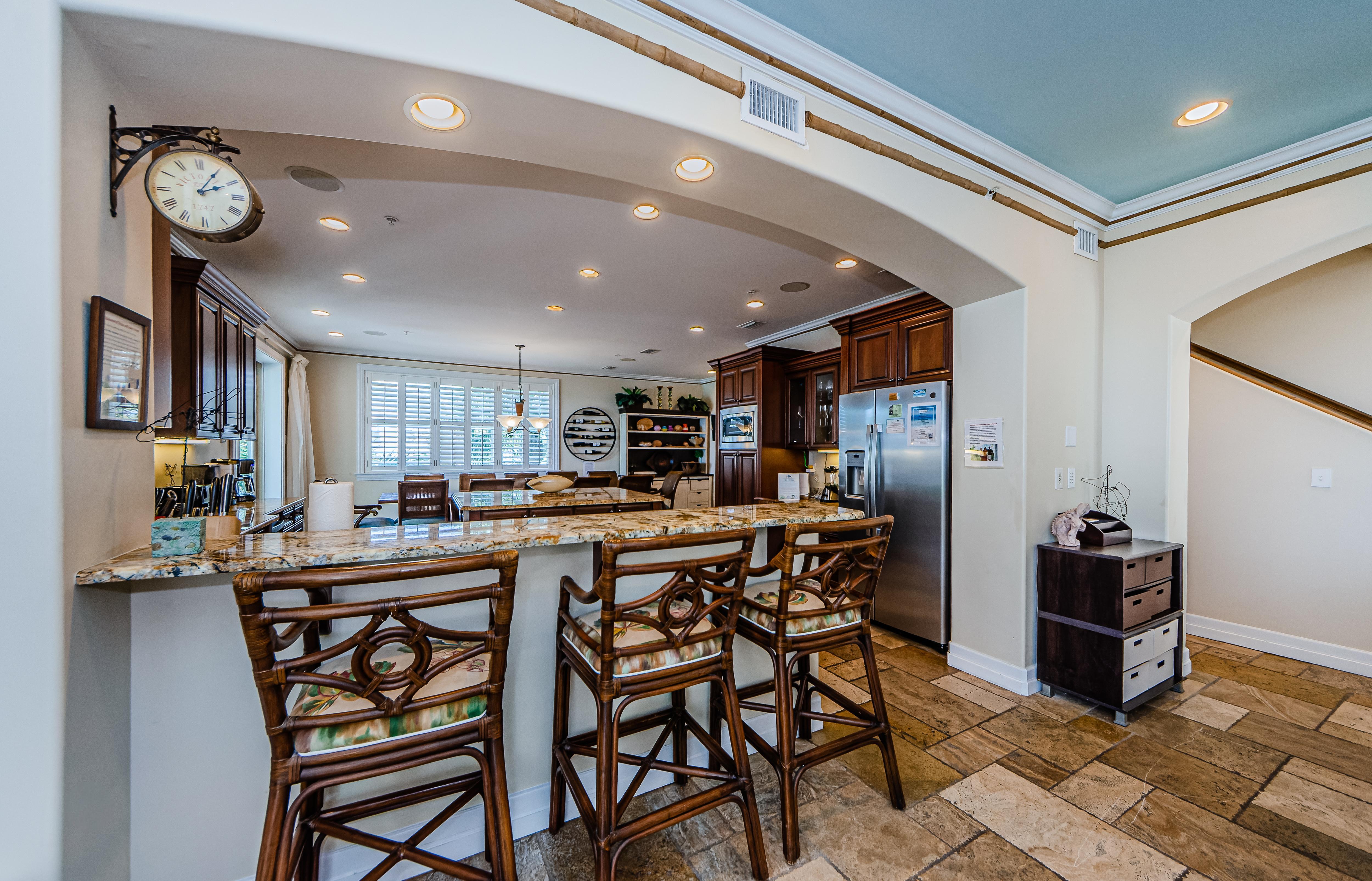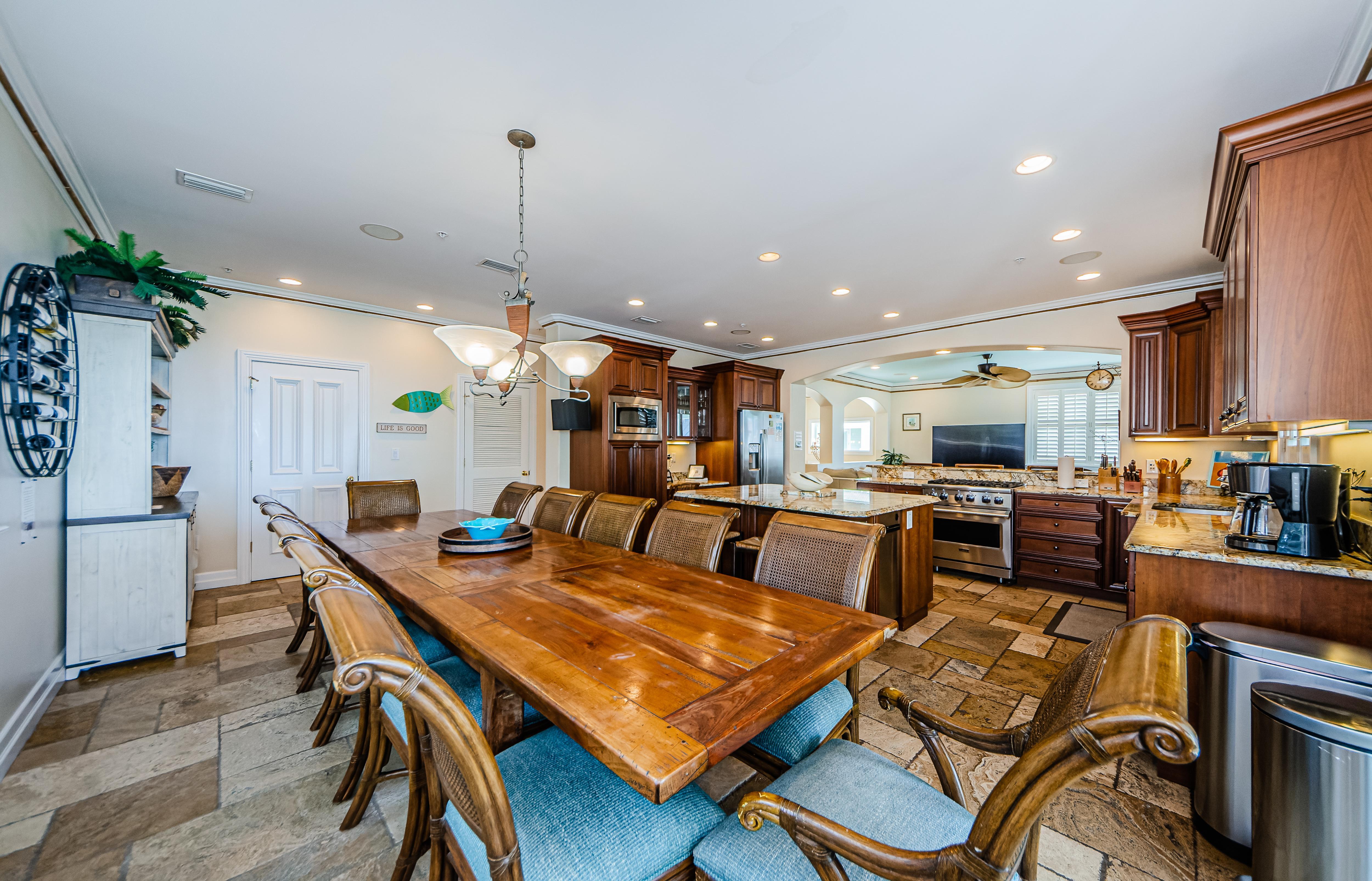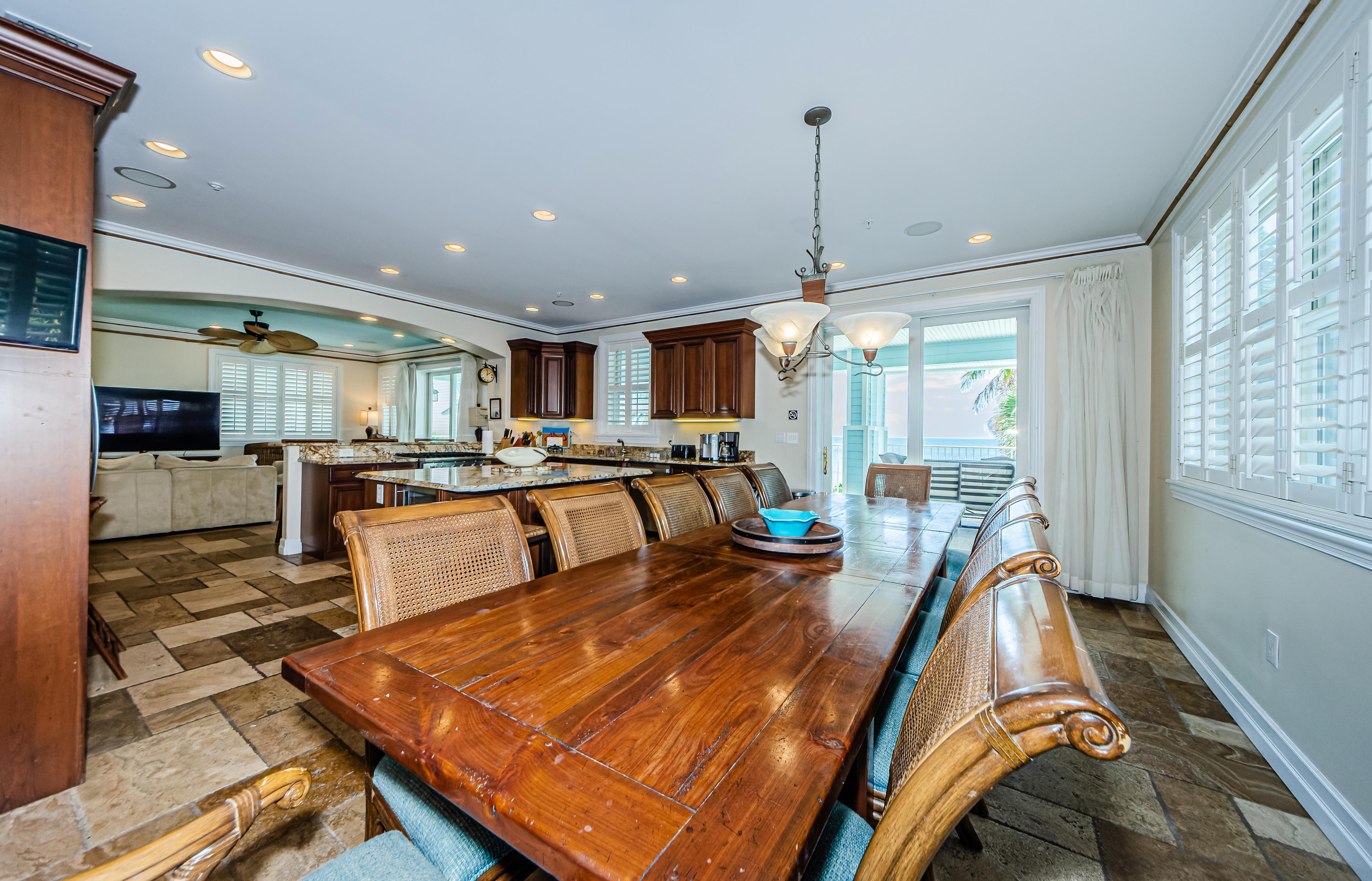 Second floor features an open floorplan with the living room, well-equipped chef's kitchen with an island, a dining table that seats 12, and a half bathroom. Sit back and enjoy your friends and family in the comfy living area, watching a 75” 4K TV. Share a meal with friends at a large teak dining table on a deep covered deck. A spiral staircase leads to the pool area.