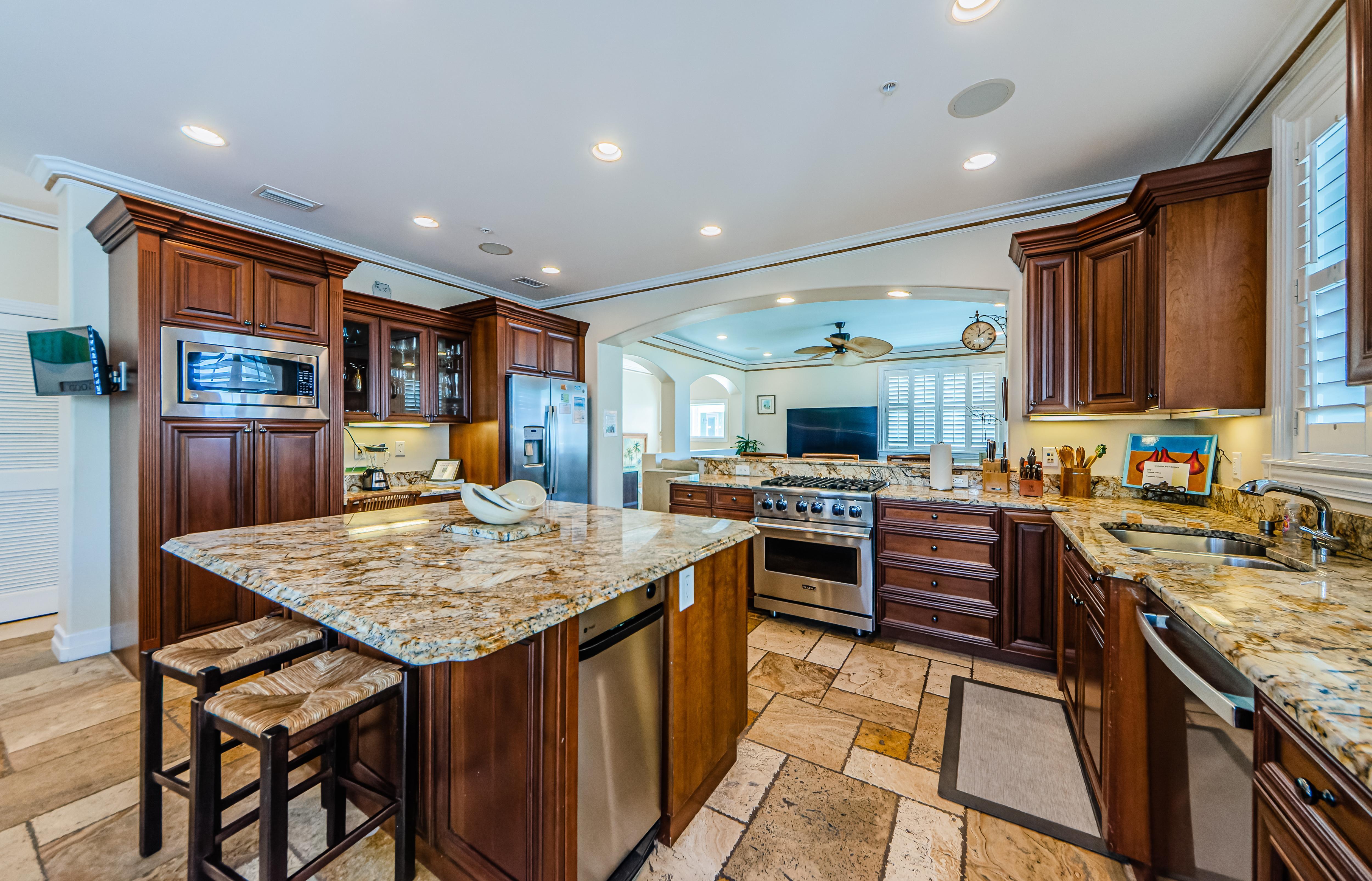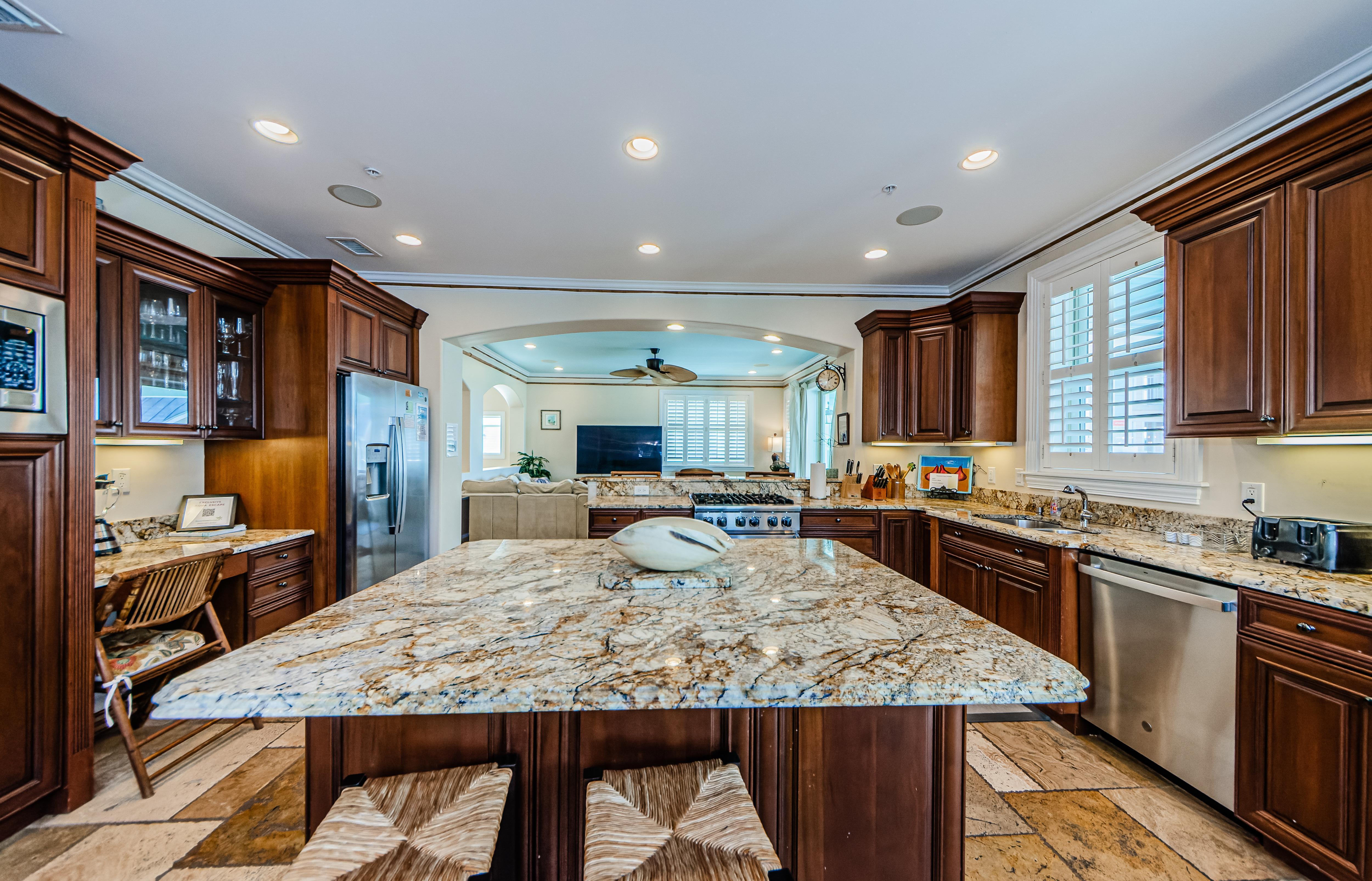 Amenities include high-speed Wi-Fi; washer, dryer, utility sink; an outdoor grill; 2-car garage; and extra refrigerator in the garage.
