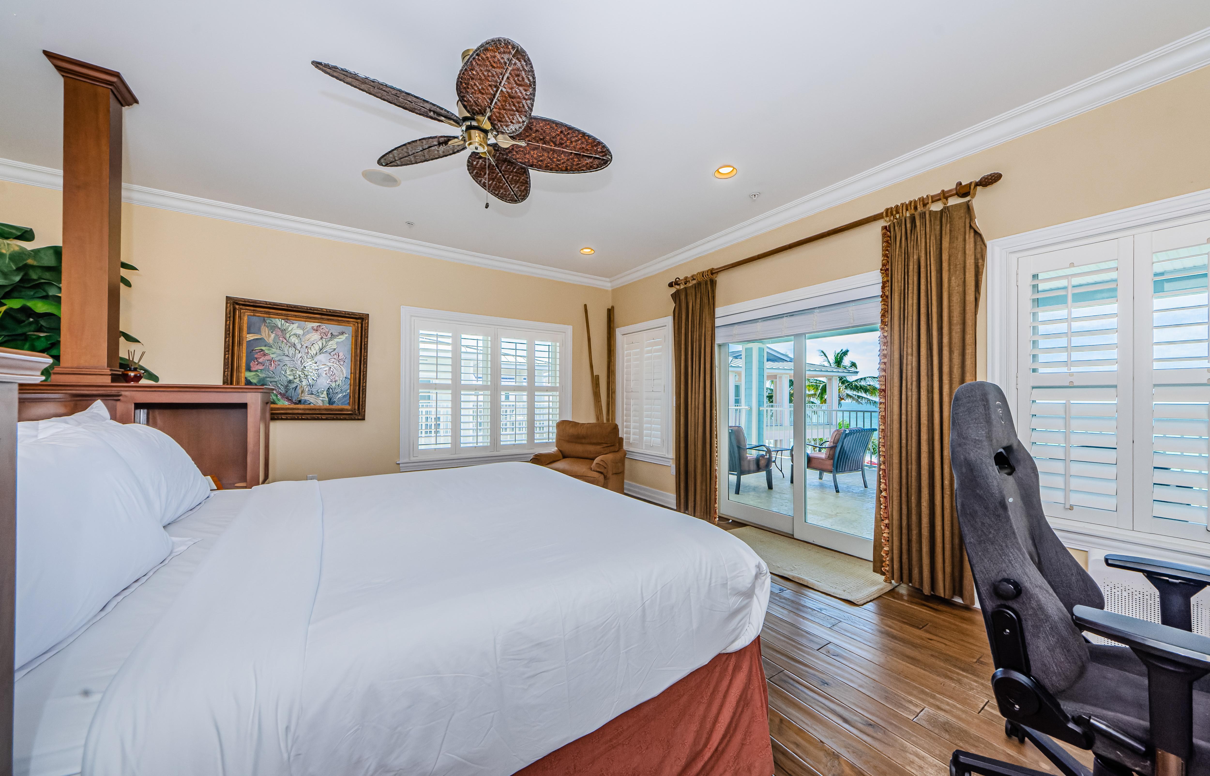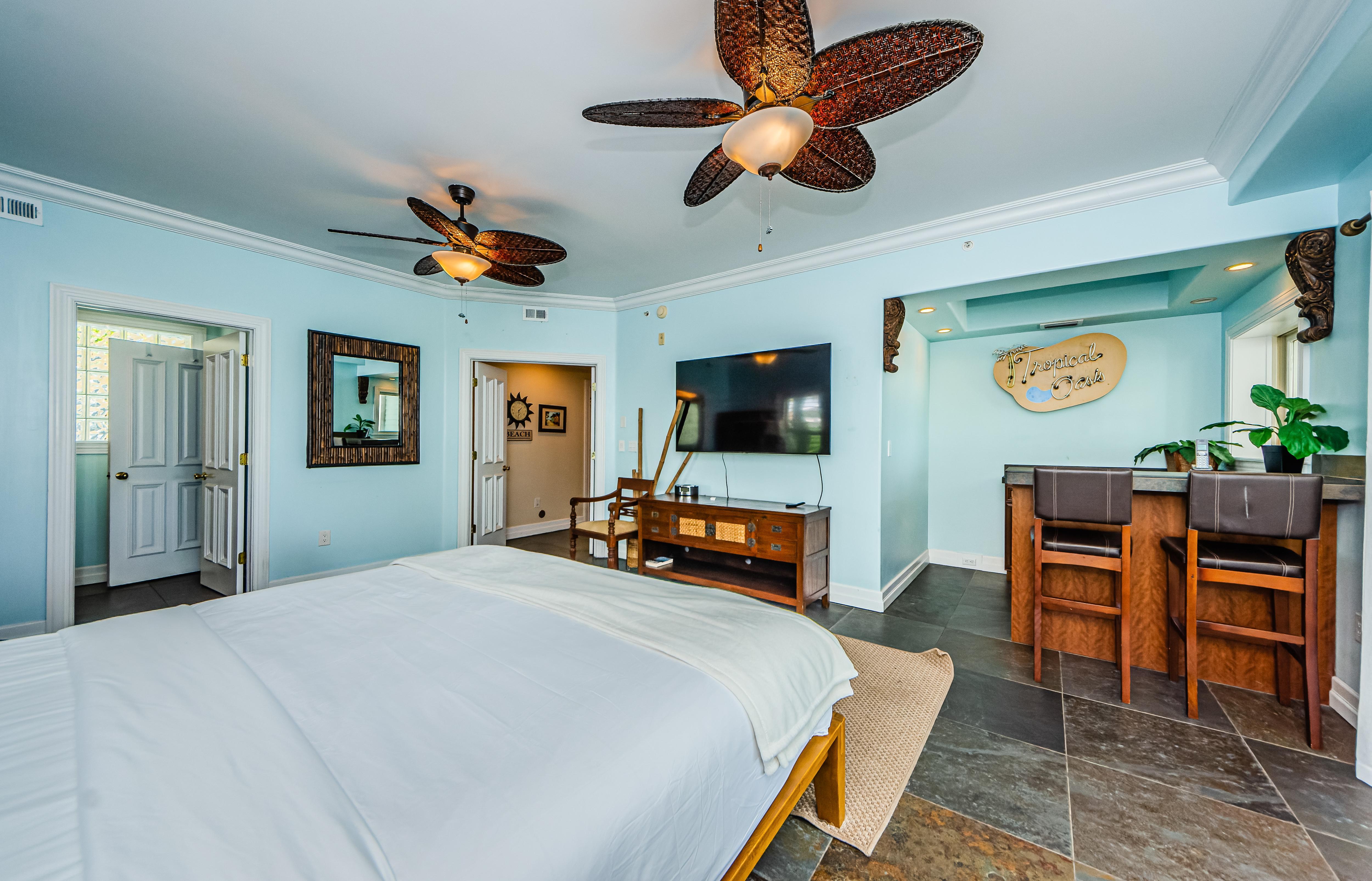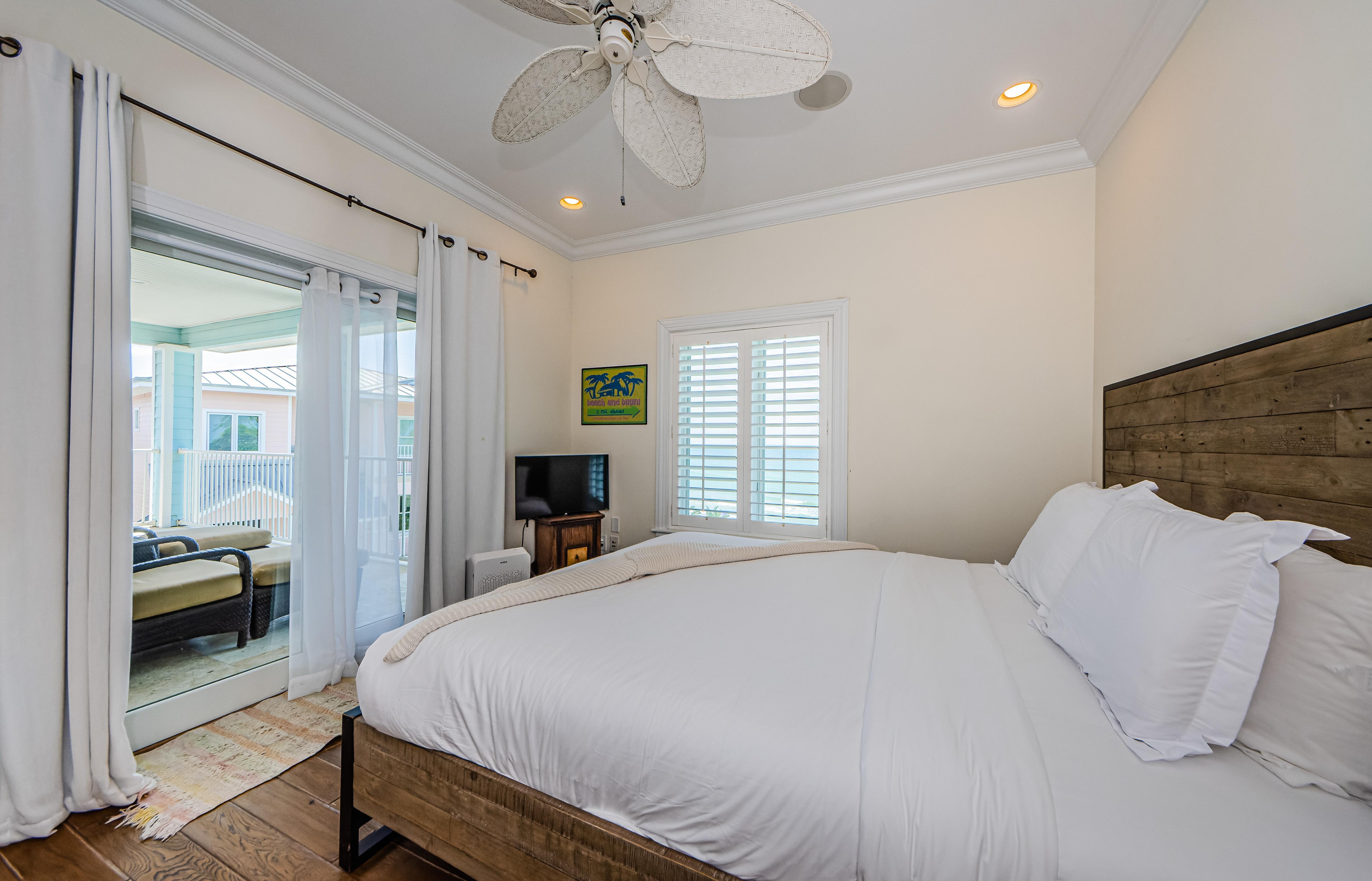 Another Master bedroom boasts a California King bed fit for taller guests, a 27” TV, and a private bathroom. This bedroom has a window overlooking the beach and a sliding door to the third-floor balcony.