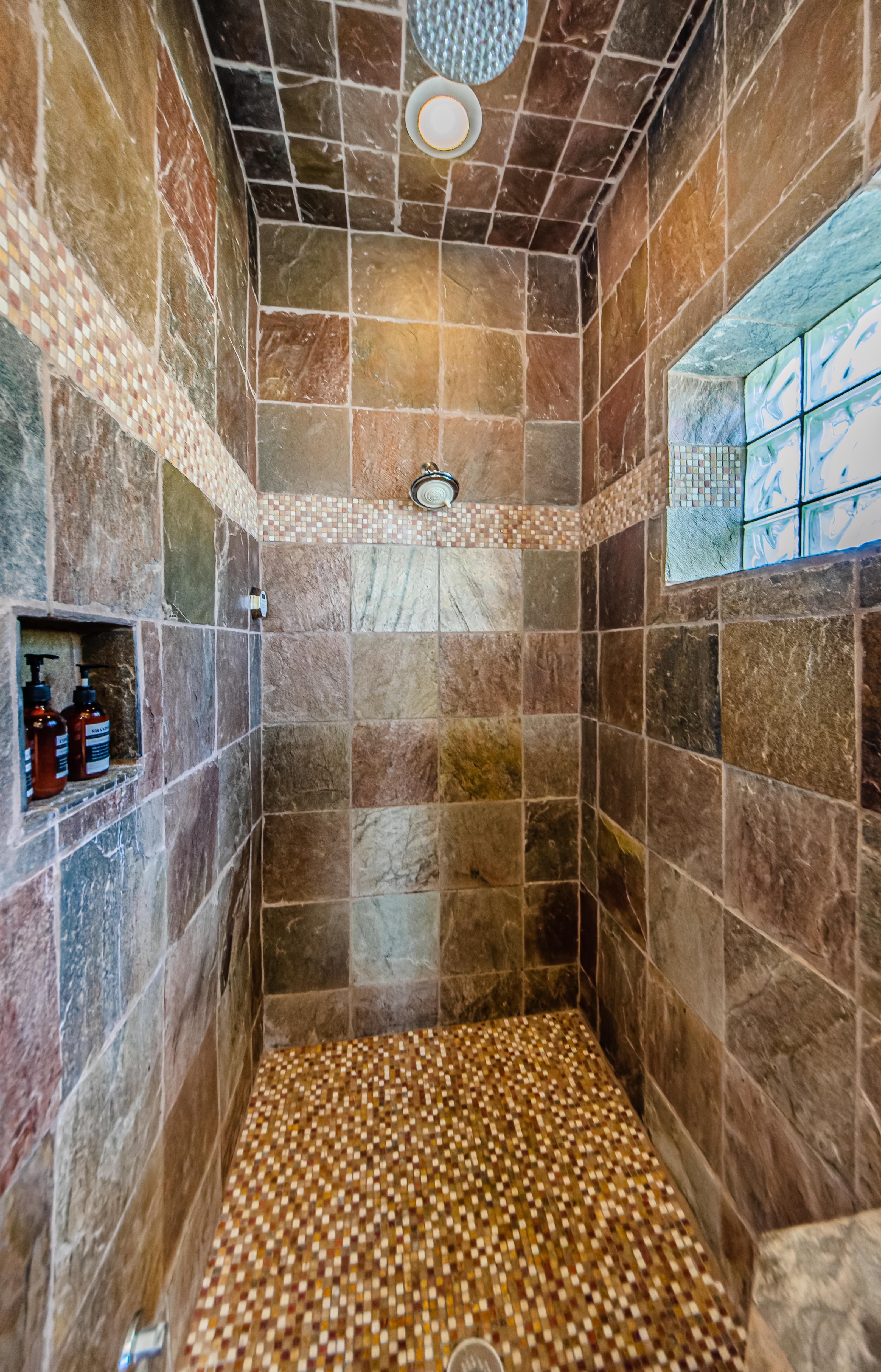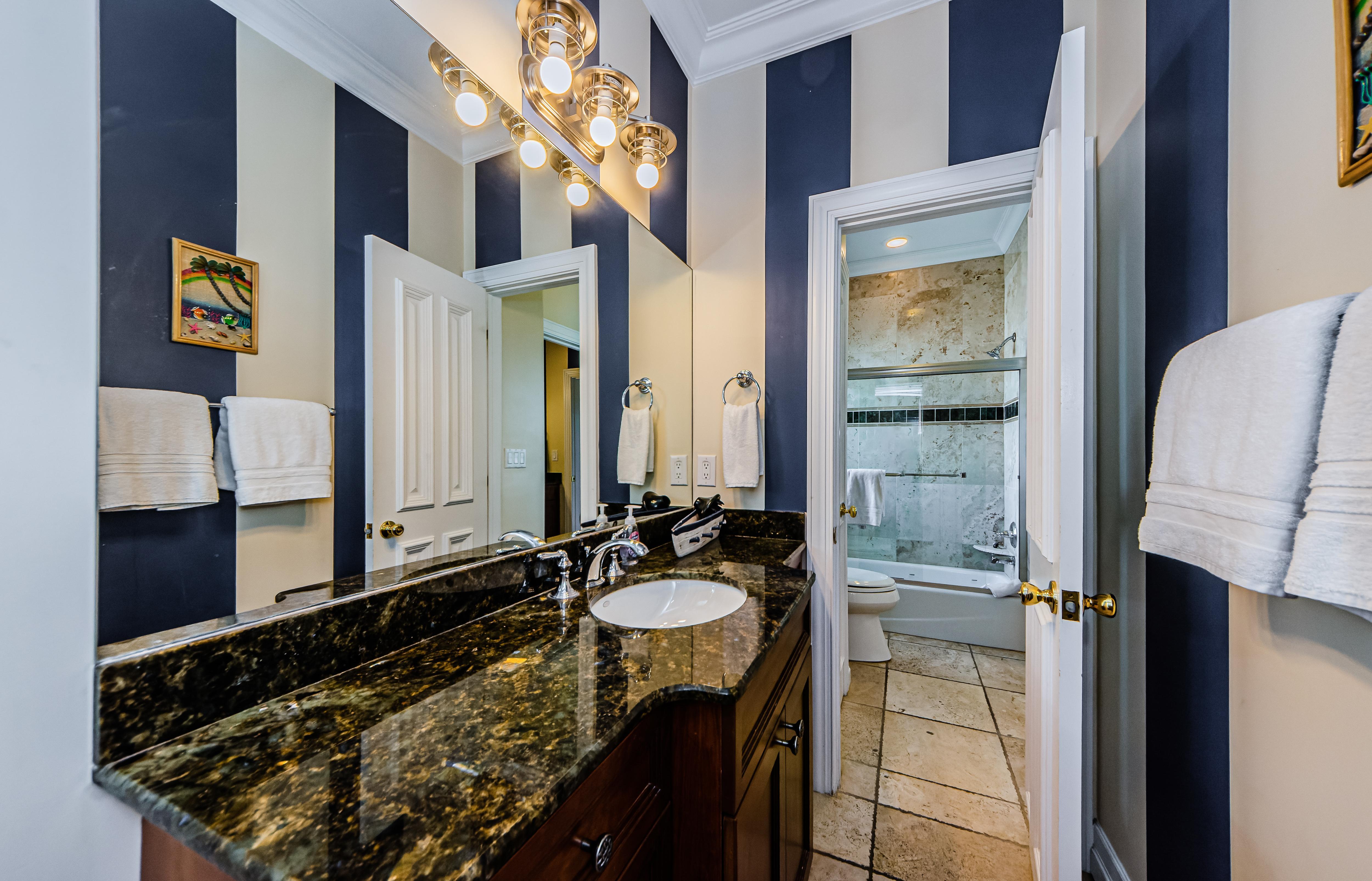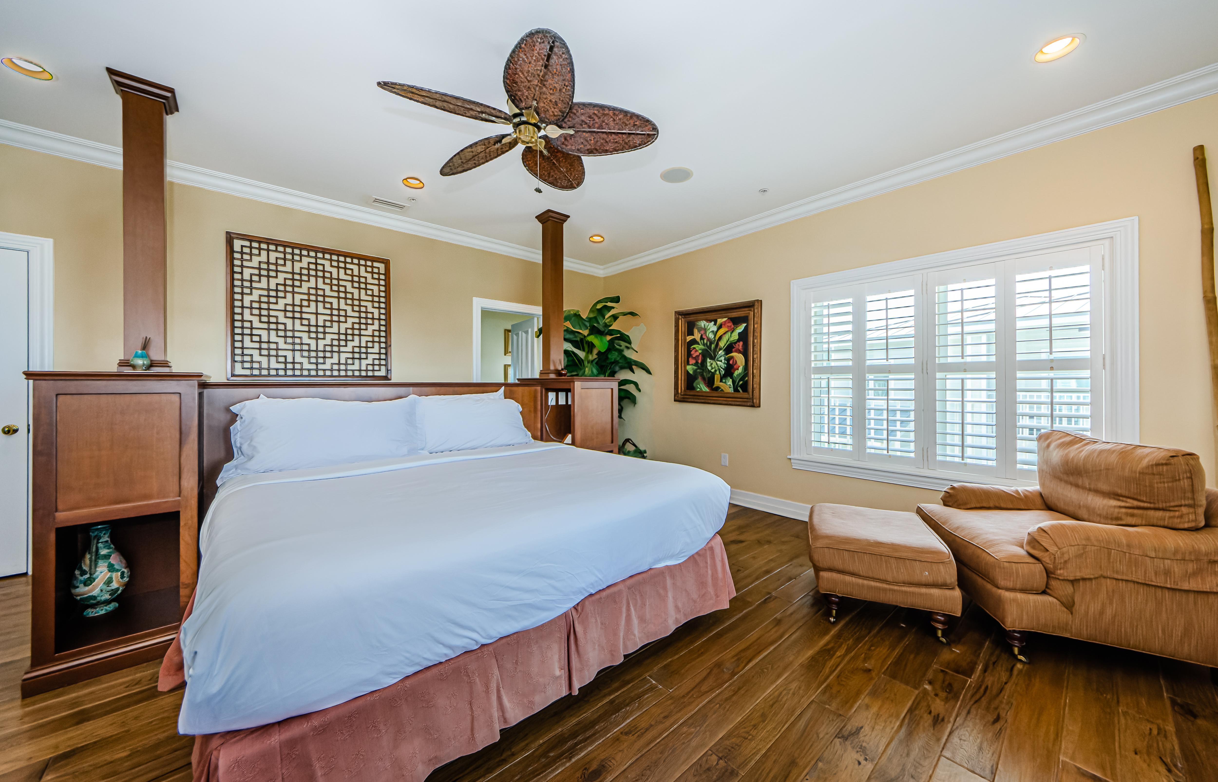 Another Master bedroom boasts a California King bed fit for taller guests, a 27” TV, and a private bathroom. This bedroom has a window overlooking the beach and a sliding door to the third-floor balcony.