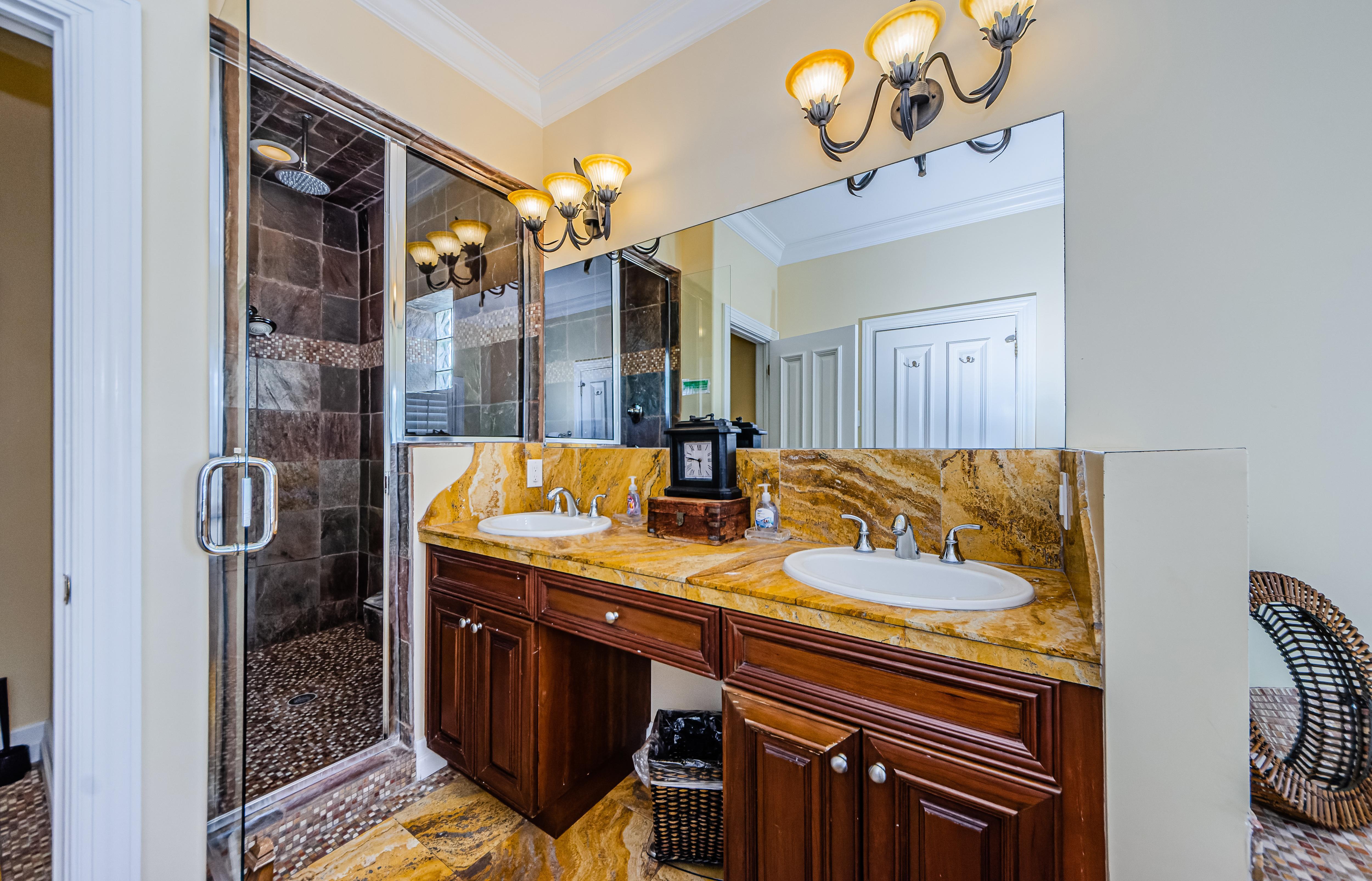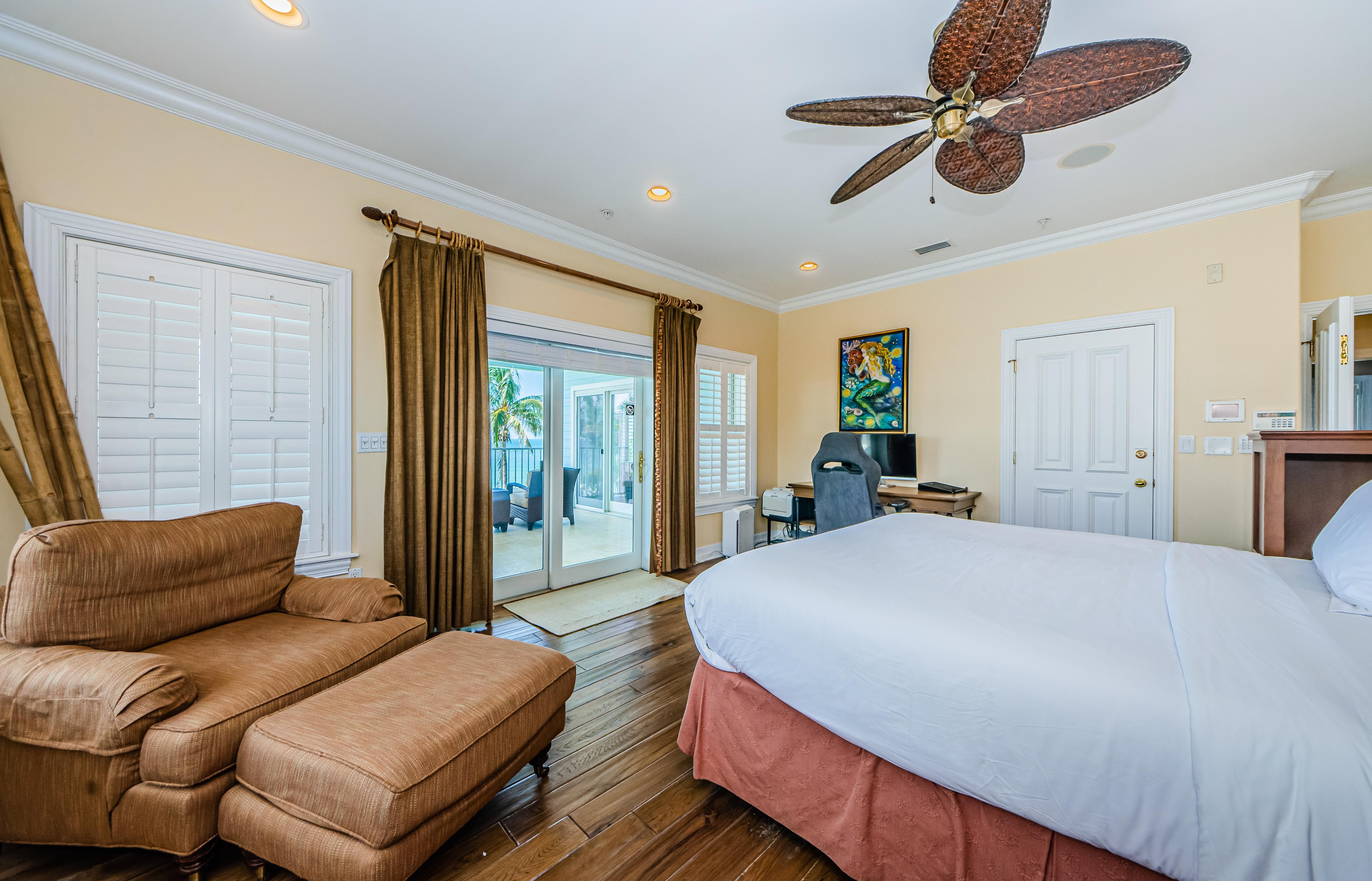 Relax in the peaceful larger Master bedroom decorated with wood furniture. It includes a King bed, walk-in closet, a workspace, bathroom with a jacuzzi tub, and a stone-tiled steam shower. It features a vast covered balcony accessible through sliding doors, with scenic beach and palm tree views.