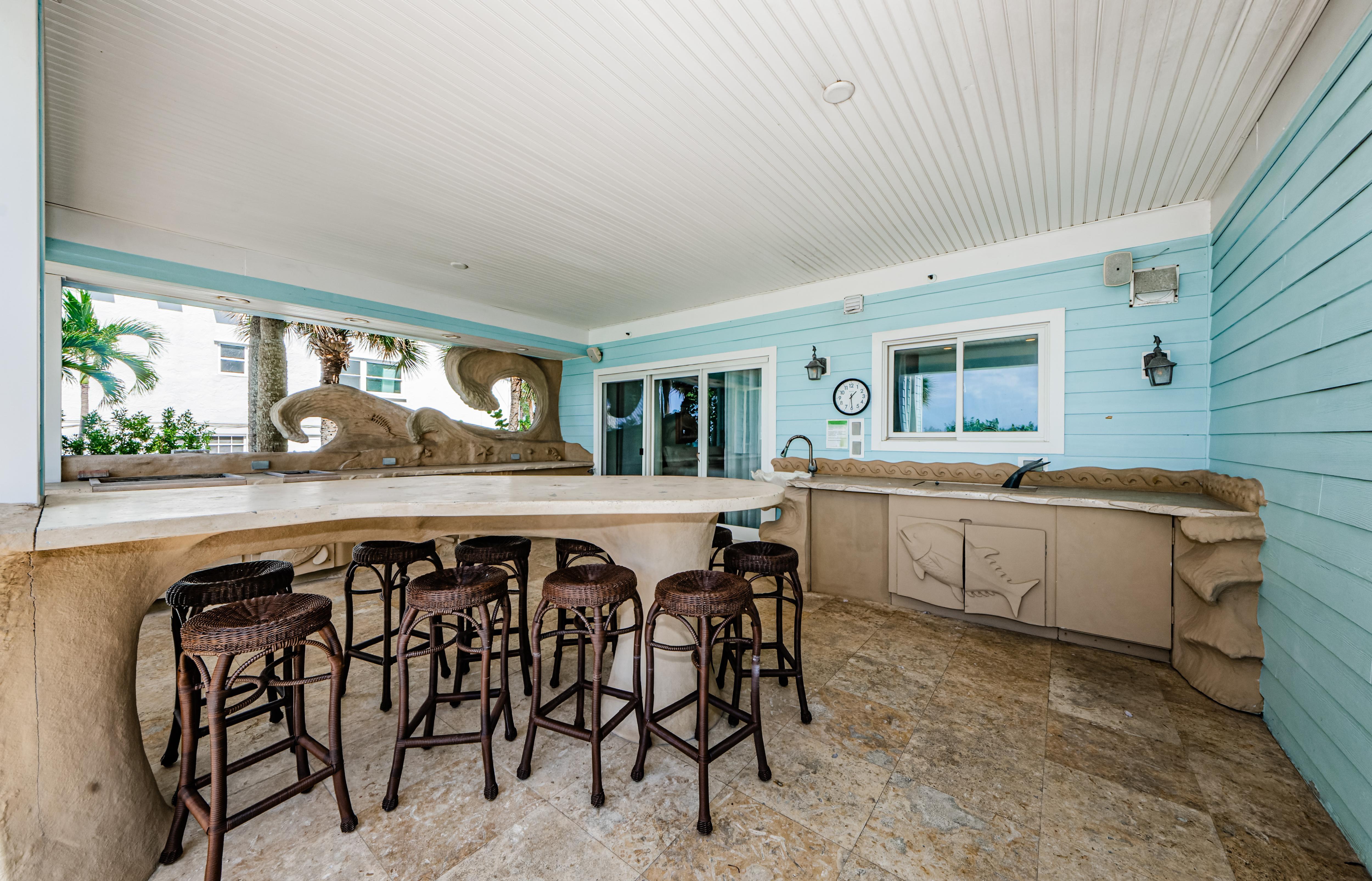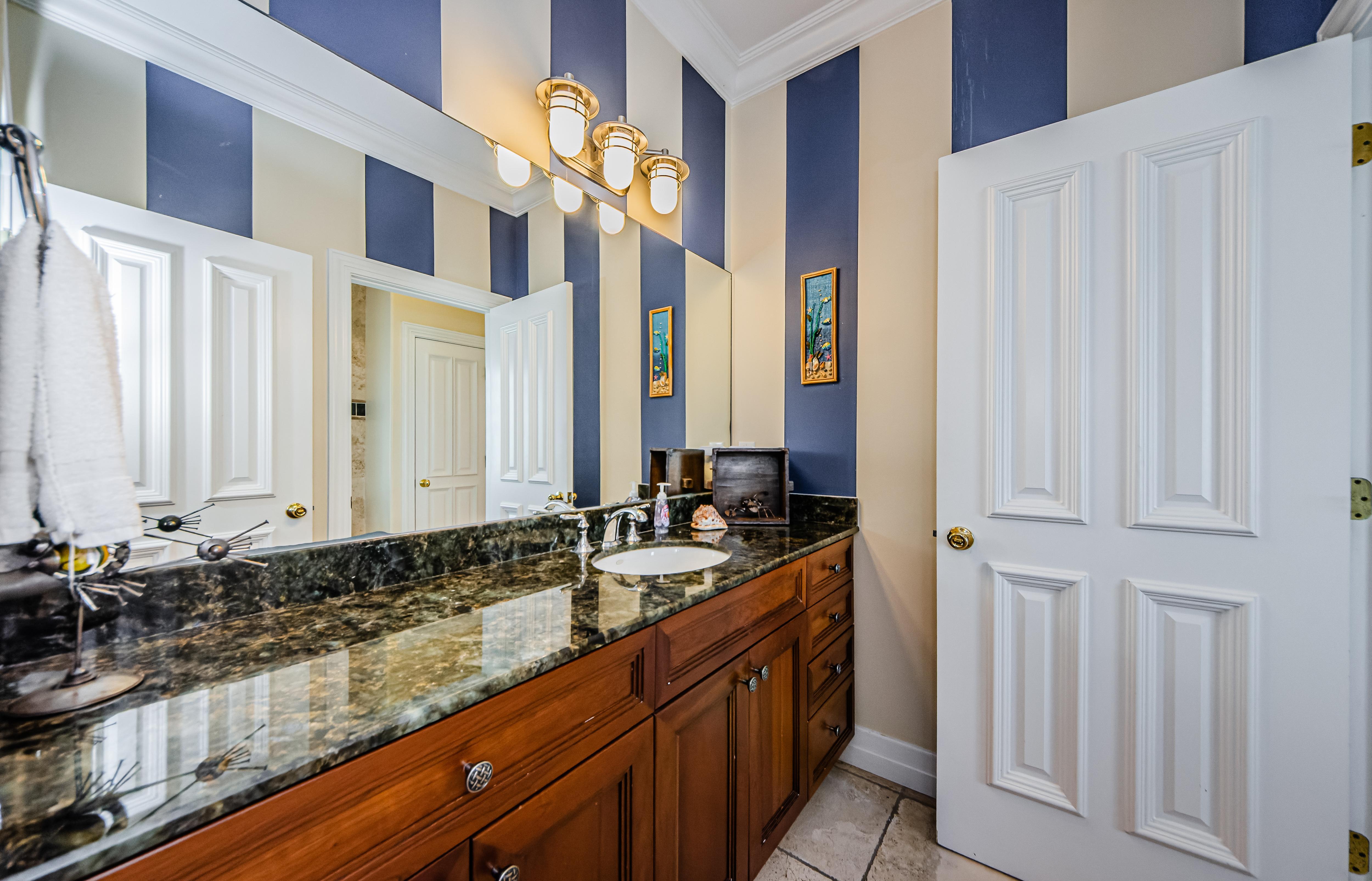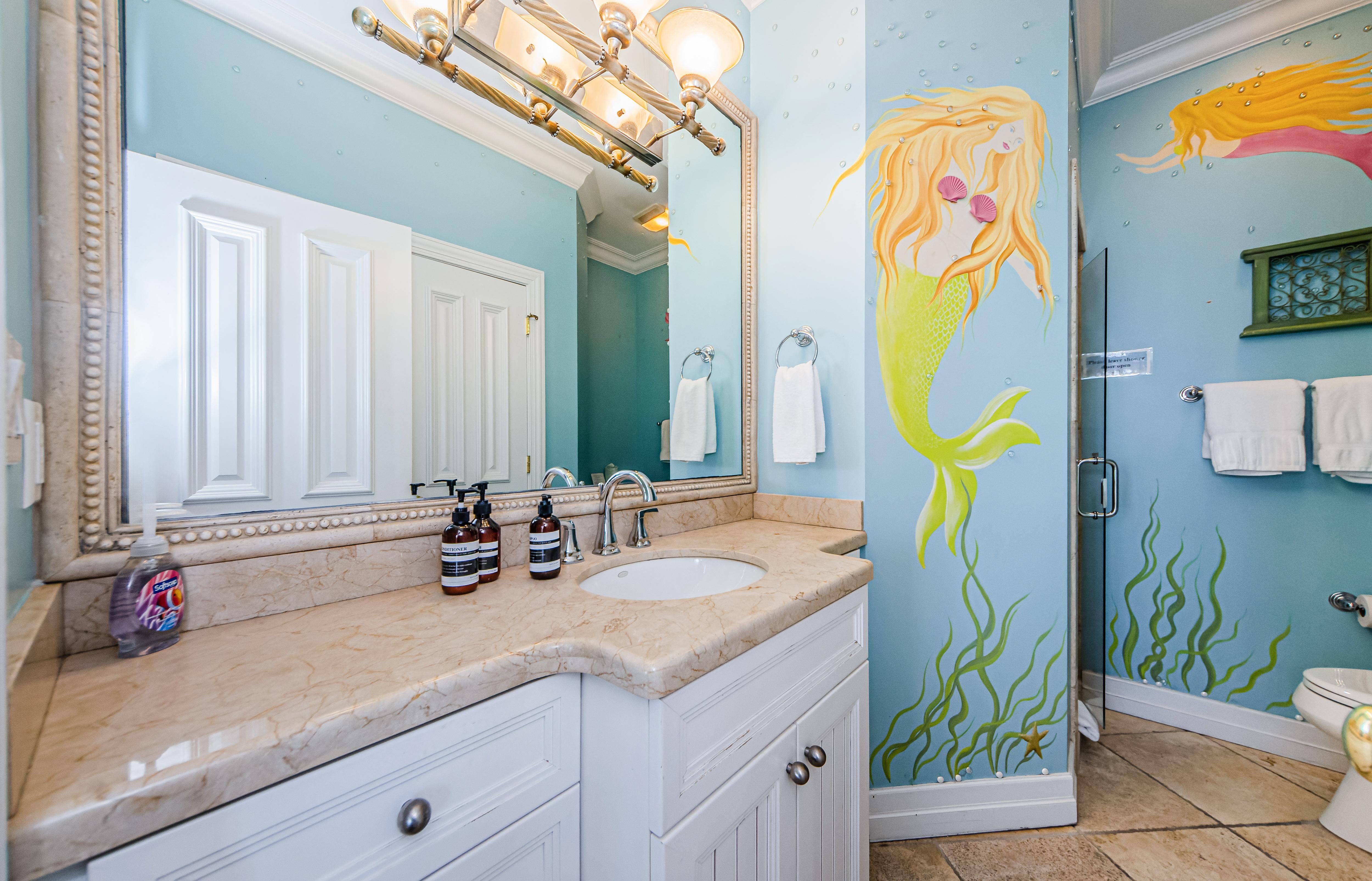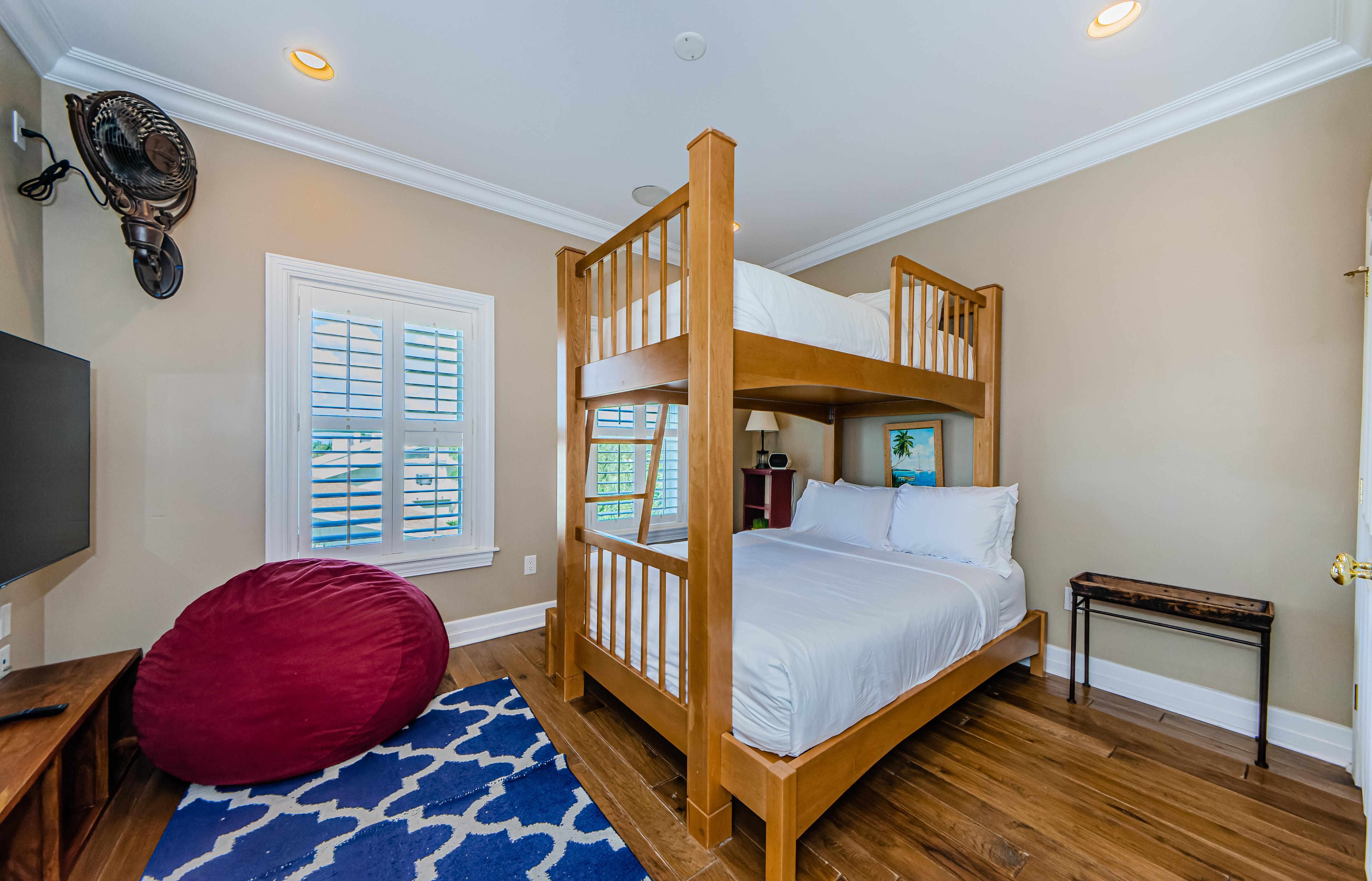 The first bunkroom bedroom also has beach and ocean views. It boasts Queen bunk beds, a separate vanity with a shared bathroom, and a walk-in closet. The second bunk bedroom offers a Queen size bed on the bottom and Twin XL bed on the top. This room has beanbag chairs, ideal for kids to enjoy gaming, cartoons, or movies on the 50” TV.