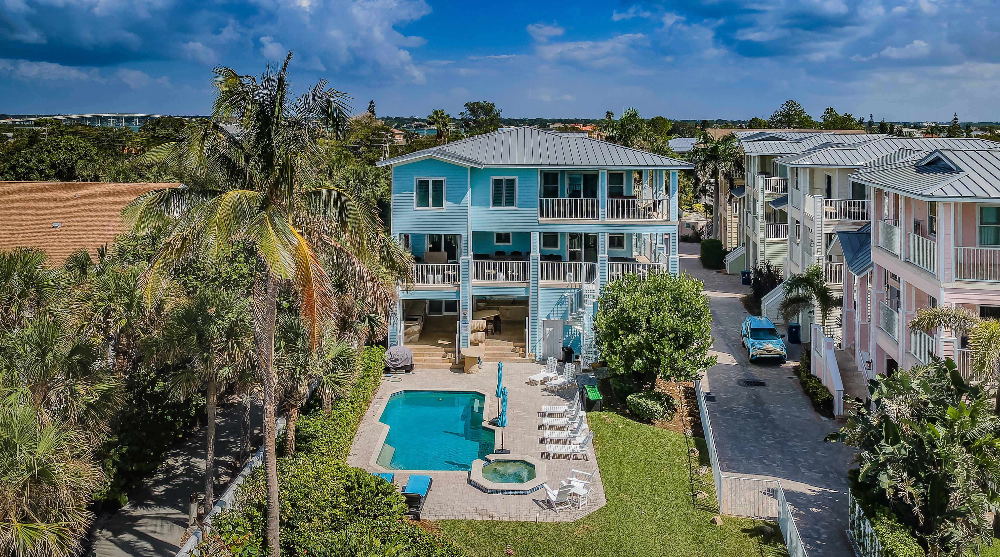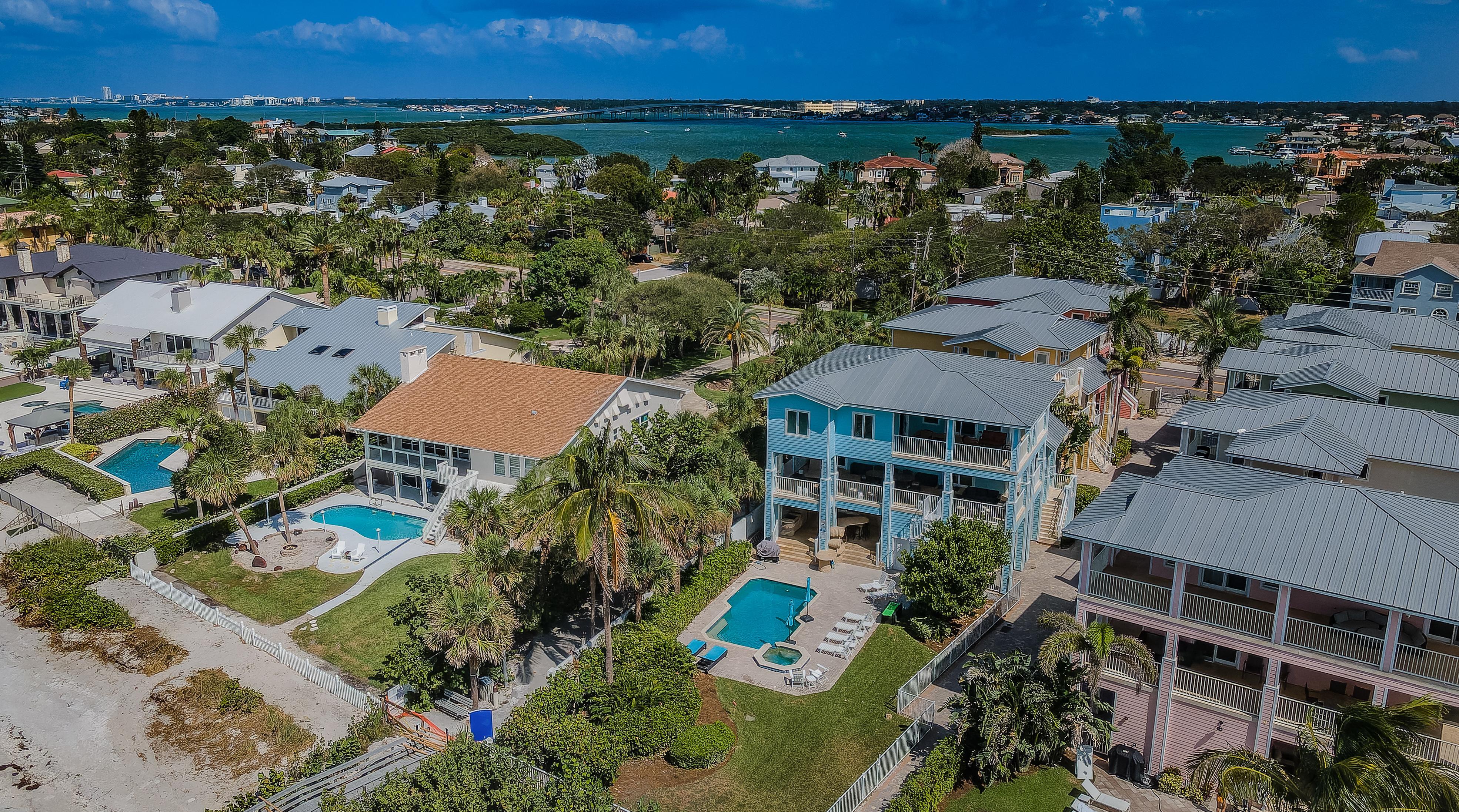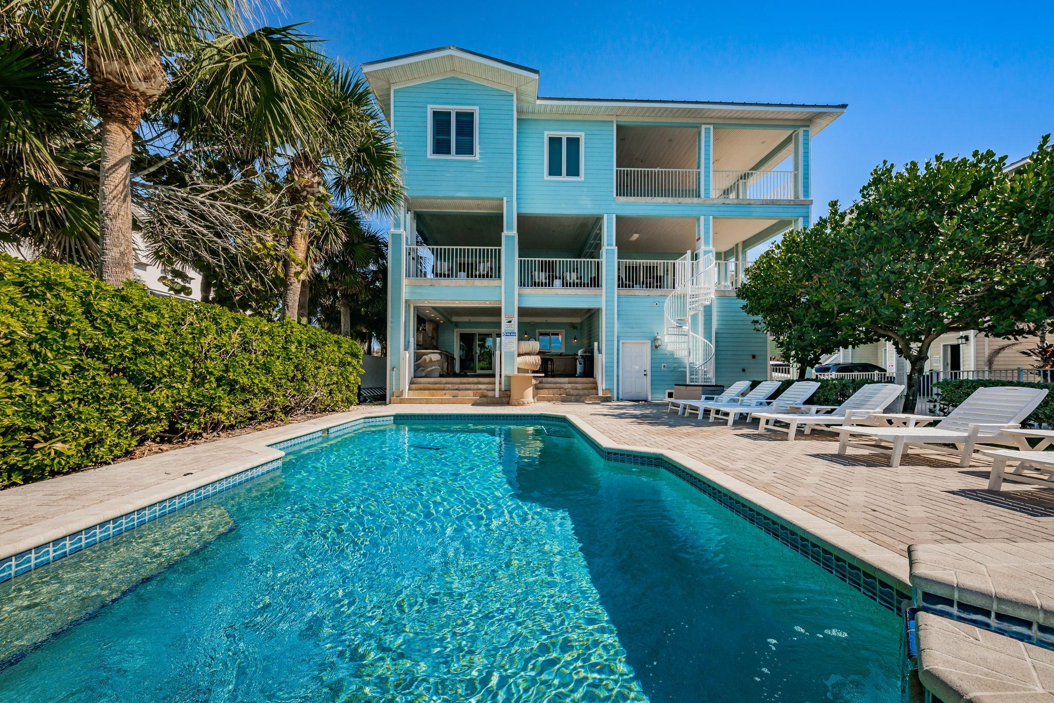 Exclusive Aqua Escape is a direct beachfront home on the Sand Key barrier island only 8 miles away from Clearwater, FL that's rated #1 beach on the East Coast of the U.S. This exclusive property boasts a private heated pool and offers captivating Gulf views from three balconies. It's the same gorgeous turquoise water beach as Clearwater but not crowded. Facing the beach, the house features a private fenced yard and a heated pool. The beach has "white sugar" sand and clear and warm Gulf waters with low waves. Restaurants, bars, and a shop for renting paddleboards or bicycles are within a short walking distance. The home is also within 2 hours’ drive to Orlando Disney Parks and Universal Studios, if you wanted to make it a day trip. Other destinations around the house include Treasure Island, St. Petersburg boasting The Dali Museum and other attractions, and Tampa. Within a 2-minute walk from the house, there is a park with tennis, pickleball, and basketball courts and a playground.