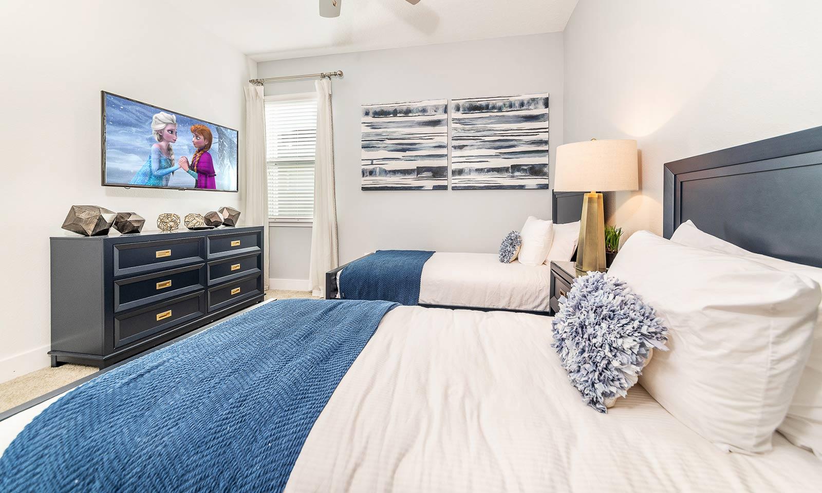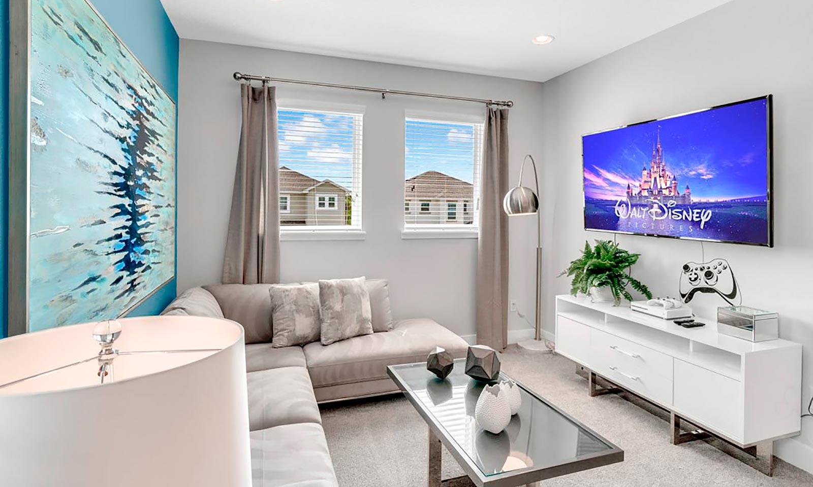A pristine kitchen is part of the flow so the cook can get in on the conversation too. Efficient and sleek, the kitchen has all the amenities a home cook needs to whip up something delicious with premium appliances, plenty of counter space and storage, and a three-seat breakfast bar. An eight-person dining table sits nearby for group meals. When you're home from the parks, but still want some action, head for the car-shark-themed game room where you can engage in some friendly family competition at air hockey and ping pong. There's also a TV lounge upstairs where you can binge-watch your favorite shows, or compete at video games.