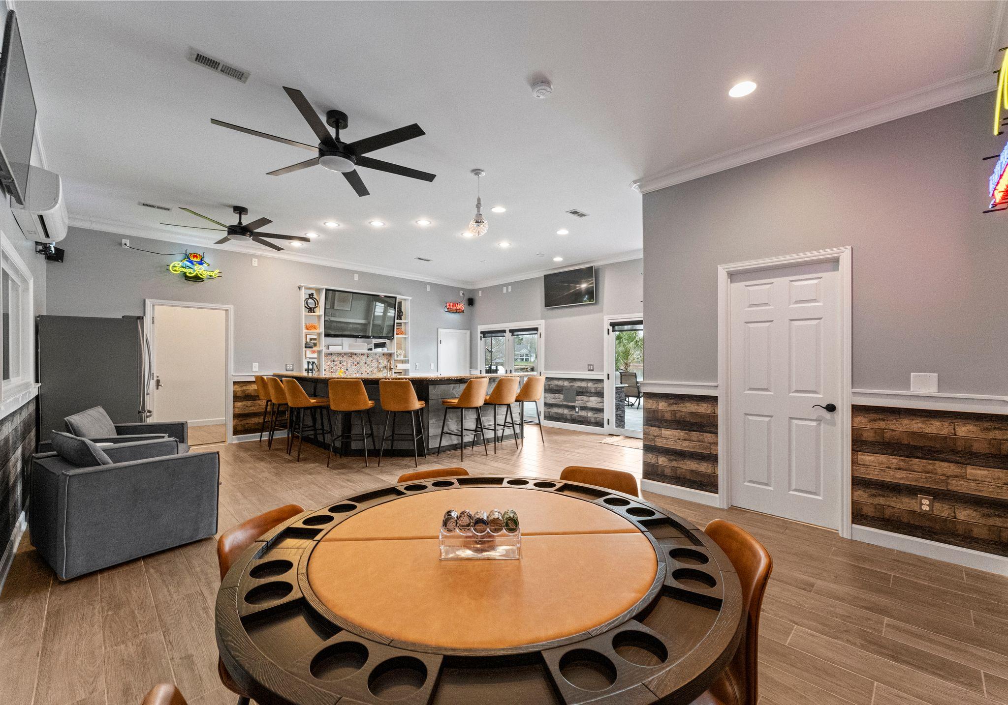 * Festive game room - ping pong, shuffleboard, air hockey, basketball, roulette wheel, and arcade games.