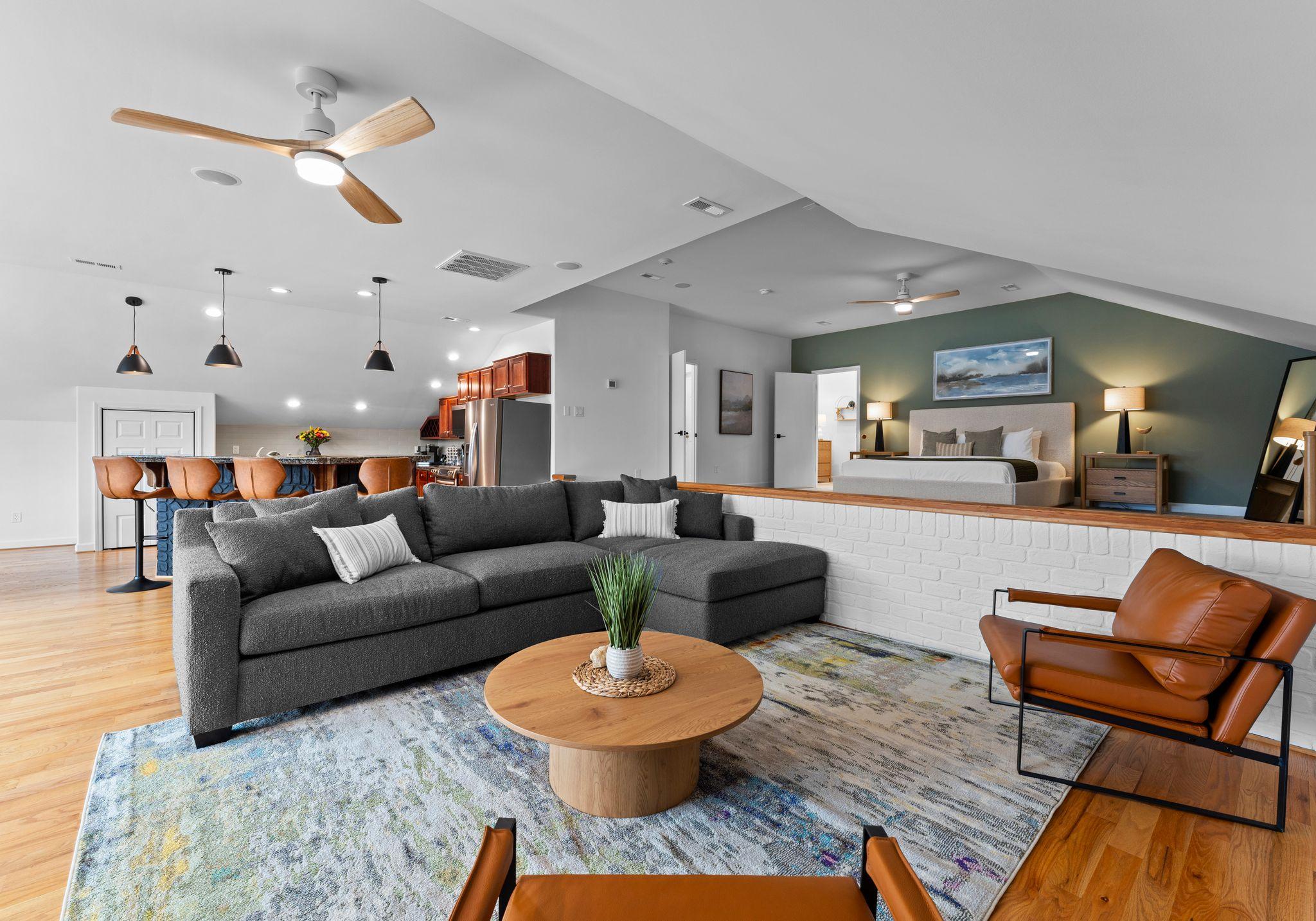 * Upper-level private apartment with a king bed and two private, twin bunk beds.