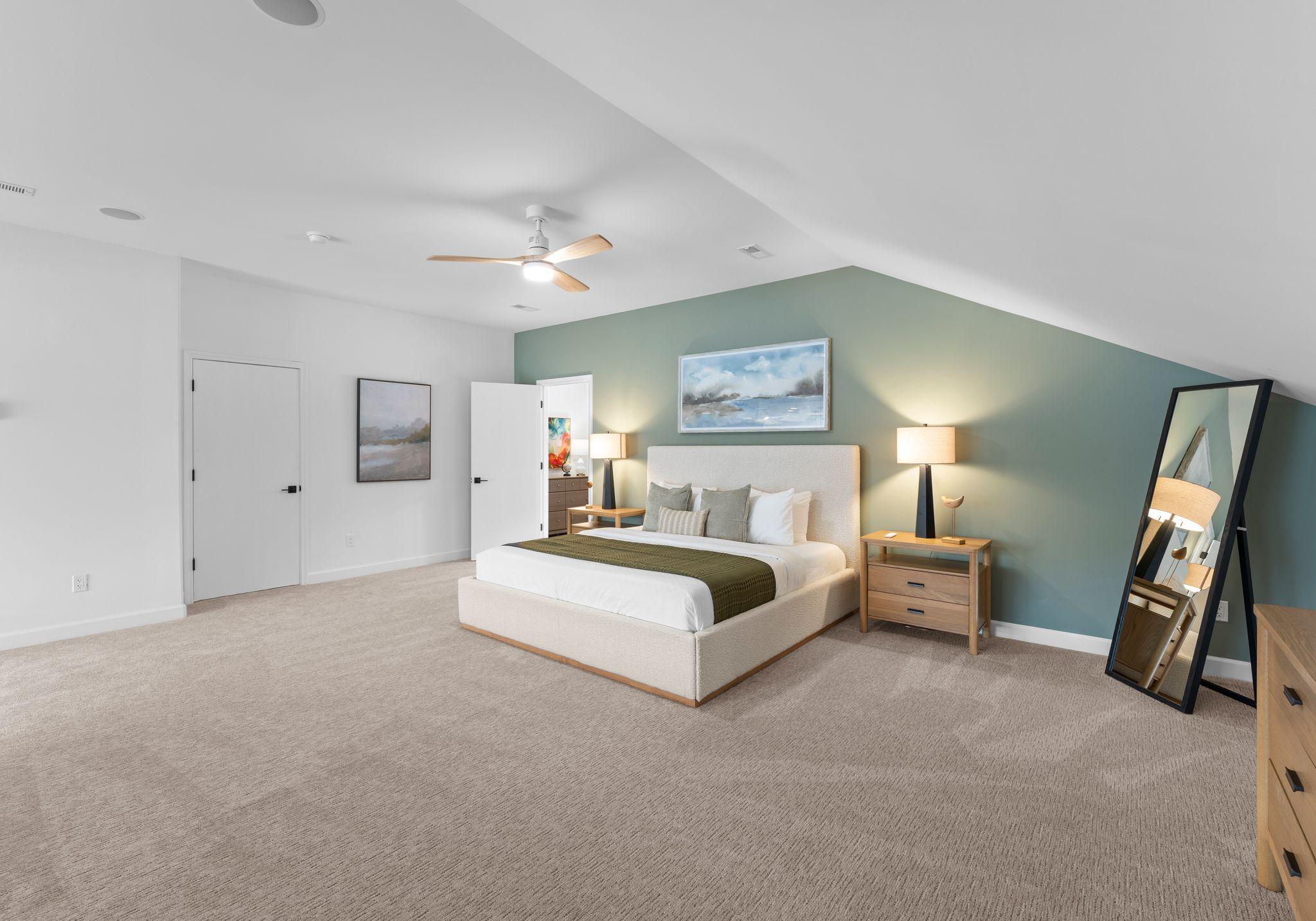 * Upper-level queen bunk room with two queen beds and double-entry ensuite bathroom