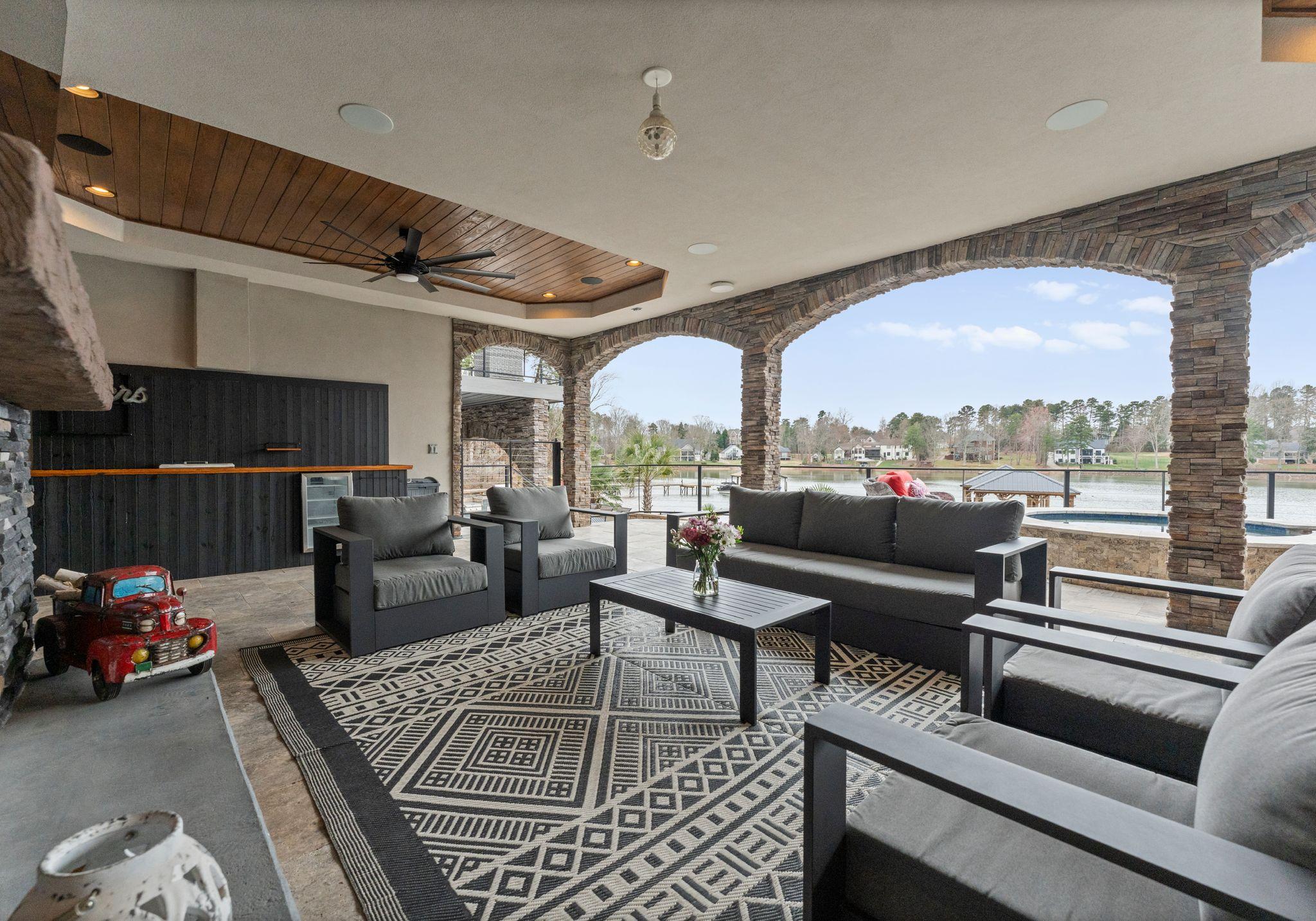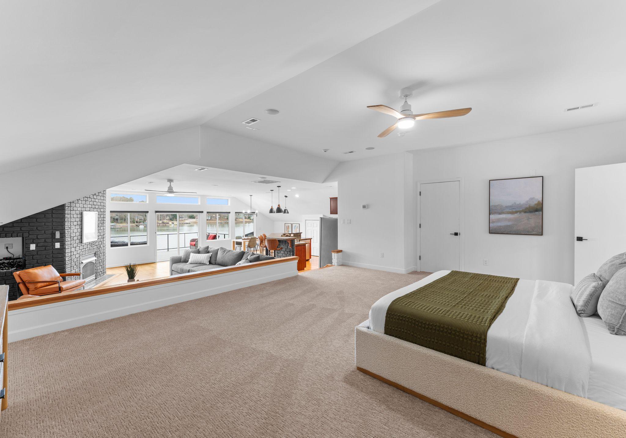 * The main-level primary master king features a luxurious ensuite bathroom with a large shower with dual rainshower heads, a fireplace, a stunning lake view, and private patio/pool access.