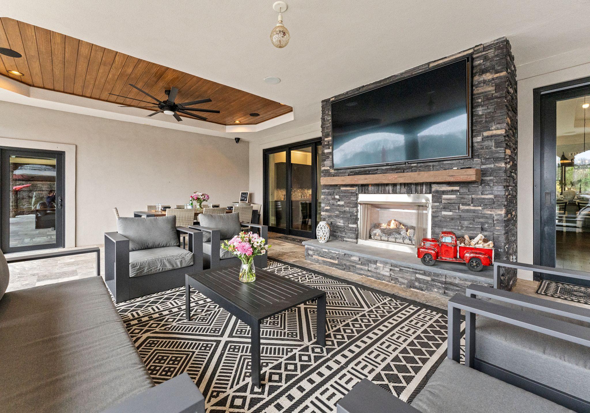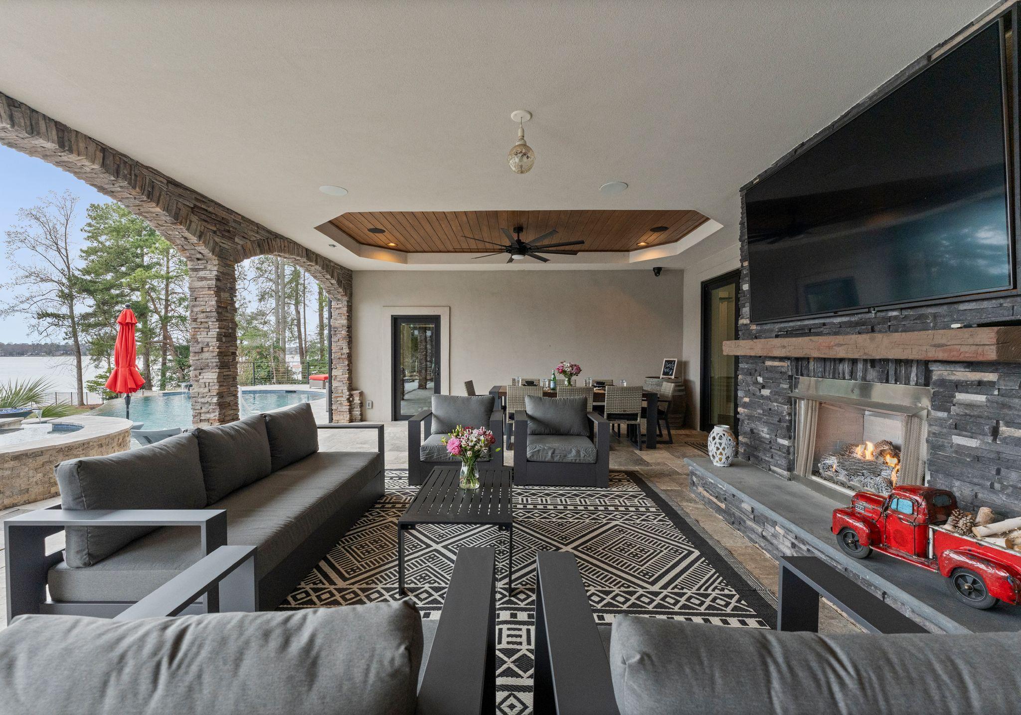 * Three separate living areas and a covered outdoor living area with a fireplace—enough space for everyone to escape for quiet time.