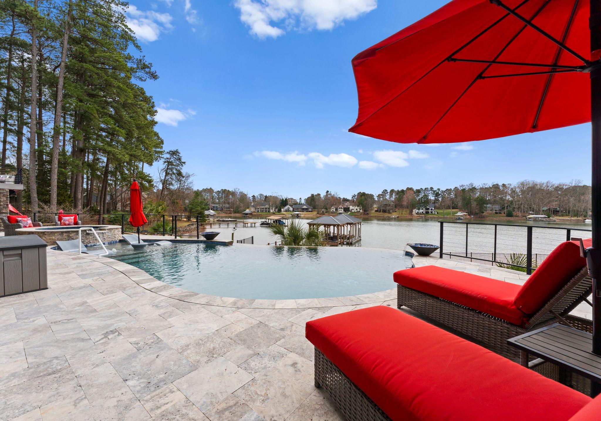 * A resort-style, heated infinity pool with sun loungers and umbrellas.
