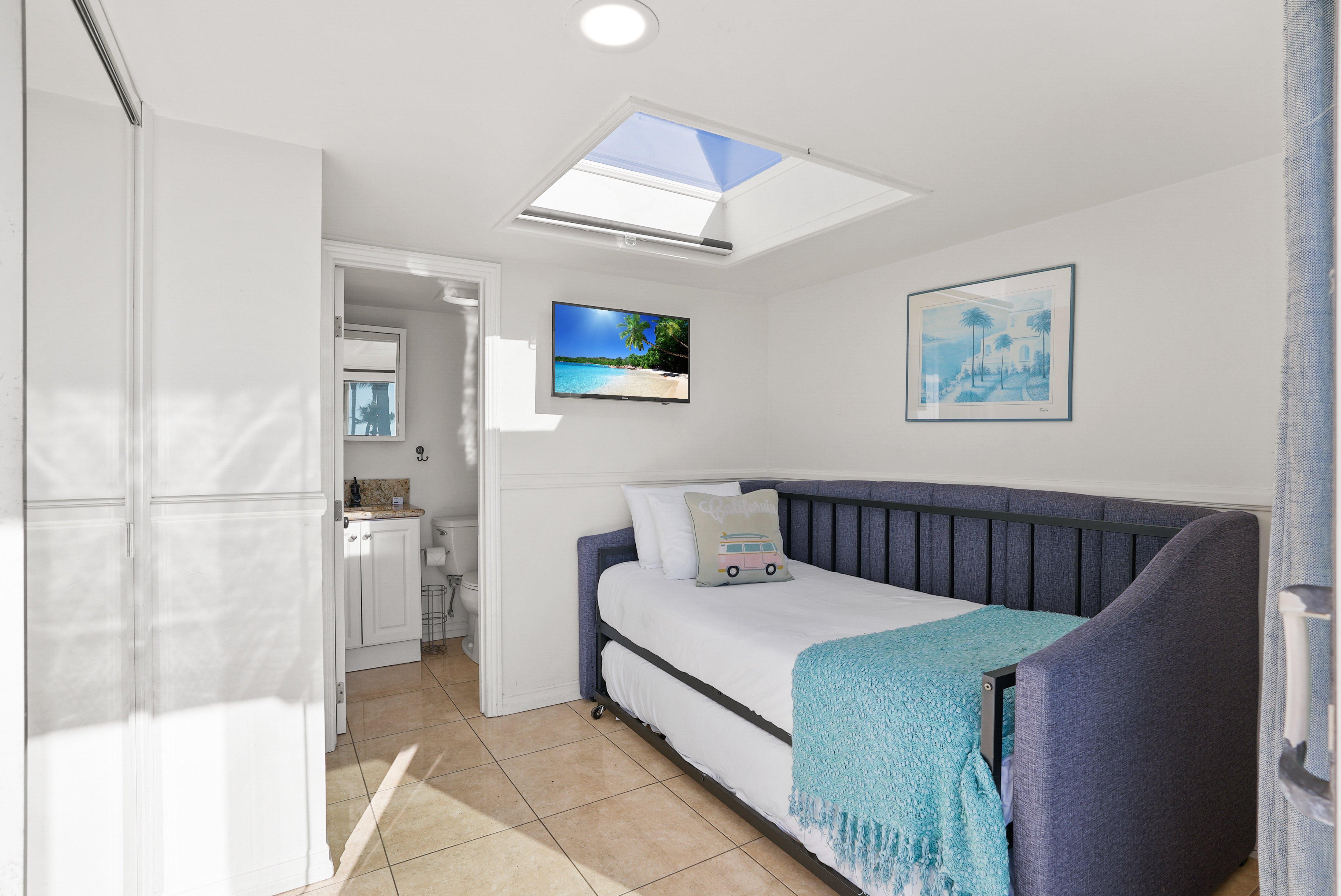 Upstairs, two tranquil bedrooms await, including a king primary suite with a private en suite bath. The third bedroomβlocated atop the rooftop deckβis a charming retreat accessed via outdoor stairs, offering a twin trundle bed beneath a large skylight, plus its own ensuite bath.