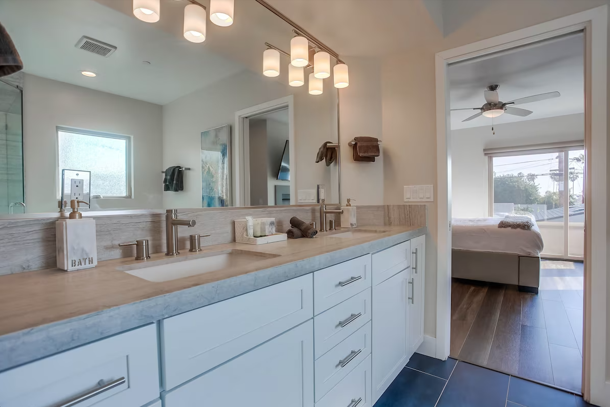 A standout feature of this three-level home is the fantastic rooftop deck. Indulge in the private hot tub, relax and lounge on the luxurious patio furniture while taking in the sweeping views of Pacific Beach.