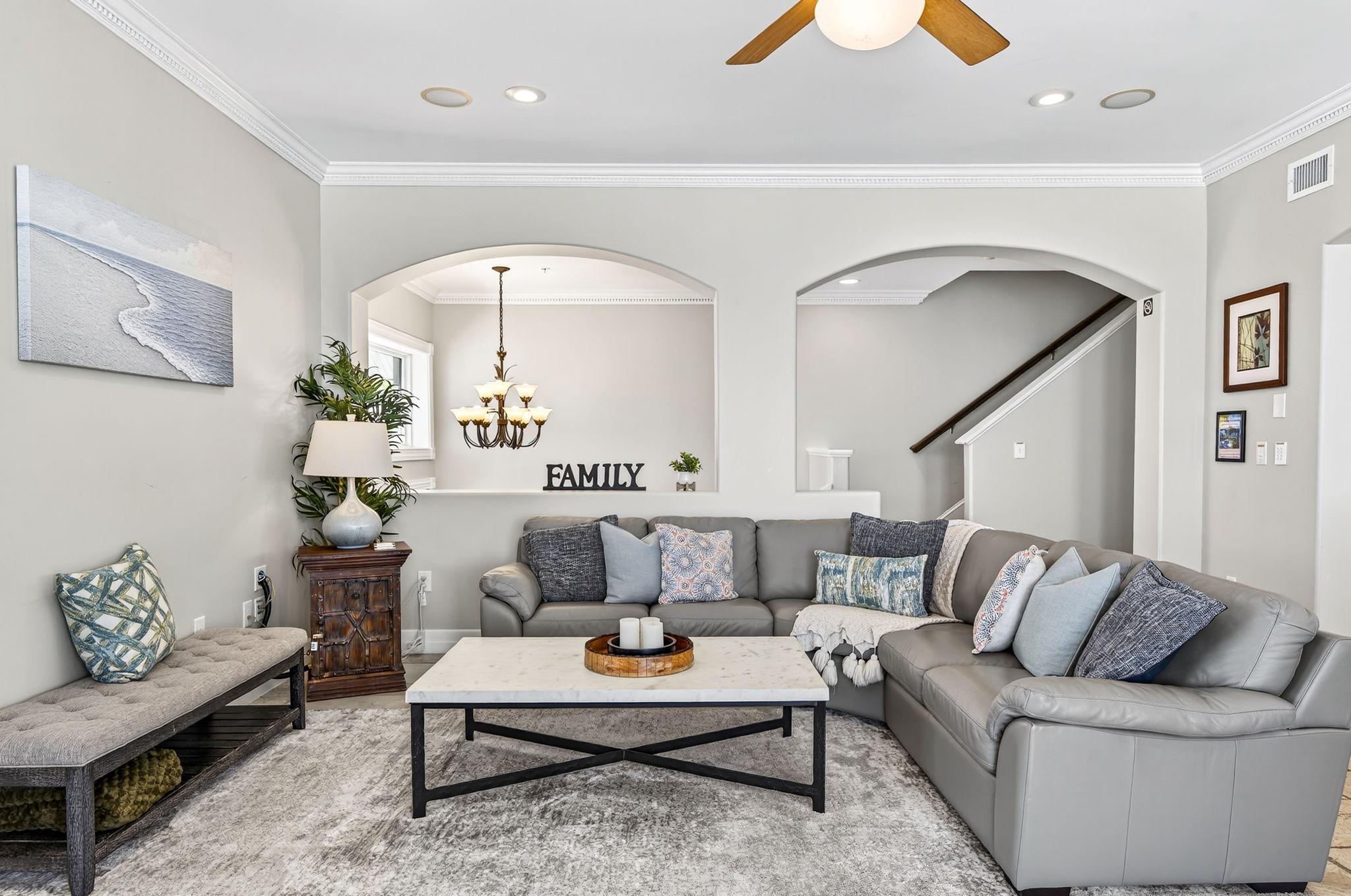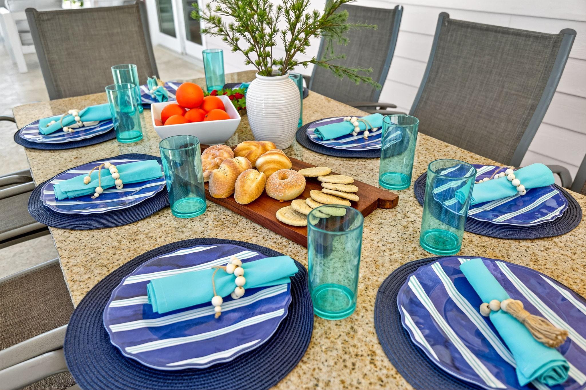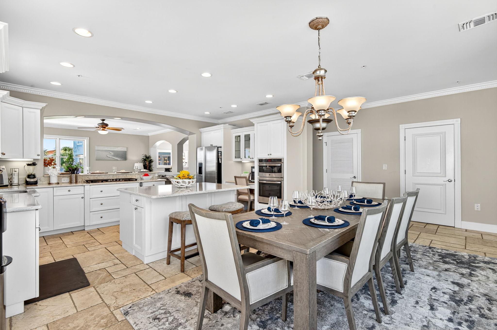 Living room adjoins a spacious dining area which seats 8 guests at the dining table and 4 more on the island.