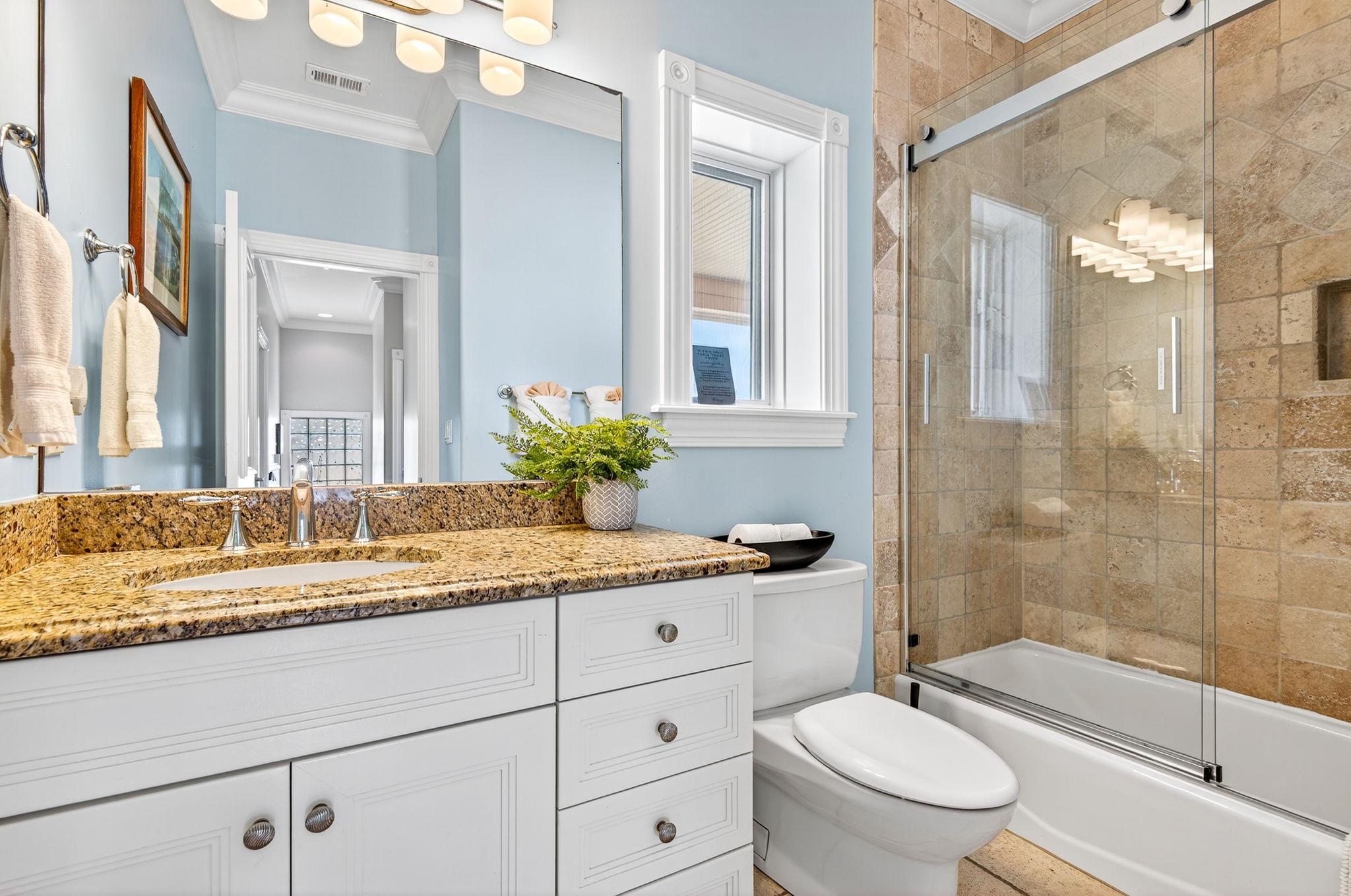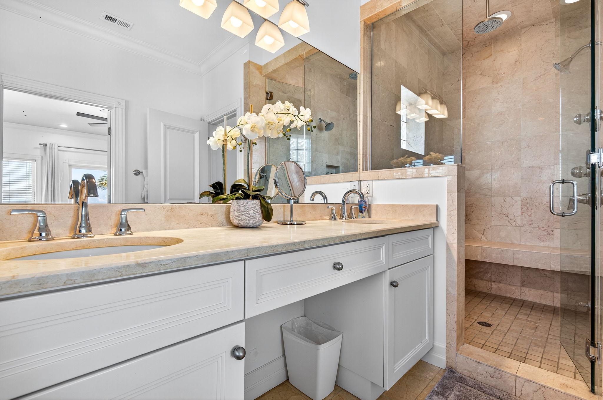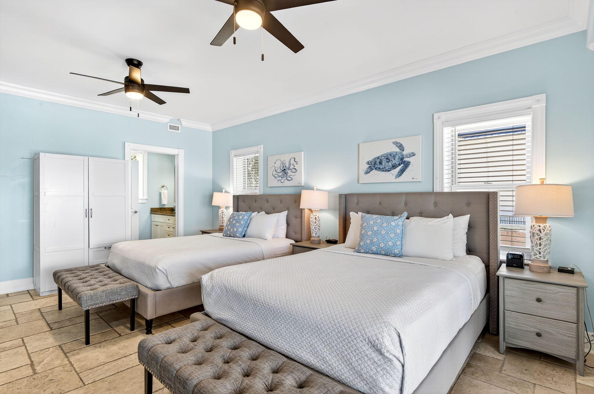 Ground Level features a two-car garage, laundry area, Gulf front pool and the first bedroom. First bedroom has 2 Queen beds with a private full bathroom. This bedroom has direct access to the pool as well.
