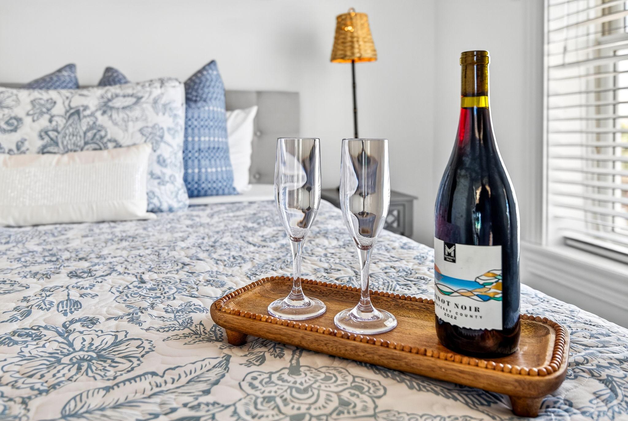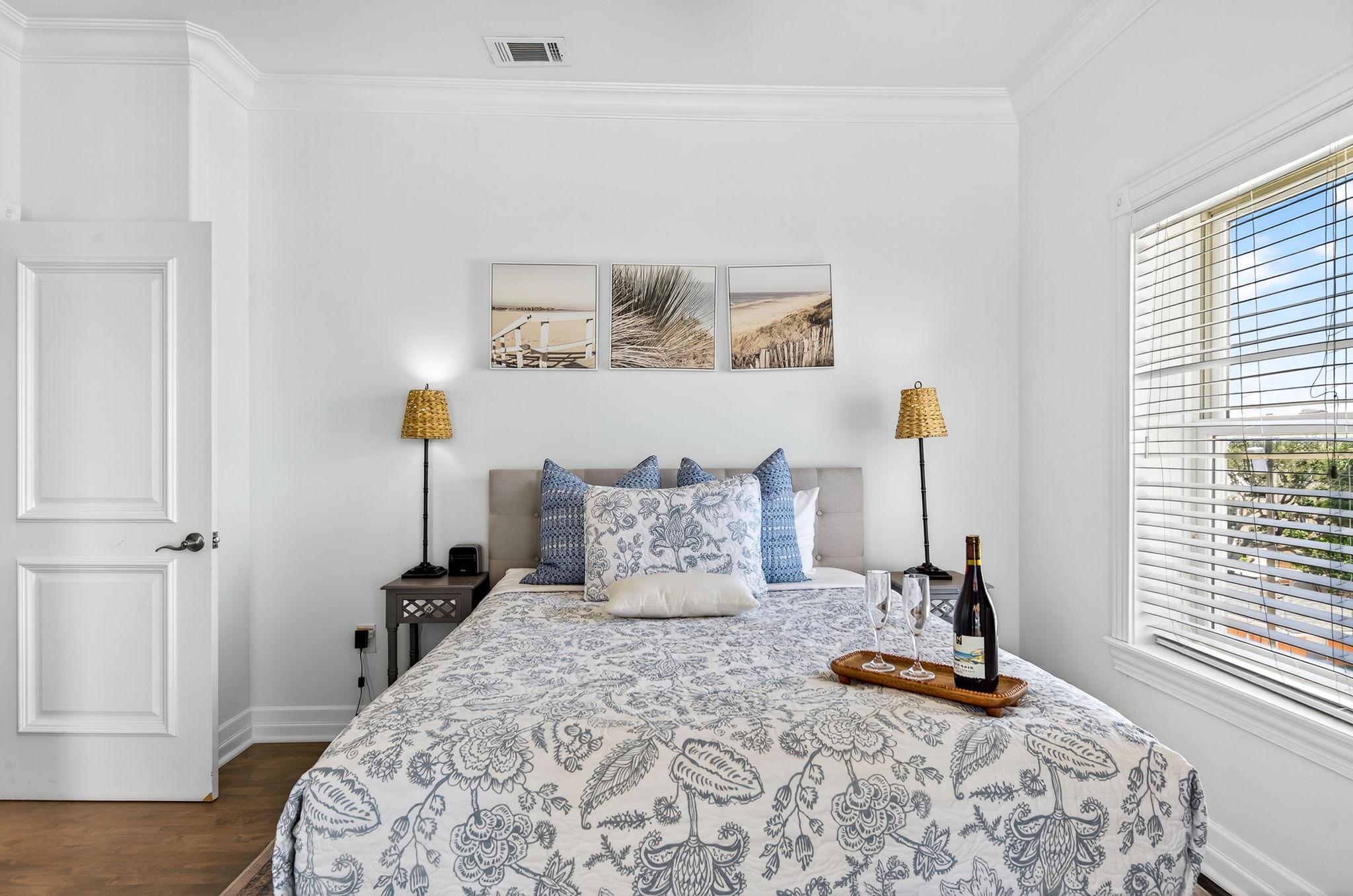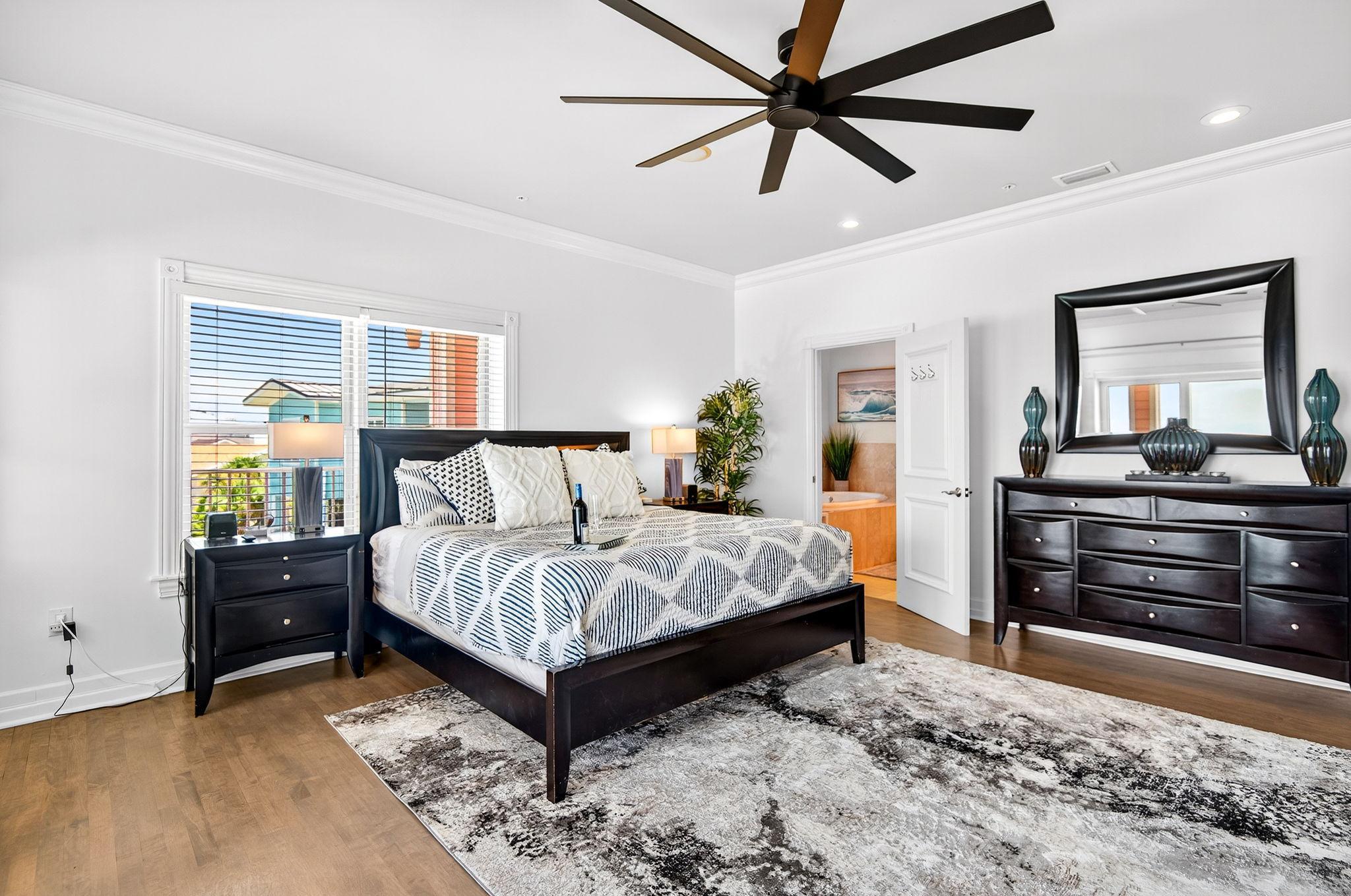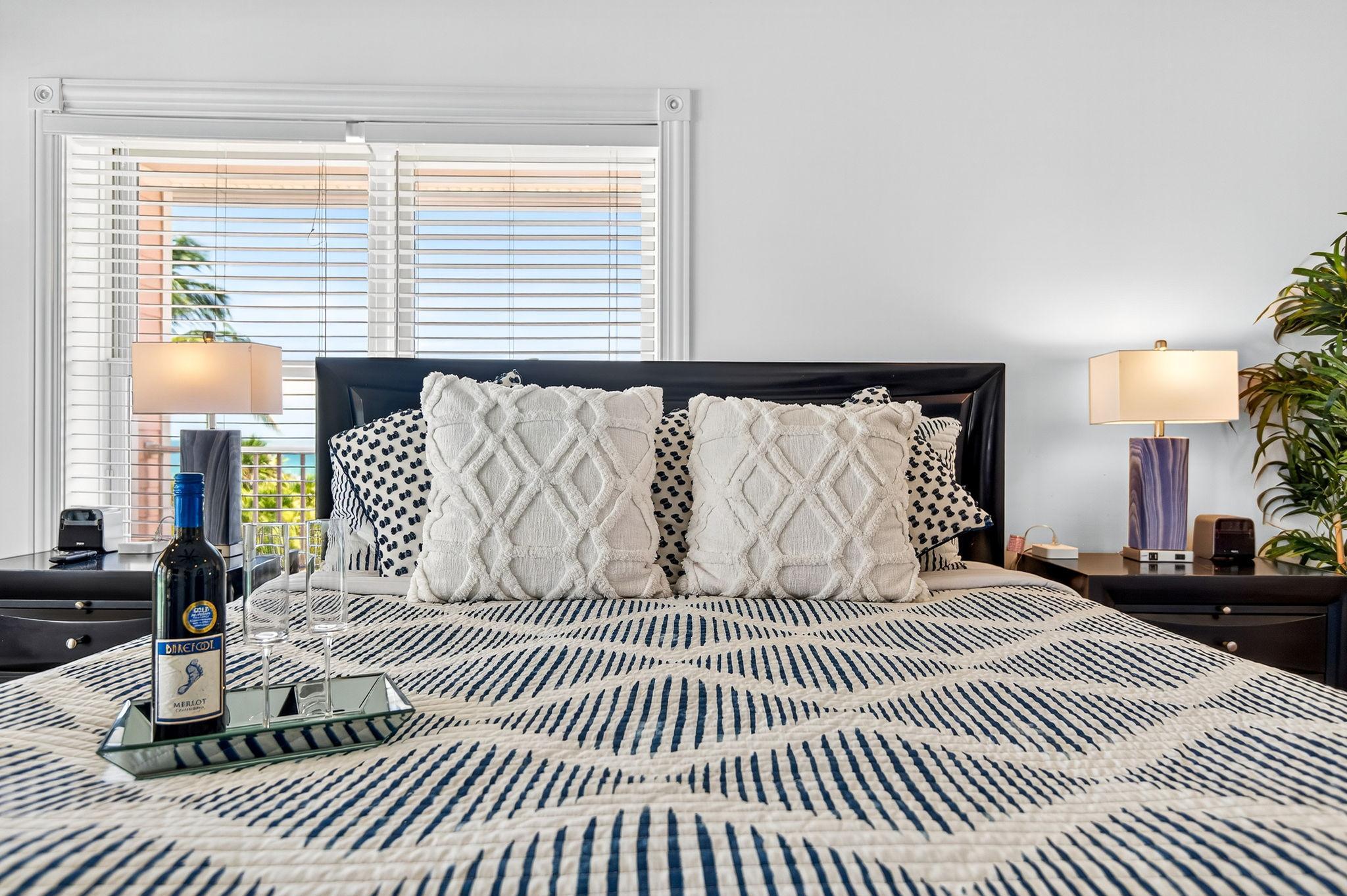 Third bedroom with a Queen bed and access to the balcony. There is a full hallway bathroom that the second and third bedroom share. The primary bedroom has a King bed with an ensuite bathroom and access to the balcony. This vacation home that can sleep up to 12 guests.