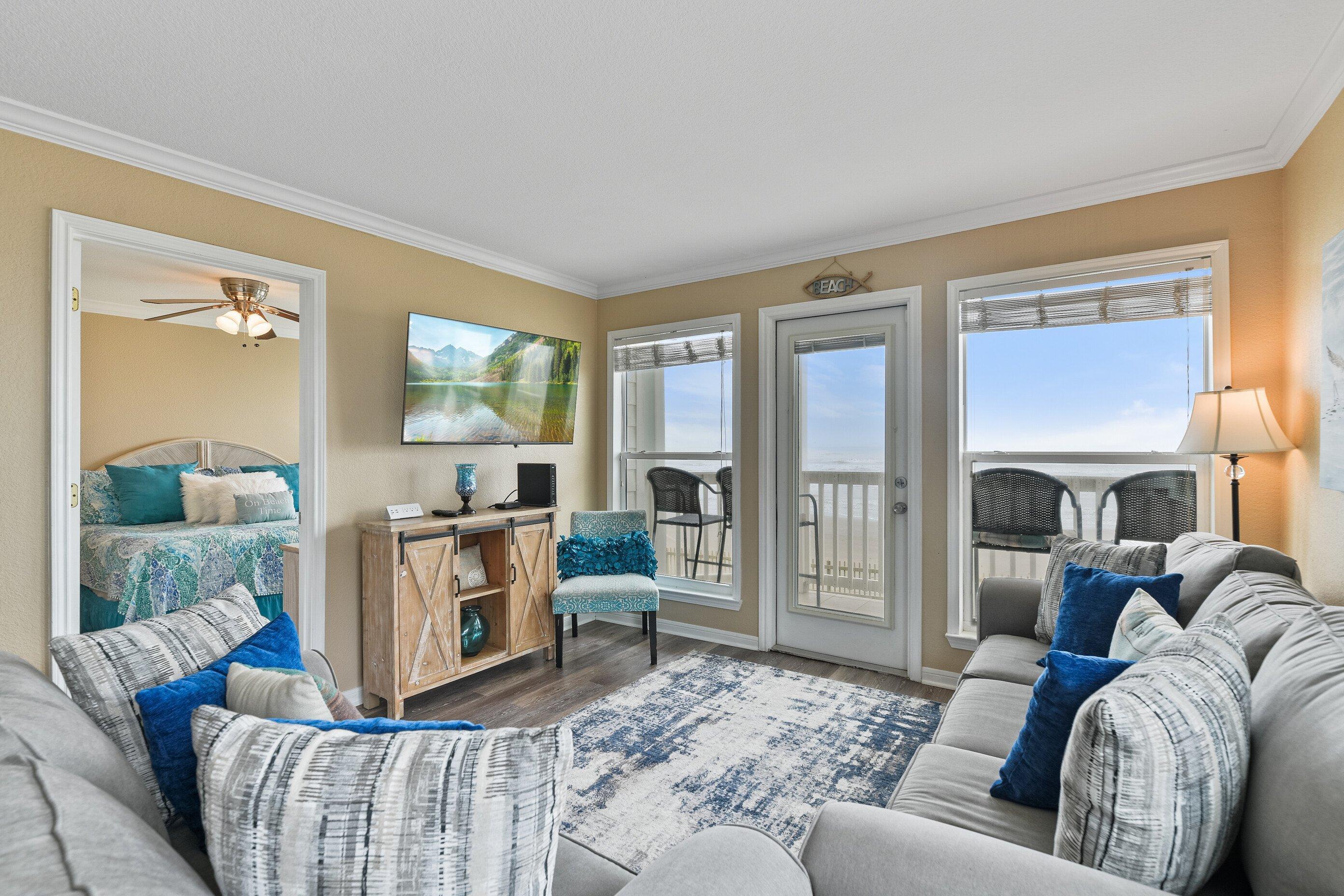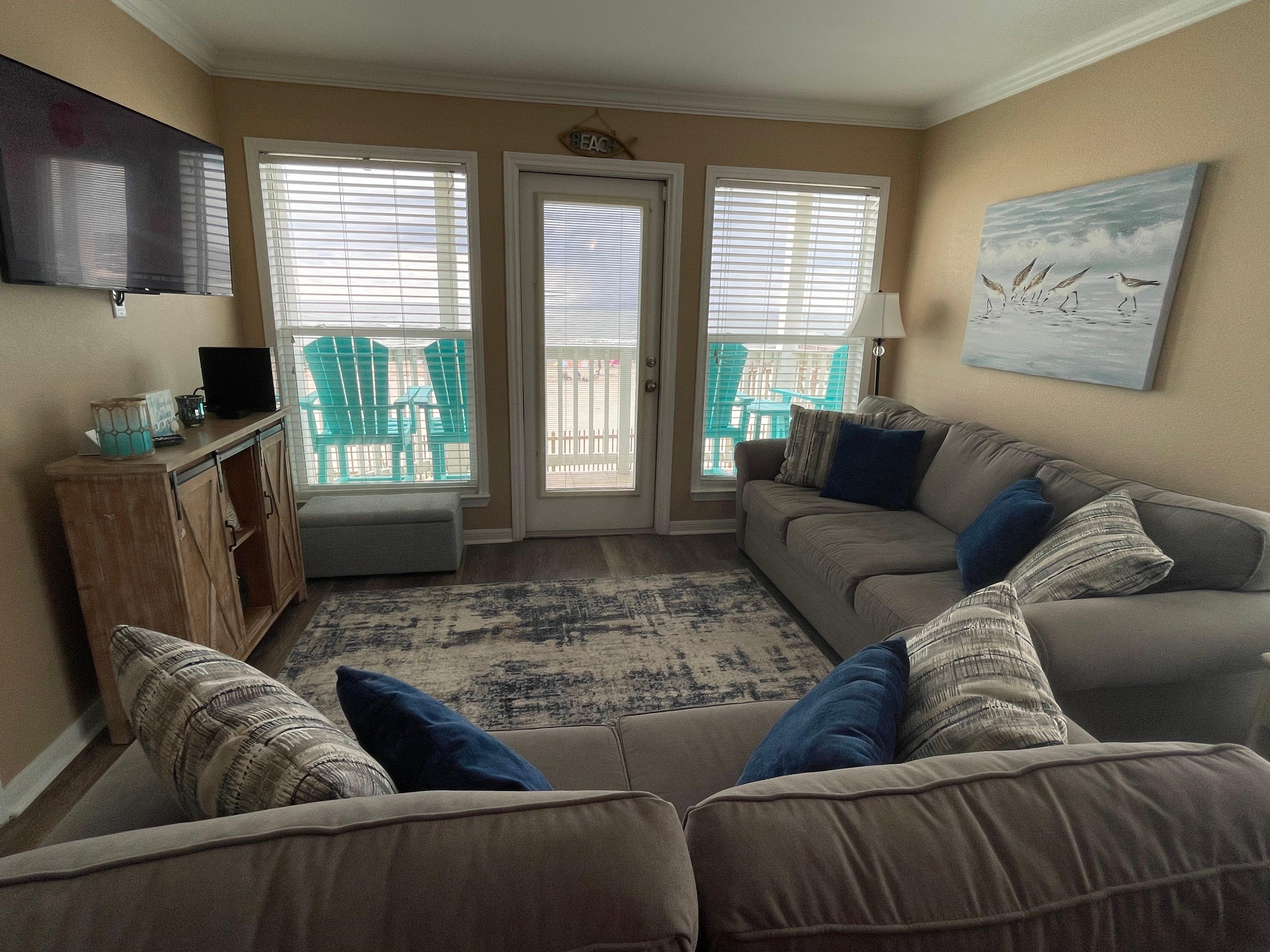 Living Area: Beautifully updated, this suite offers a blend of comfort and style. Sink into the plush sleeper sofa or relax in the cozy cushioned chairs while enjoying a movie night on the flat-screen TV. Step outside on the private balcony and find yourself just a few steps from the sandy shores.