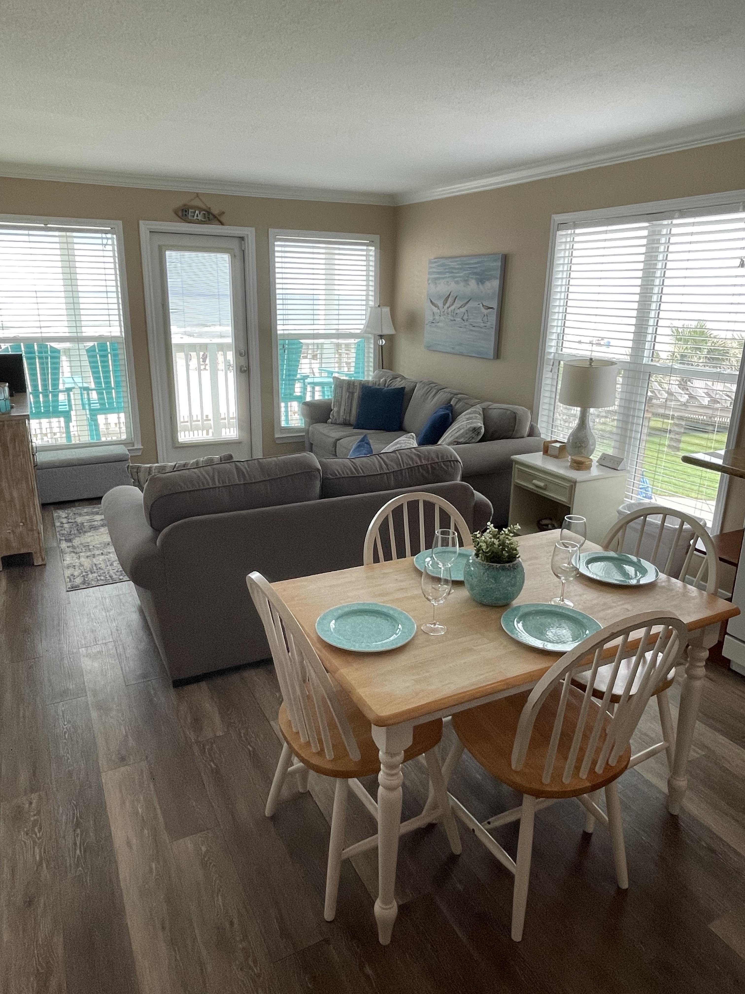 Dining & Kitchen Area: The modern kitchen boasts modern full-sized appliances. Whether you're preparing a family feast or a quick snack, the well-stocked cabinets and handy gadgets have you covered. Gather around the dining table for meals or a lively card game after a sun-soaked day at the beach.