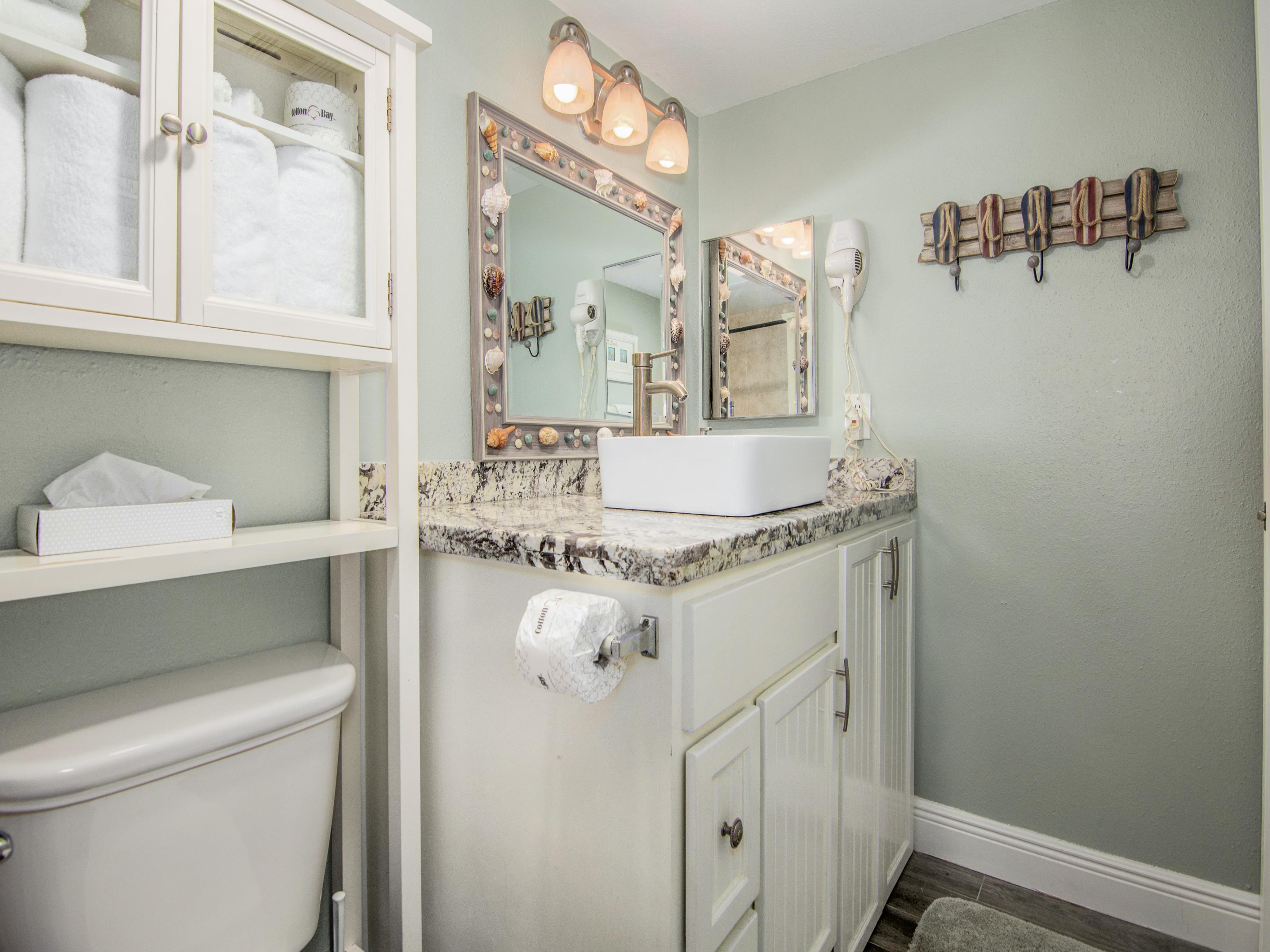 Bathroom: This updated bathroom offers both style and functionality, featuring a spacious vanity with plenty of counter space for all your essentials and a walk-in shower. For added convenience, a compact washer/dryer combo is tucked neatly into the space.