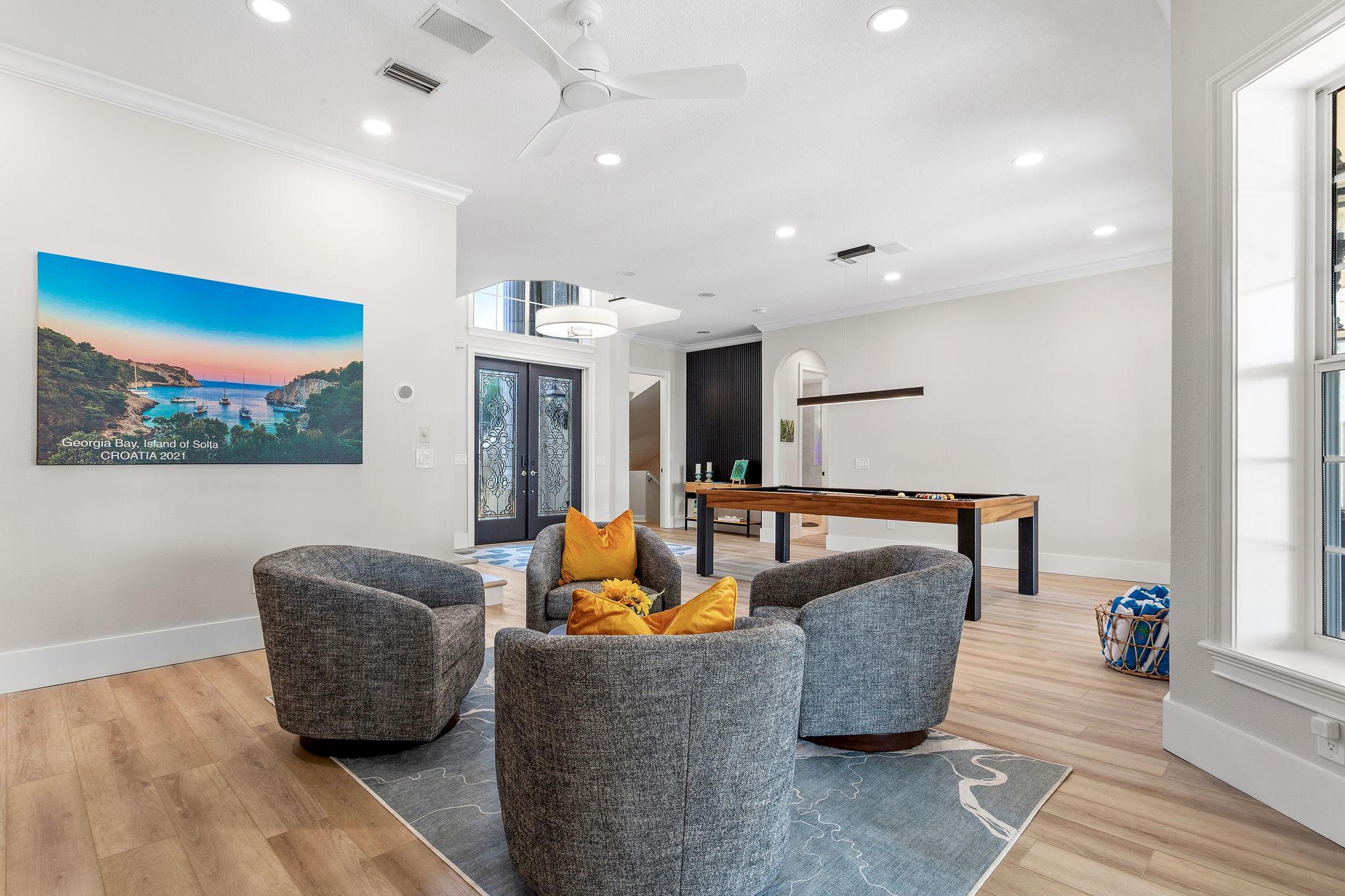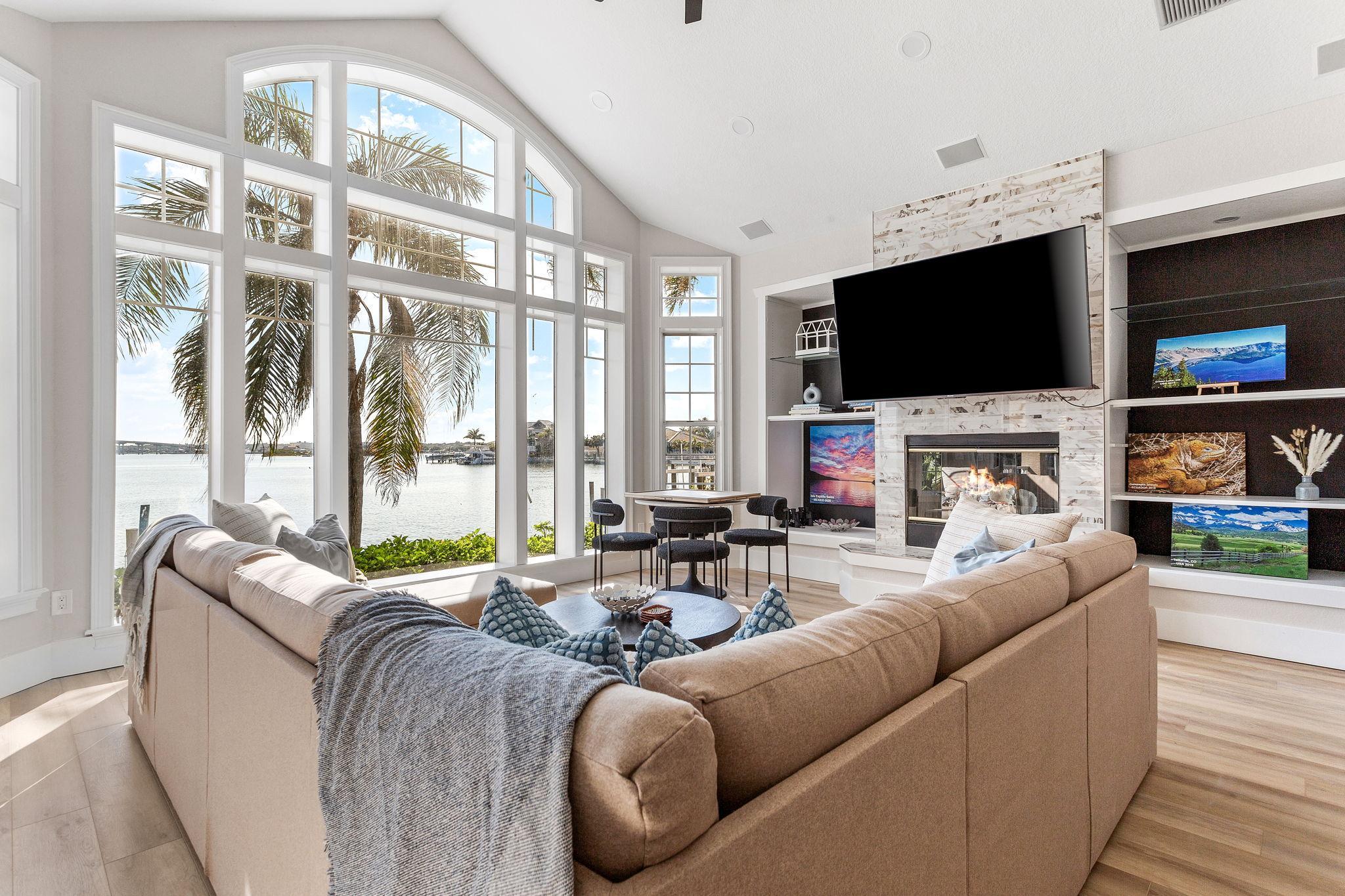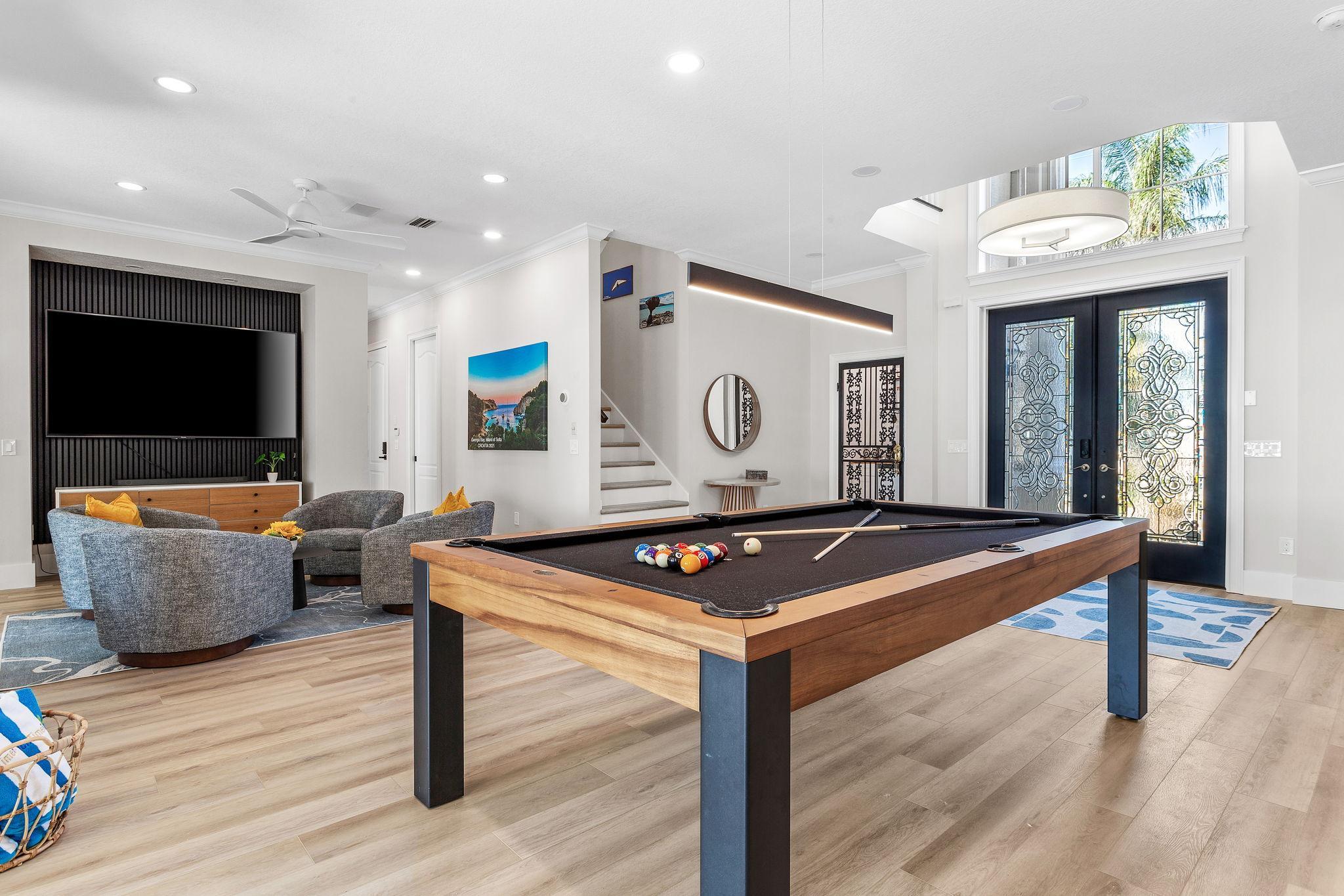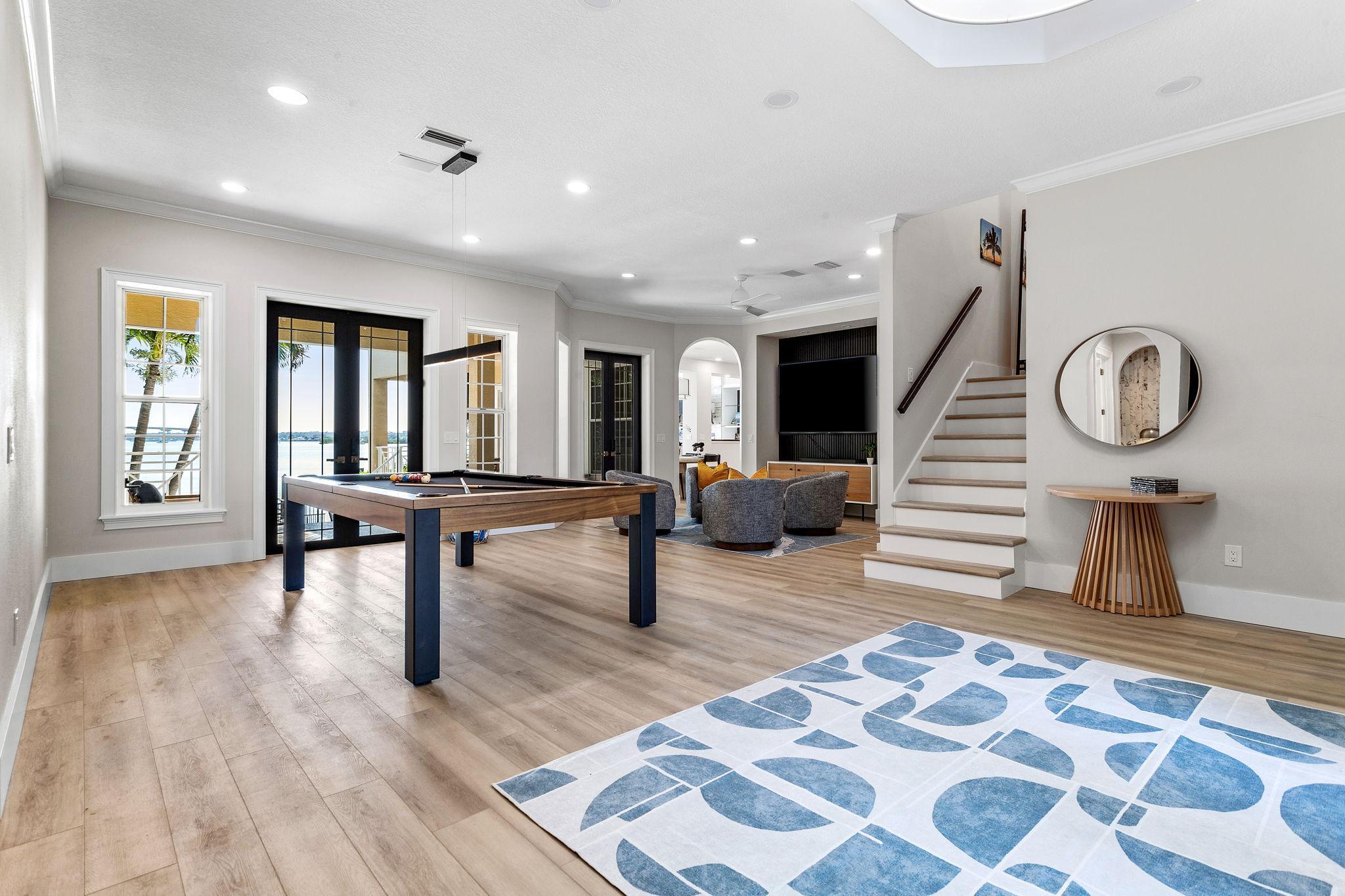 Upon arrival, you enter the first gathering area, with a regulation size pool table and cozy seating area, complete with an 85 in. flat-screen TV set for streaming, gaming or simply relaxing - the ideal spot for family and friends - plus an expansive waterfront view for sunrise or the colors at sunset.
