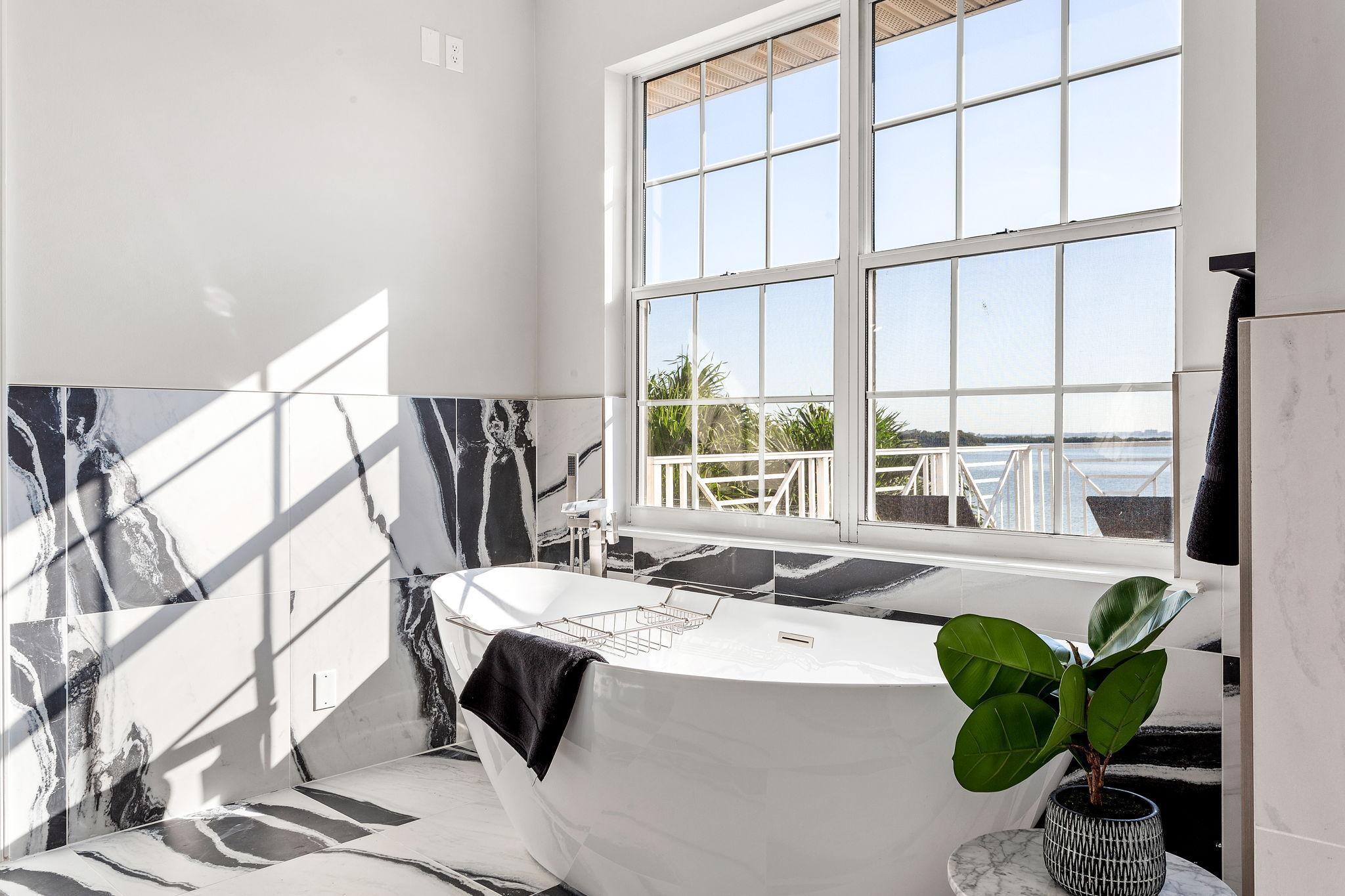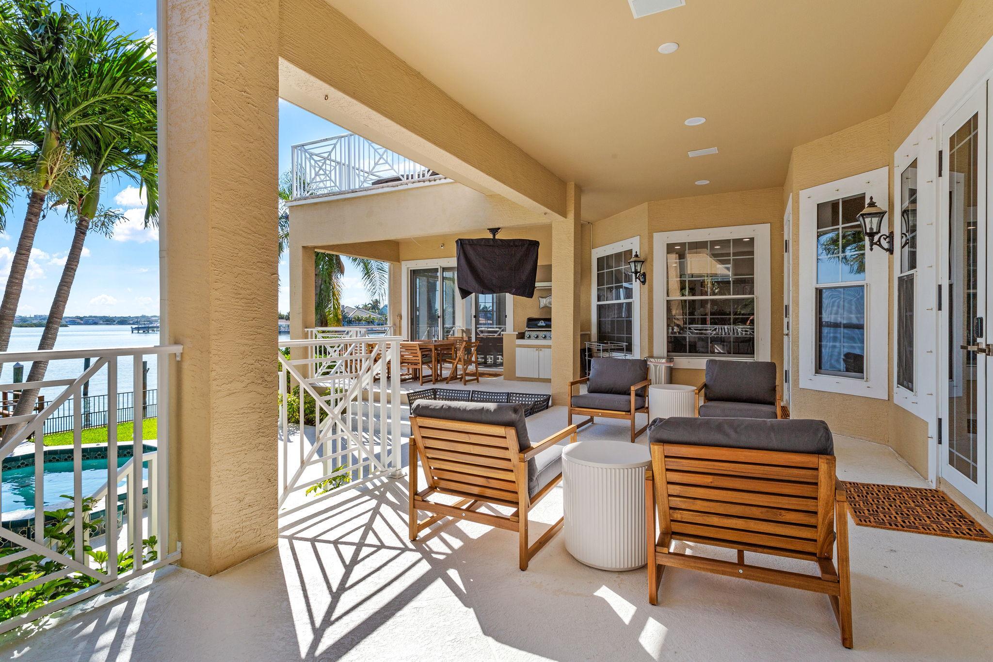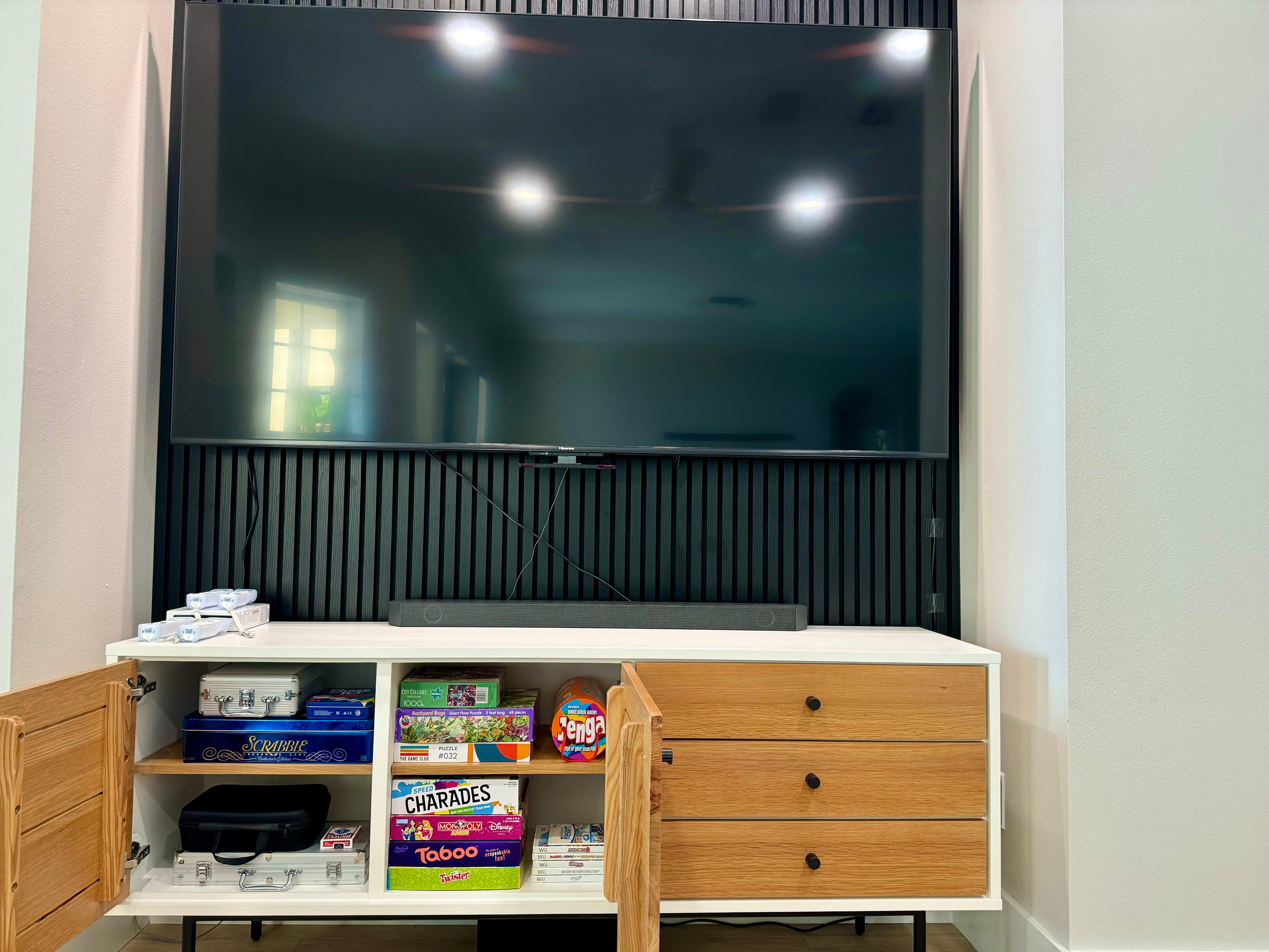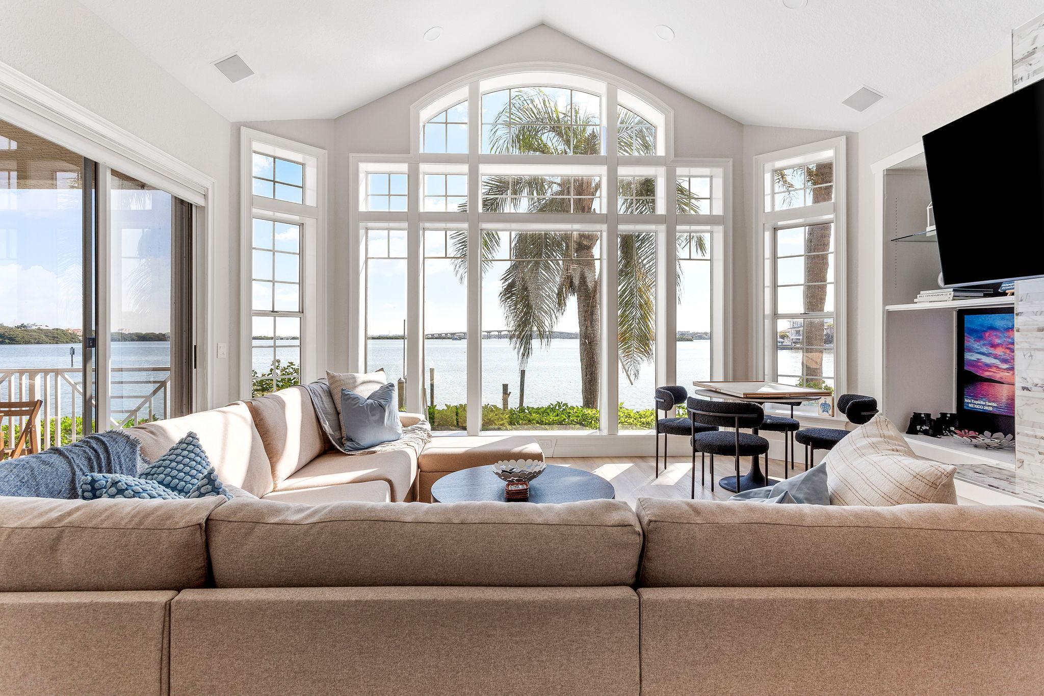 Upon arrival, you enter the first gathering area, with a regulation size pool table and cozy seating area, complete with an 85 in. flat-screen TV set for streaming, gaming or simply relaxing - the ideal spot for family and friends - plus an expansive waterfront view for sunrise or the colors at sunset.