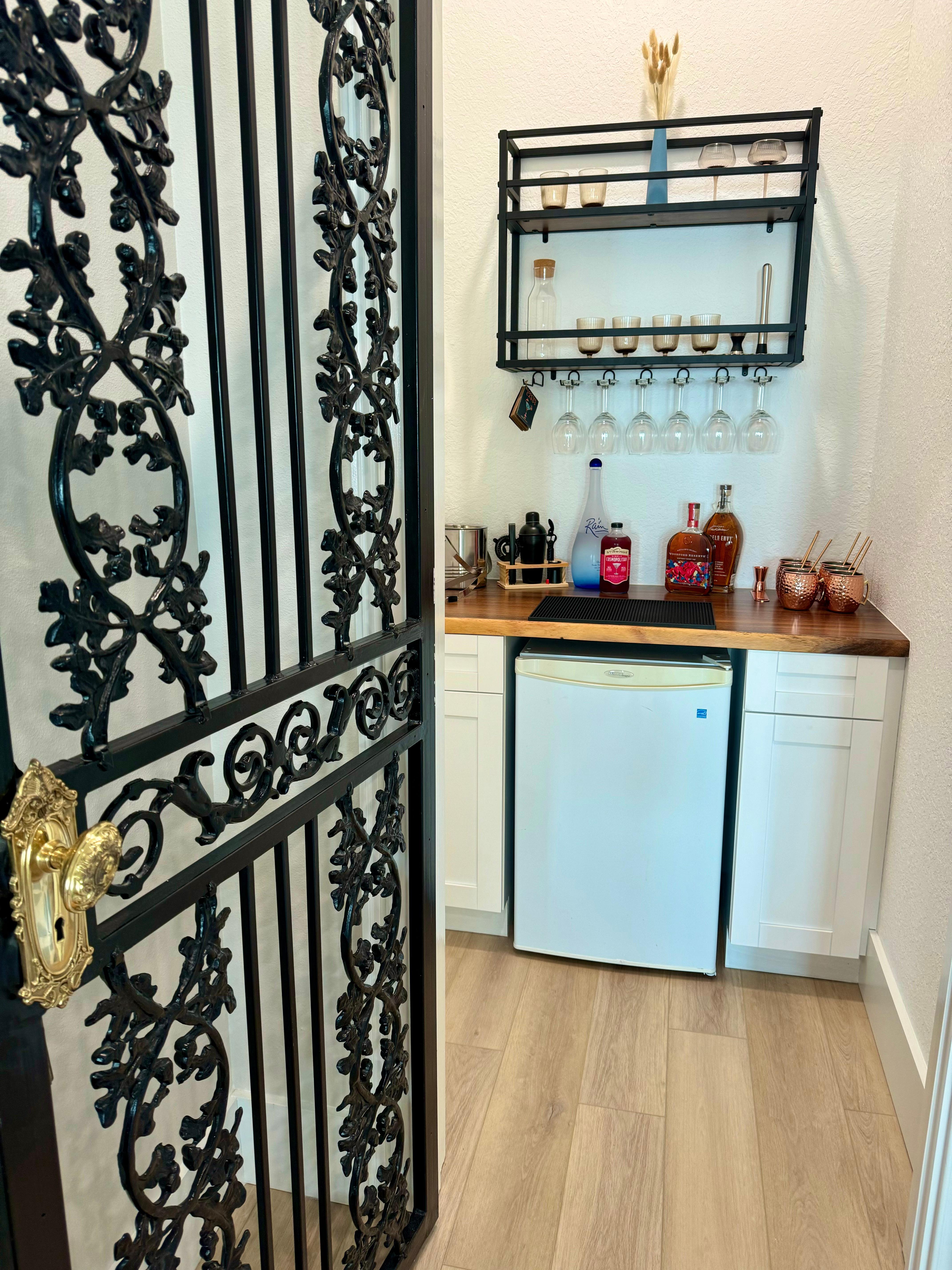 Also conveniently located on this floor is the laundry room, another well appointed 'speakeasy' wet bar with black wrought iron gate, a half bath, and access to the large garage - 1 space for parking, with 3 more on the driveway - with plenty of sports and water sports toys waiting!