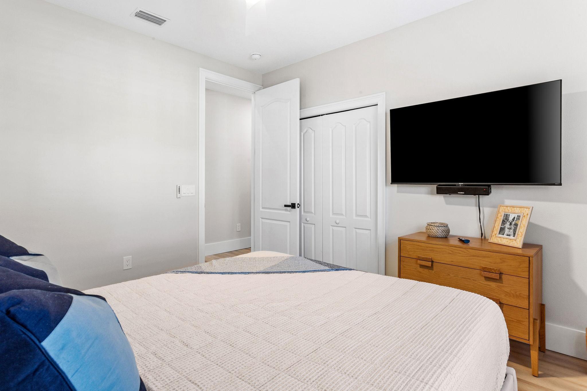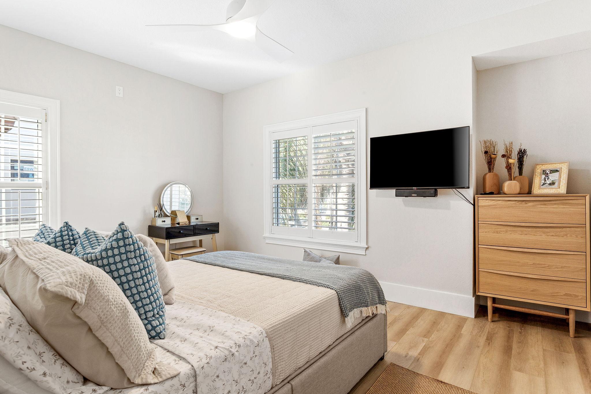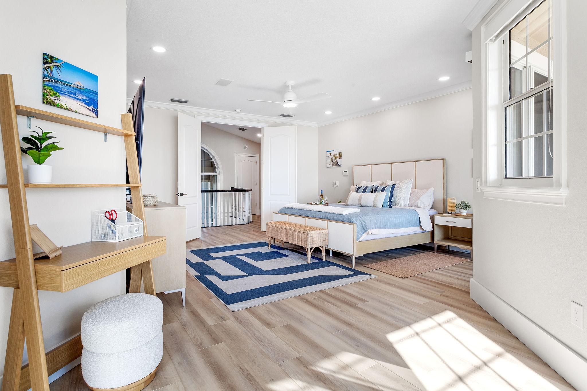 The first floor bedroom with twin bed and trundle, doubles as THE best office space, overlooking the bay with floor to ceiling windows and double door opening to the patio. A full bath and shower is adjacent. The exercise room with padded flooring, bike, bench, weights, bands, TRX-style ropes, yoga mat, ball and connectable tv allow your workouts to continue.
