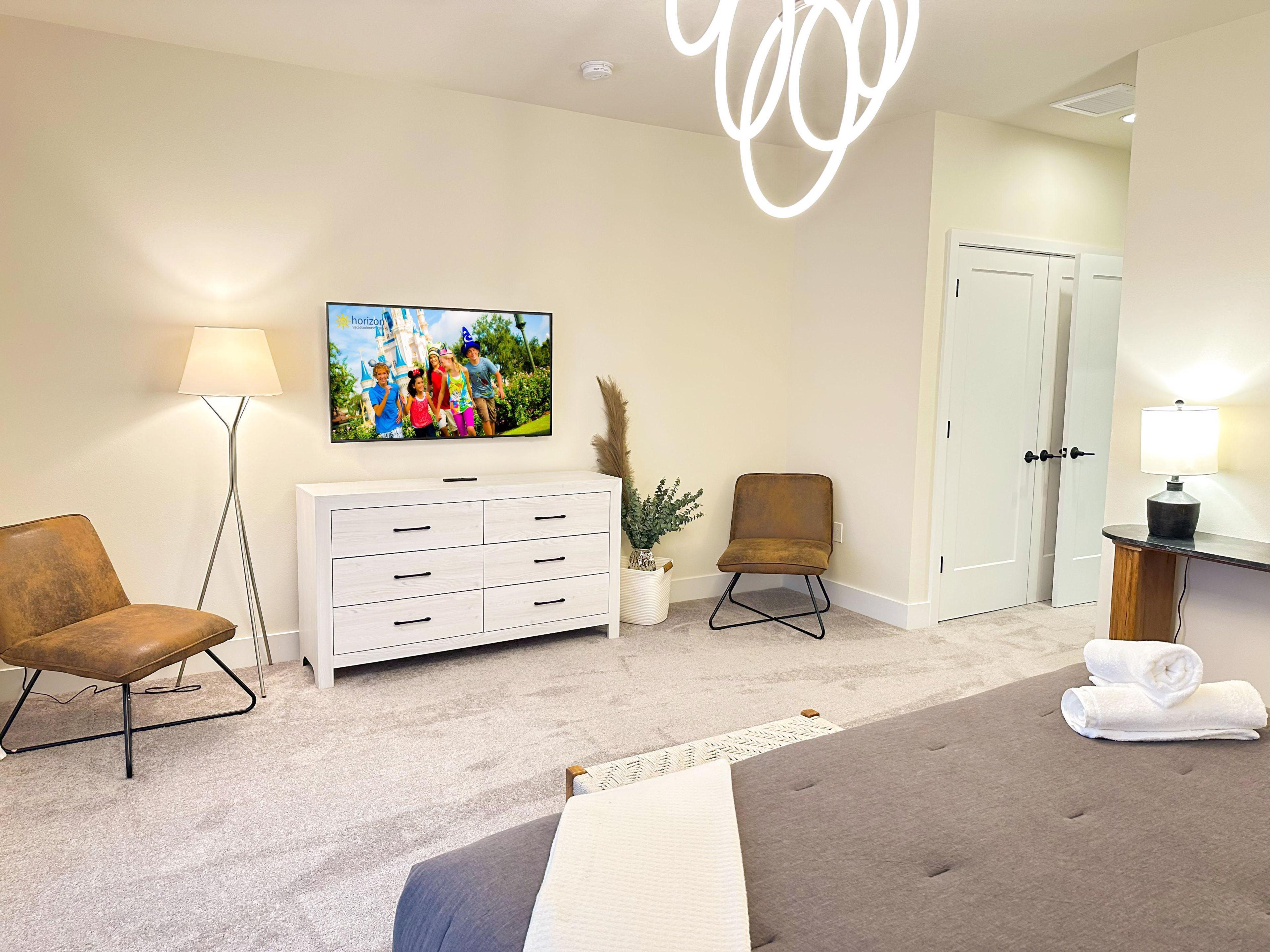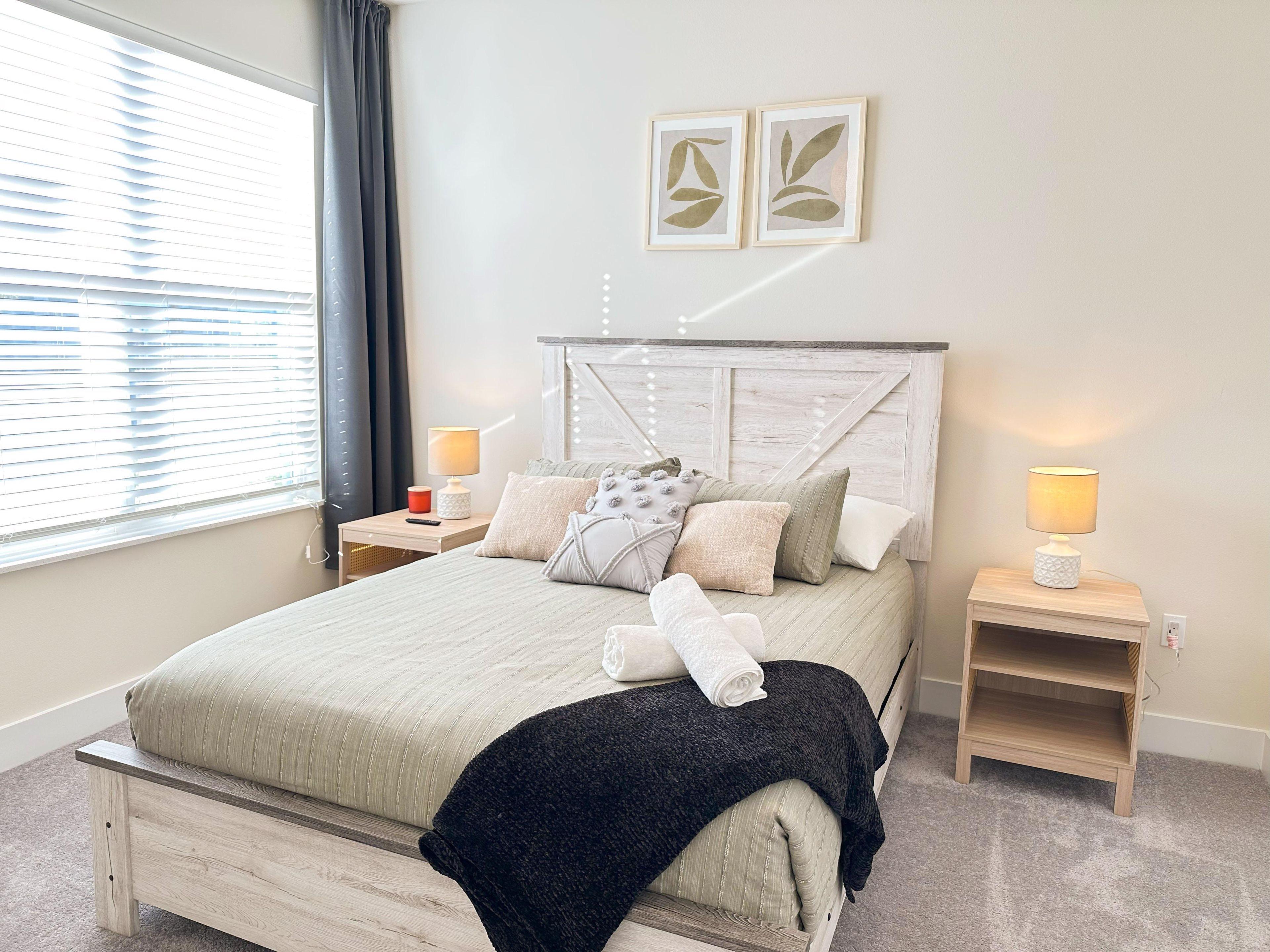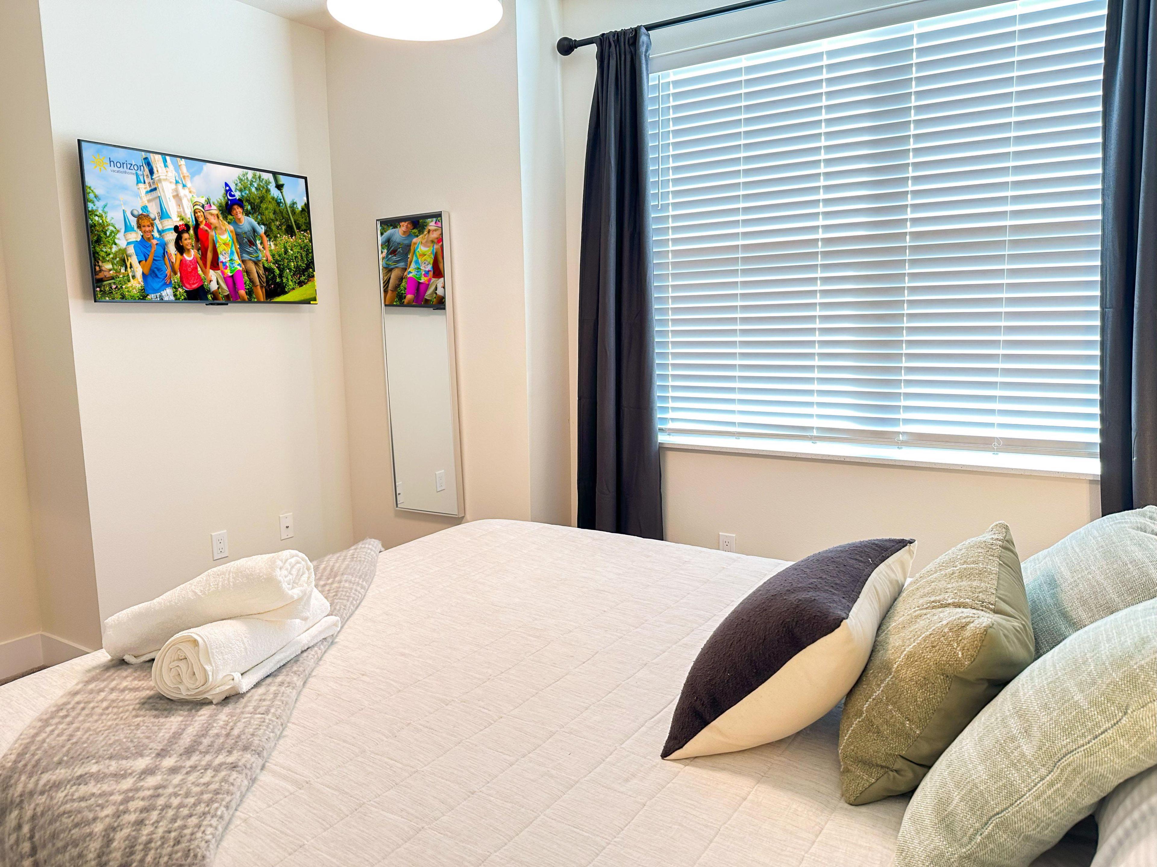 Imagine living in a new subdivision surrounded by a huge conservation area, but being close to all major attractions that Orlando has to offer. This is exactly what you get when booking this brand new home. It just got built and furnished by a professional interior design company. Open the door and enjoy the open floorplan. The first bedroom is located downstairs and has a queen size bed and attached bathroom with a shower tub.