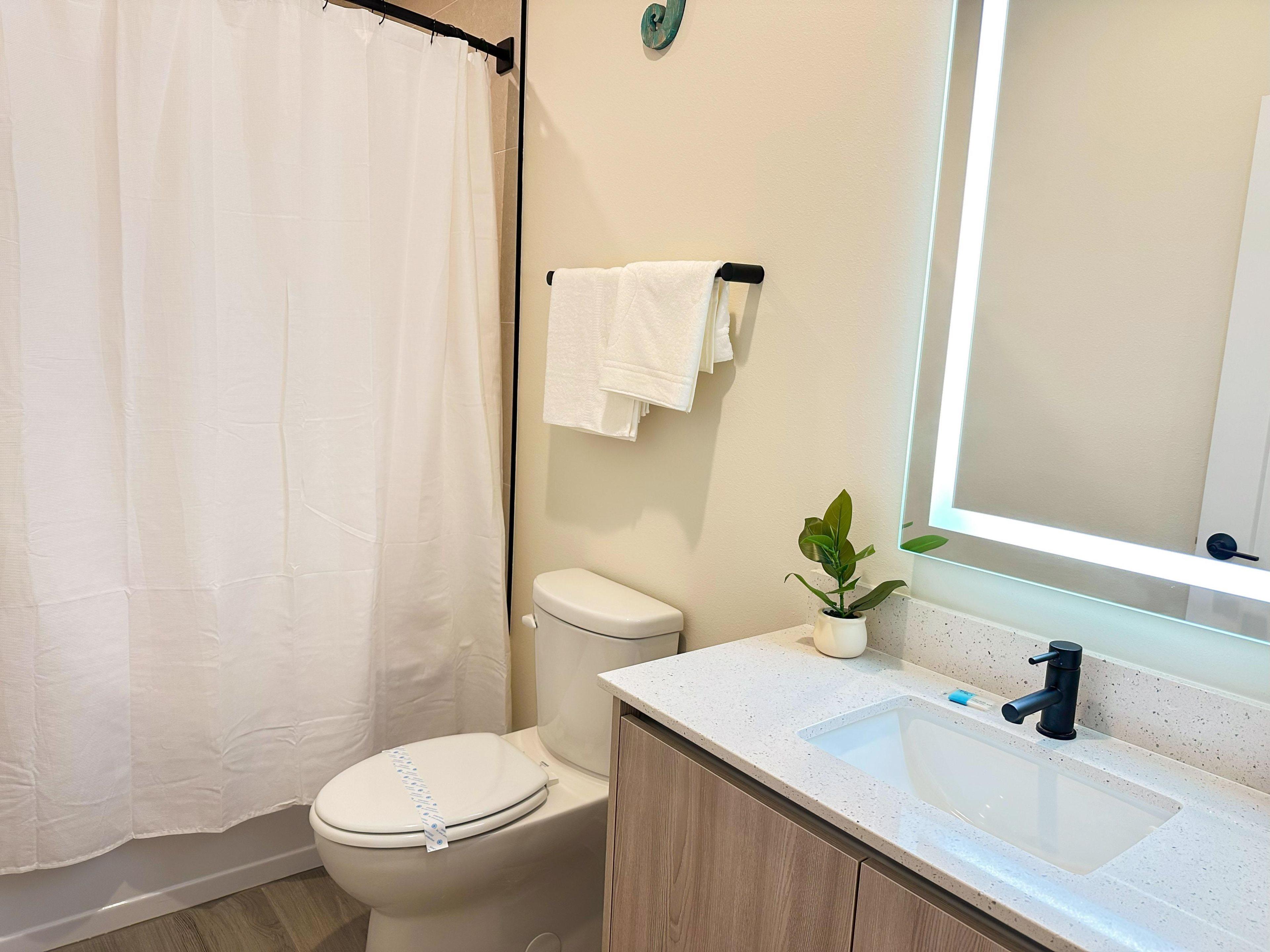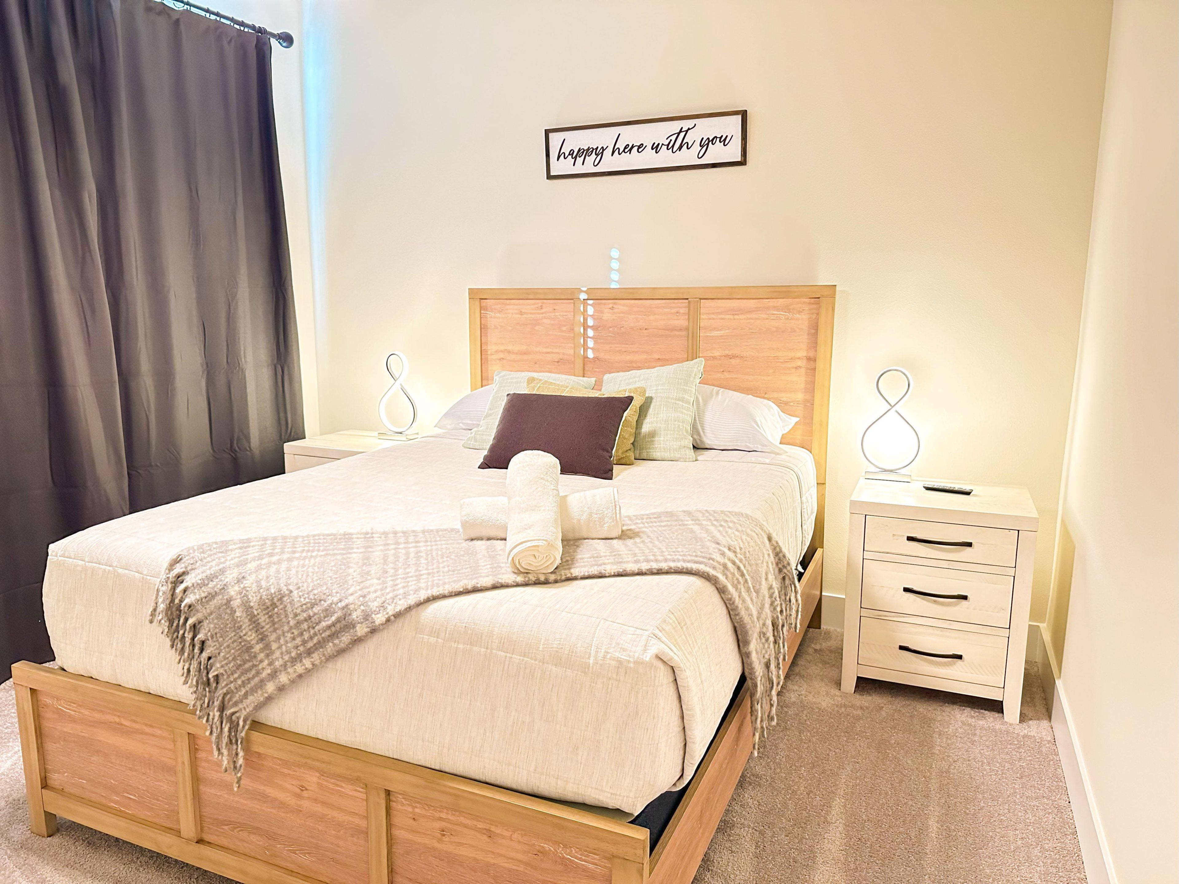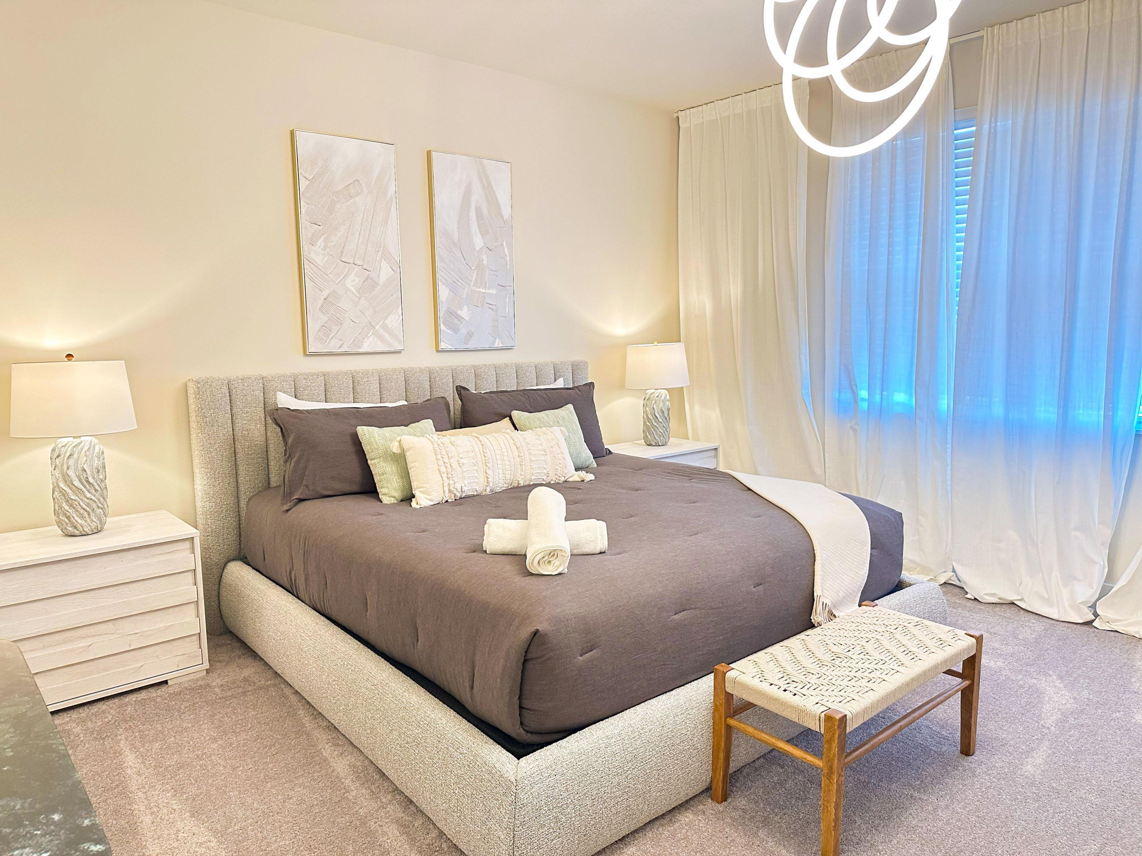 Imagine living in a new subdivision surrounded by a huge conservation area, but being close to all major attractions that Orlando has to offer. This is exactly what you get when booking this brand new home. It just got built and furnished by a professional interior design company. Open the door and enjoy the open floorplan. The first bedroom is located downstairs and has a queen size bed and attached bathroom with a shower tub.