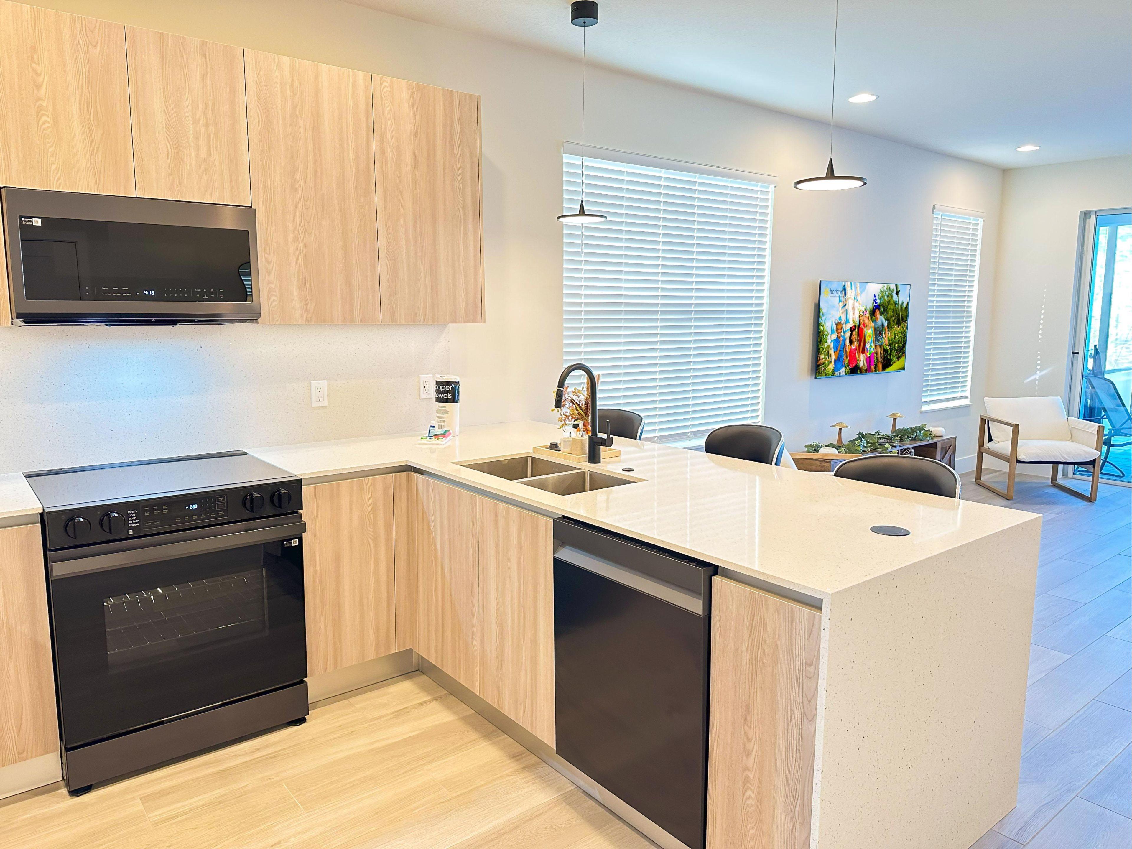The kitchen is fully open and has a view on the living room and on the pool. It is fully equipped with pots and pans. With silverware, dishware... There is also a dishwasher, stove, fridge, microwave, toaster, coffee maker... The living room and dining room offer comfortable space for up to 8 guests. Kids and adults will LOVE the private splash pool. Upstairs, there is a den with a couch and a TV. The second bedroom is the primary bedroom and has a king size bed and an ensuite bathroom with double-vanities and a private shower tub. The third bedroom has bunk beds (twin over twin. All bedrooms have TV's. There is also a washer and dryer inside our home. IF you are planning on playing golf, you will have plenty of choices around the house: Legends, Reunion, Championsgate golf courses are a short drive. And the theme parks are also easy to reach: 17-20 min drive (Disney) only (depending on the park you will visit and the route you will take of course). Do not wait, this property is a gem. You will LOVE it for sure. Magical memories guaranteed.