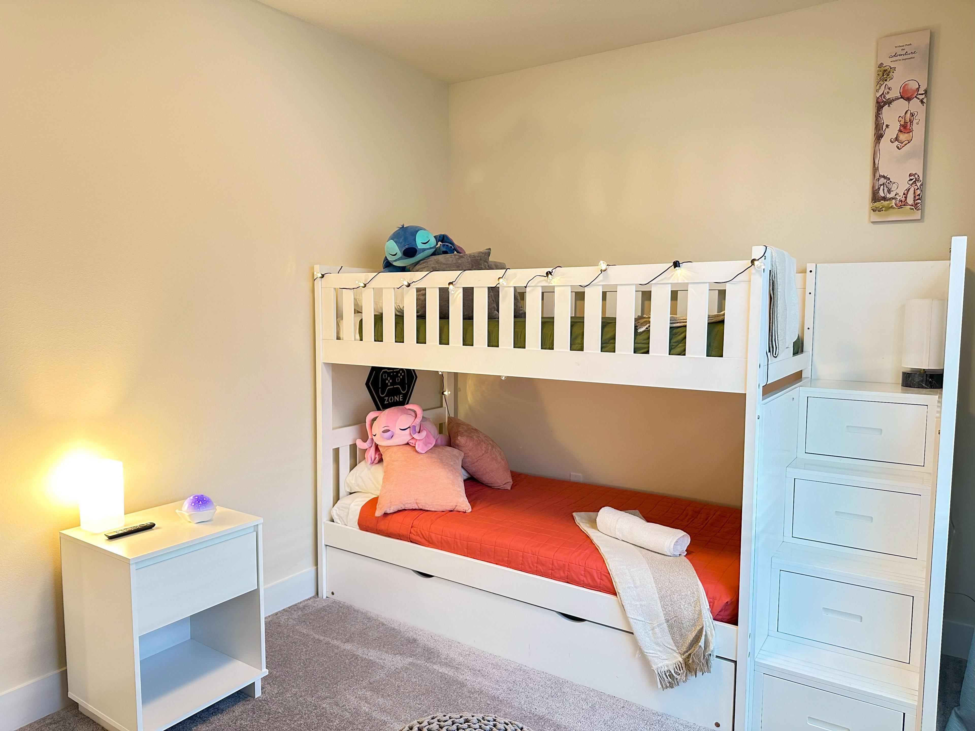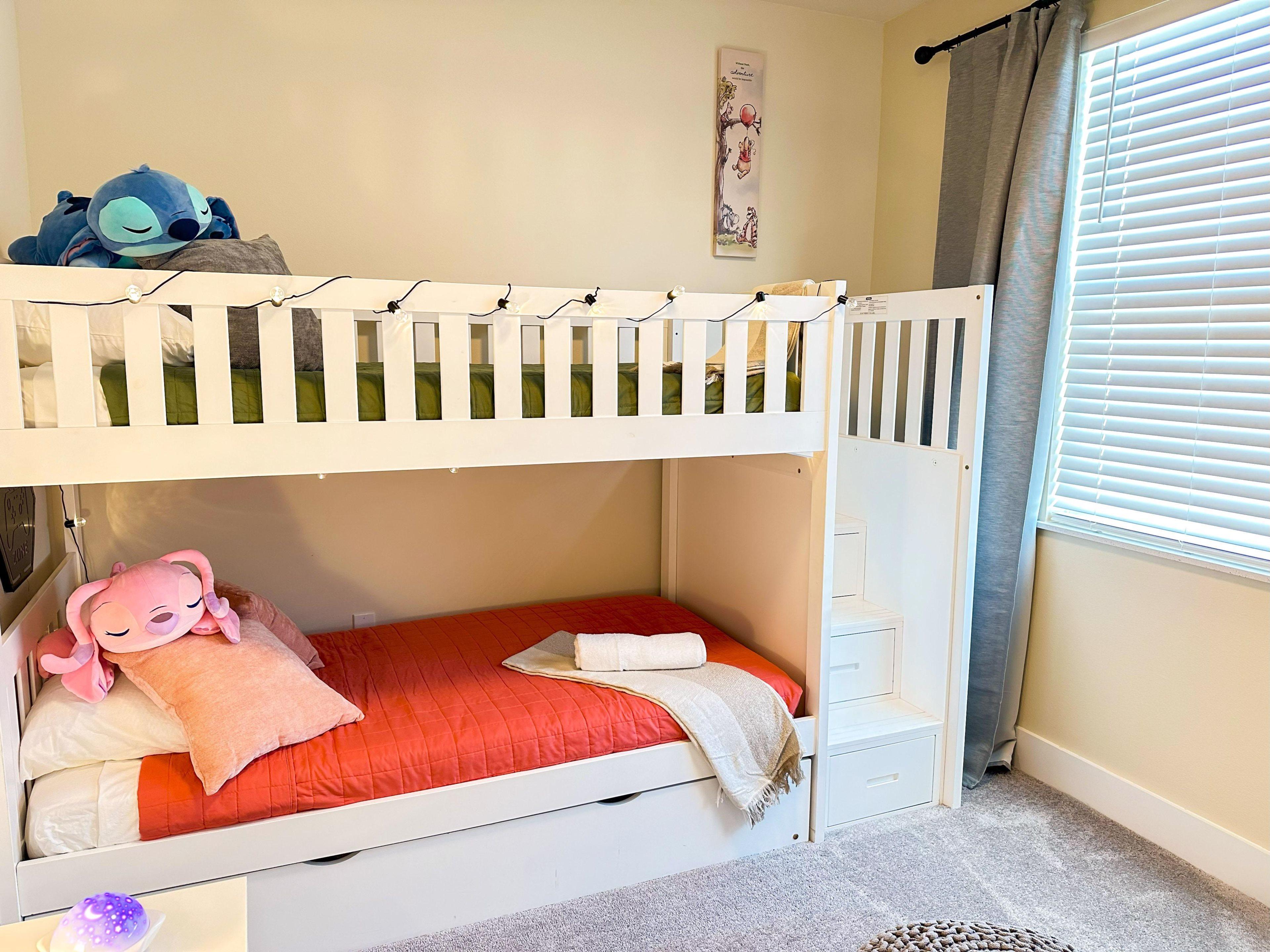 The layout offers both comfort and style. On the main floor, you’ll find a queen bedroom with an ensuite bathroom (shower), along with a fully equipped kitchen stocked with a dishwasher, stove, microwave, refrigerator, coffee maker, and all the essentials for cooking and dining. The open-plan living and dining areas are spacious and tastefully decorated, offering tranquil views of the pool area with no rear neighbors for added privacy. Upstairs, there are three additional bedrooms: a luxurious master suite with a king bed and ensuite (shower), a second queen bedroom, and a third bedroom featuring full-over-twin bunk beds and an ensuite with a bathtub.