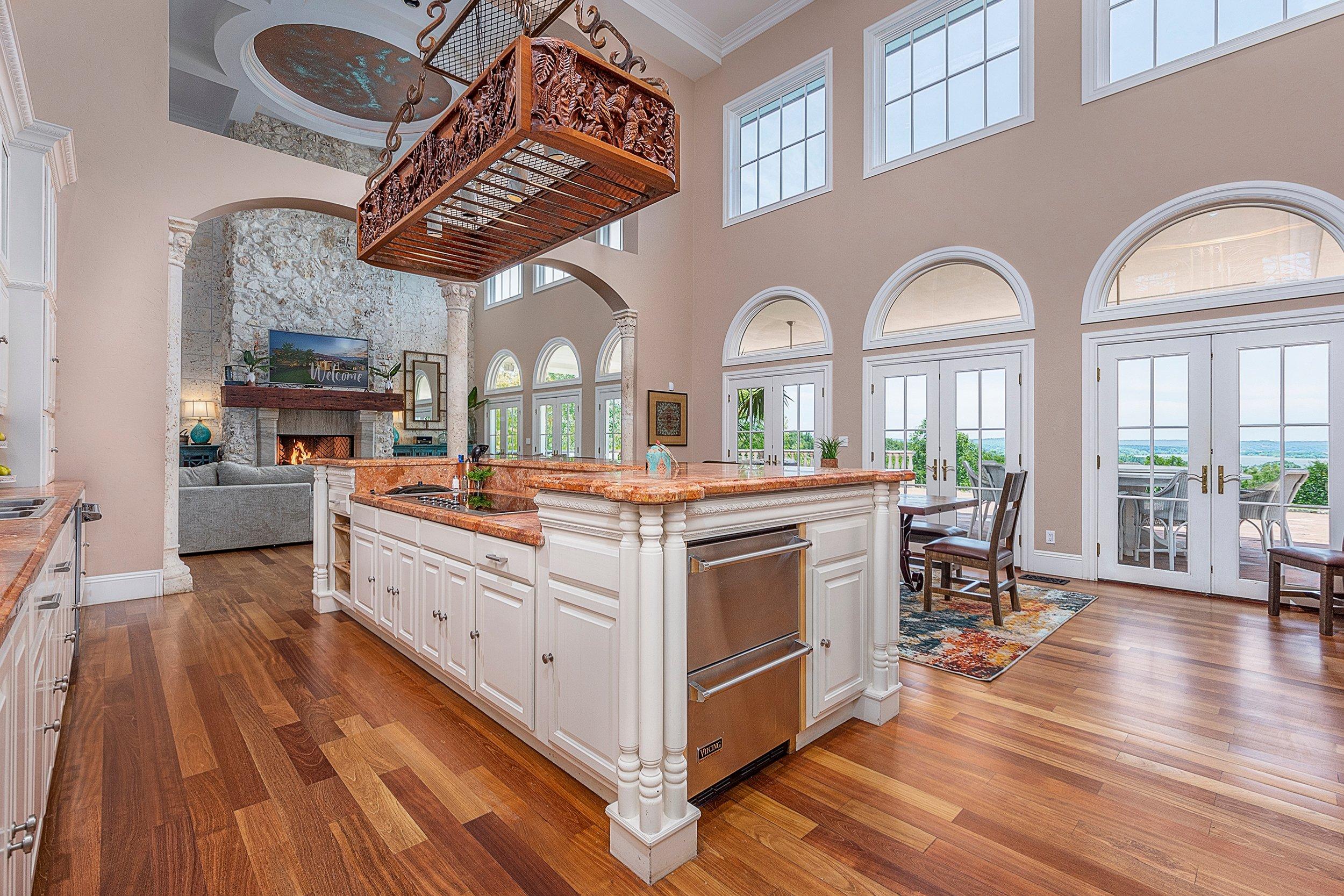 The moment you walk up to the home you will be greeted by two massive custom Balinese style entry doors. As you enter the home, you will find an abundance of natural light that creates a peaceful environment ideal for any holiday relaxation. Immediately to your left, you will be welcomed by a large solid travertine stone curved staircase, 25 ft ceilings, a coral stone water feature, Brazilian Cherry Hardwood floors with an exquisite dining room with seating for twelve that would rival the fanciest restaurant dining table and chairs you have ever seen. Make your way past the main foyer and find the enormous living area graced with a floor to ceiling Floridian Coral stone gas fireplace and super-comfy furniture that will make you not ever want to leave!