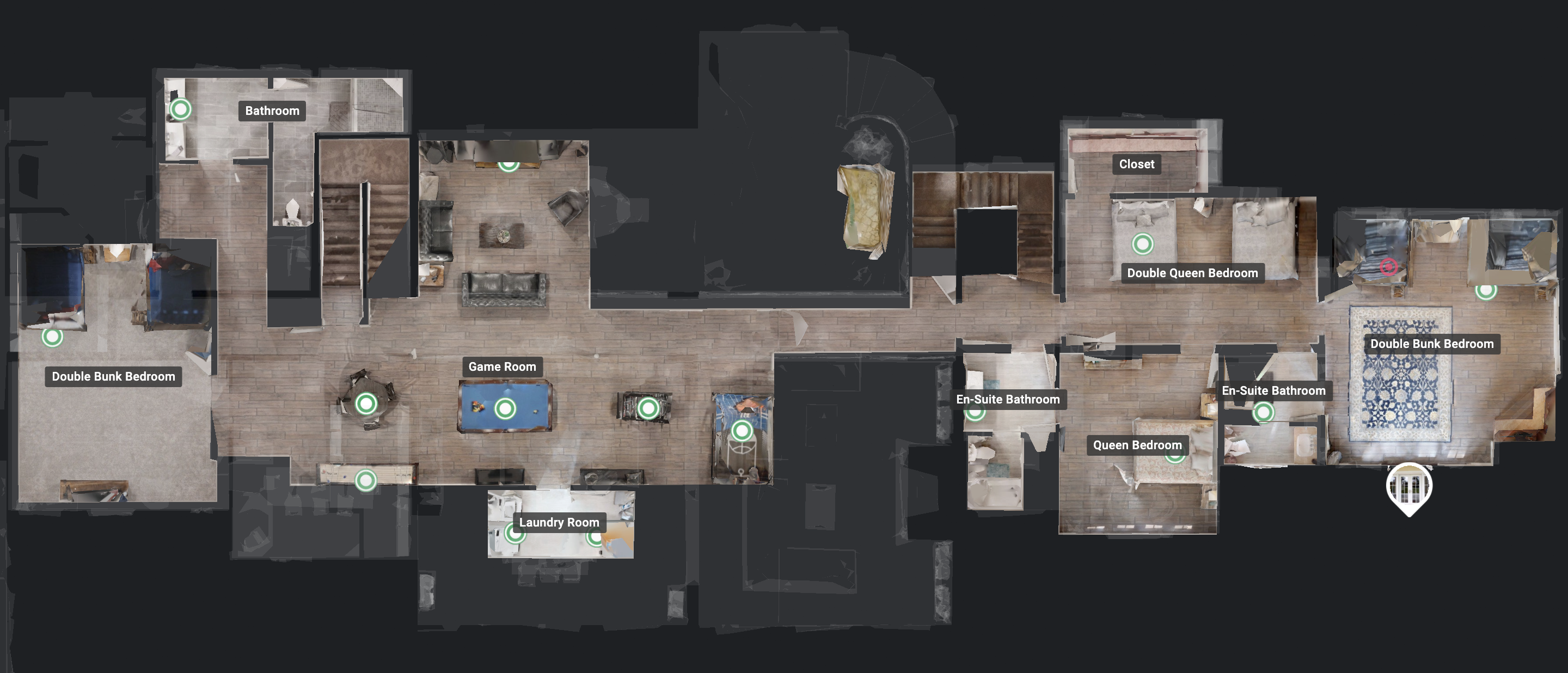 The Bella Vista has 10 Bedrooms and 9 1/2 Bathrooms. There are two extremely spacious master suites on the south wing with private verandas and great views of Table Rock Lake. There are two other spacious masters on the north wing, one with a King size bed and the other a queen. The basement has two massive bunk rooms that will sleep 8 in each room. There are two other queen size bedrooms in the newly remodeled downstairs area.