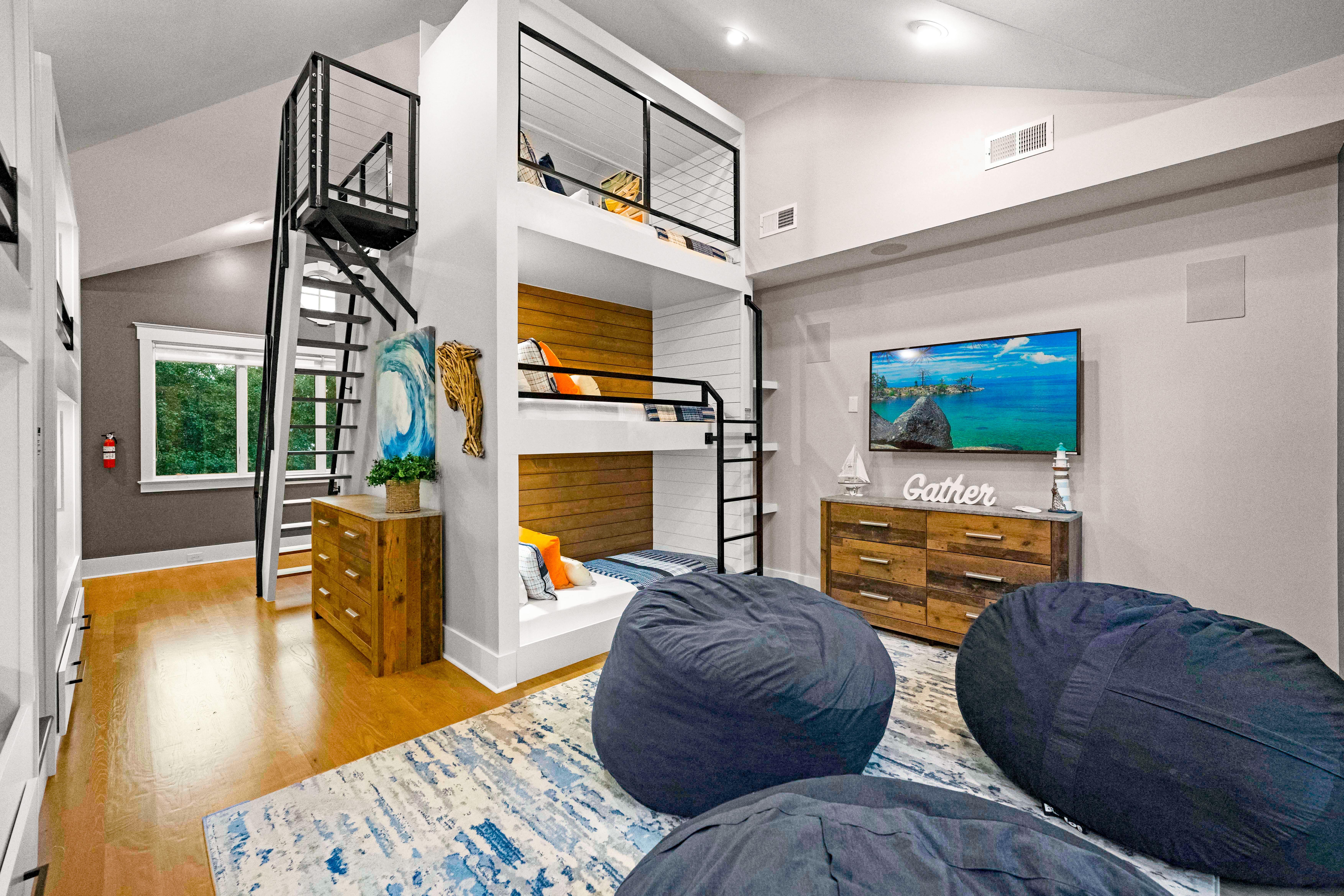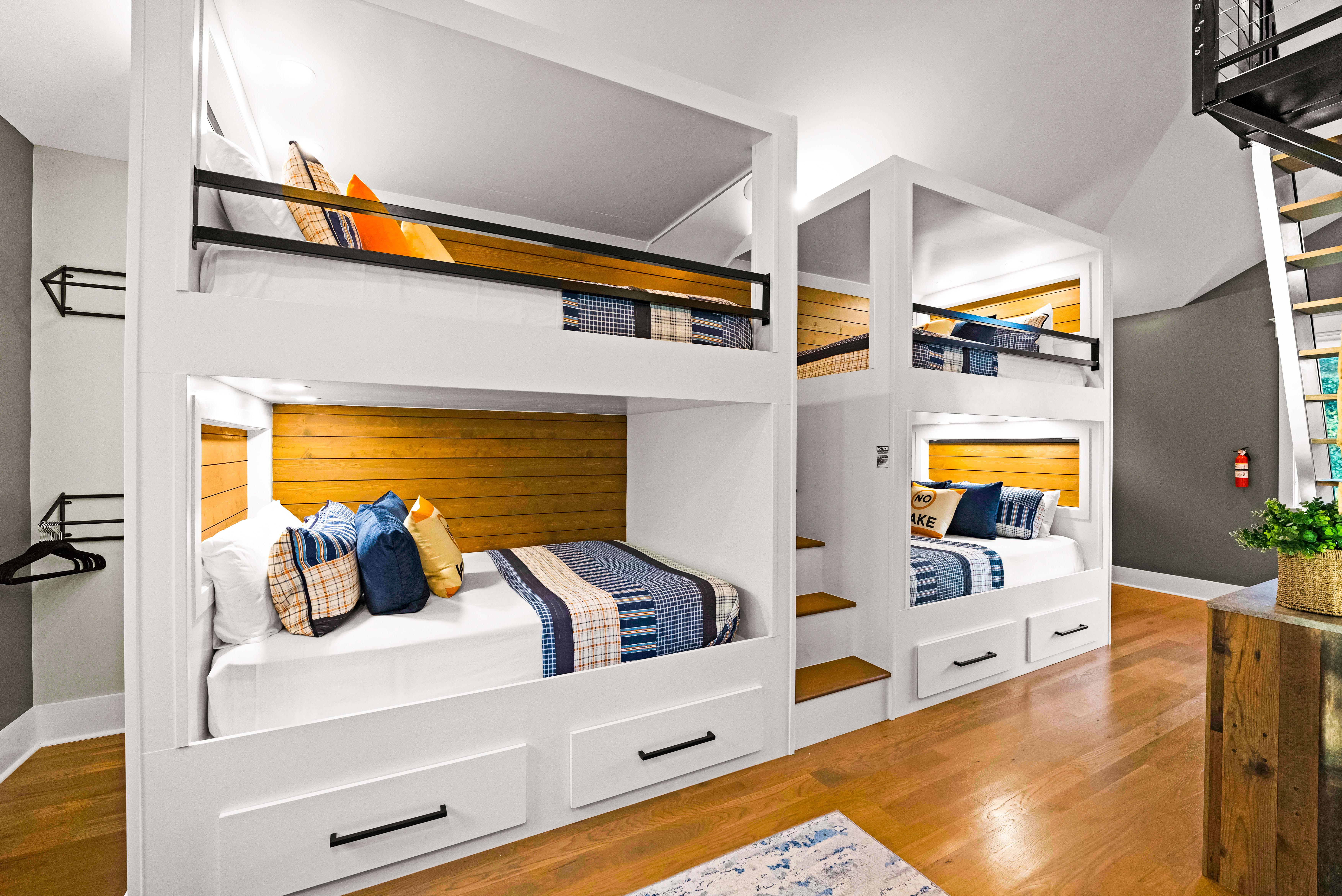 * Upper level bunk room with 2 queen bunk beds and a tri-level twin bunk (7 beds total) with lake view, balcony, mini-fridge and sink area, and hallway bathroom